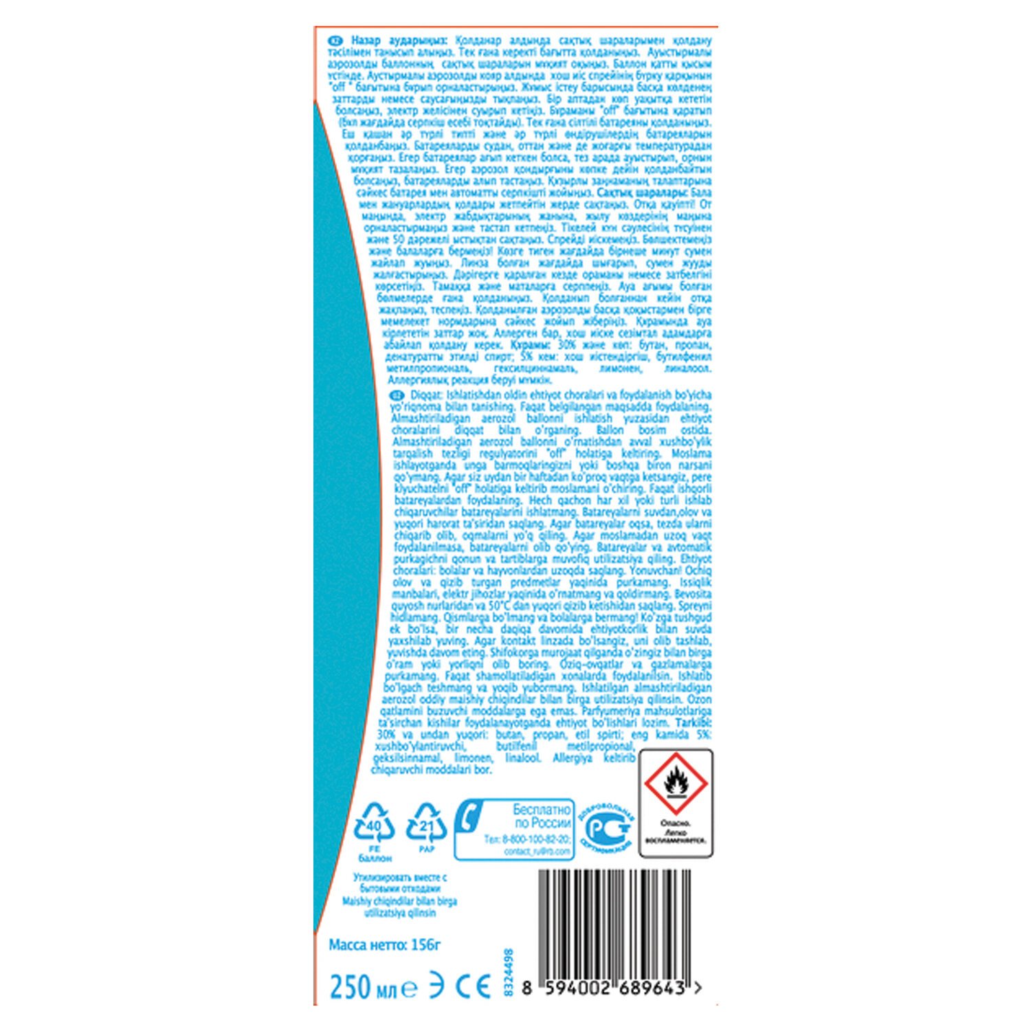 Способ применения: прочитать внимательно этикетку перед использованием и сохранить ее на весь период использования продукта. Вставить баллон в выключенный автоматический распылитель. Всегда направлять струю аэрозоля от лица. Включить – распыление начнется через 15 секунд.
