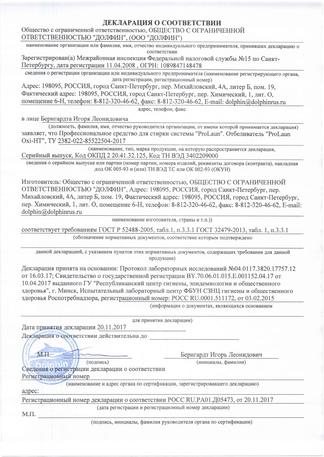 Dolphin ProLaun Oxi-HT - кислотный концентрированный высокотемпературный кислородный отбеливатель для профессиональных стиральных машин с использованием специального настраиваемого дозирующего оборудования.