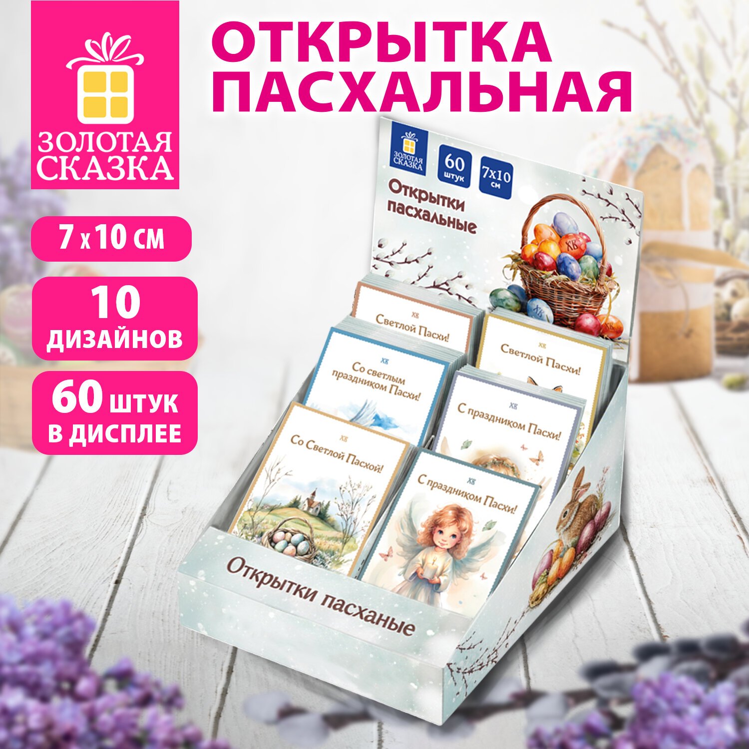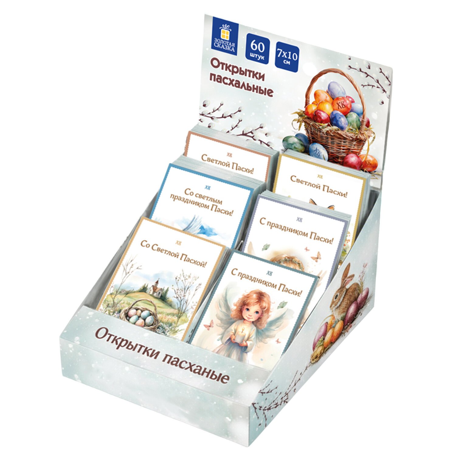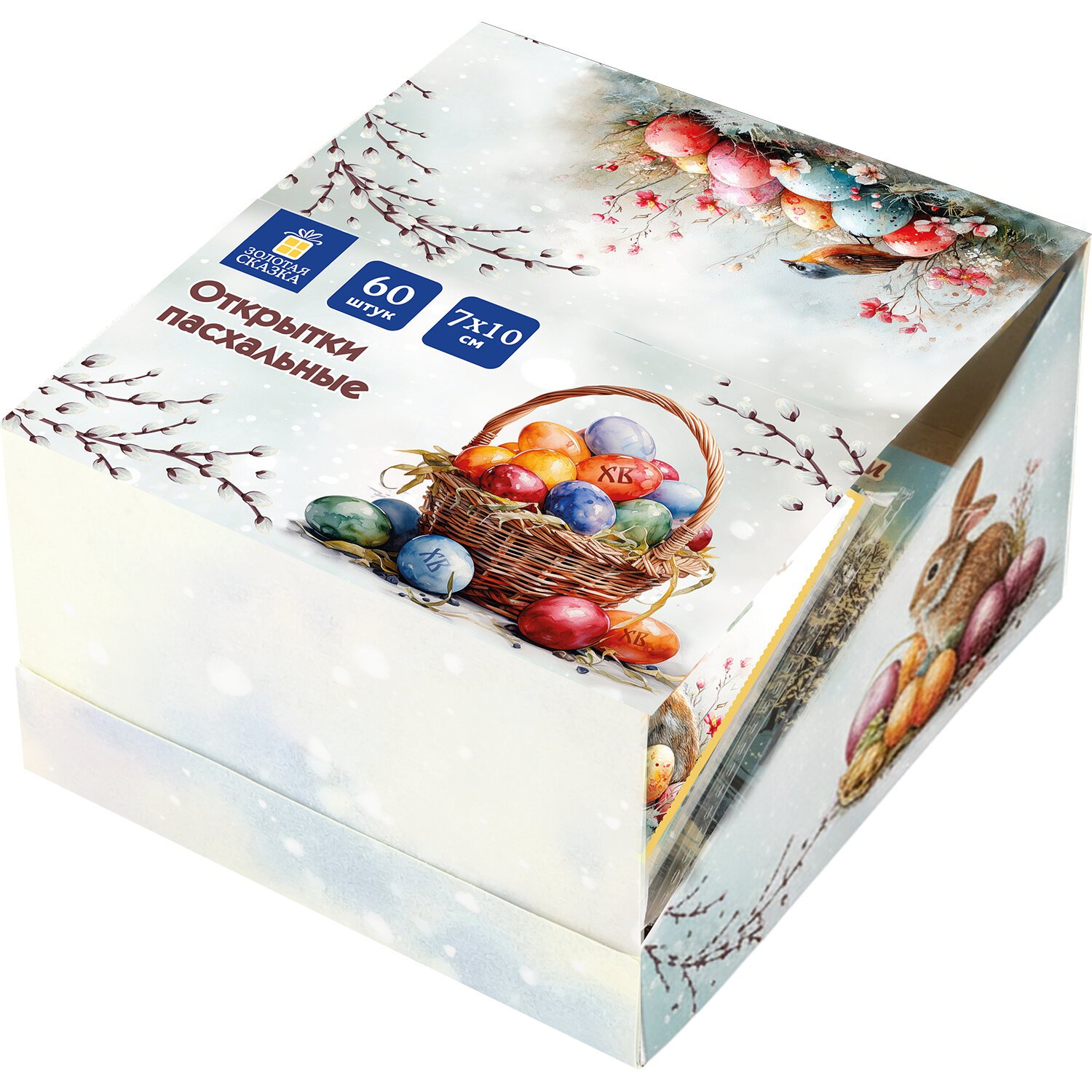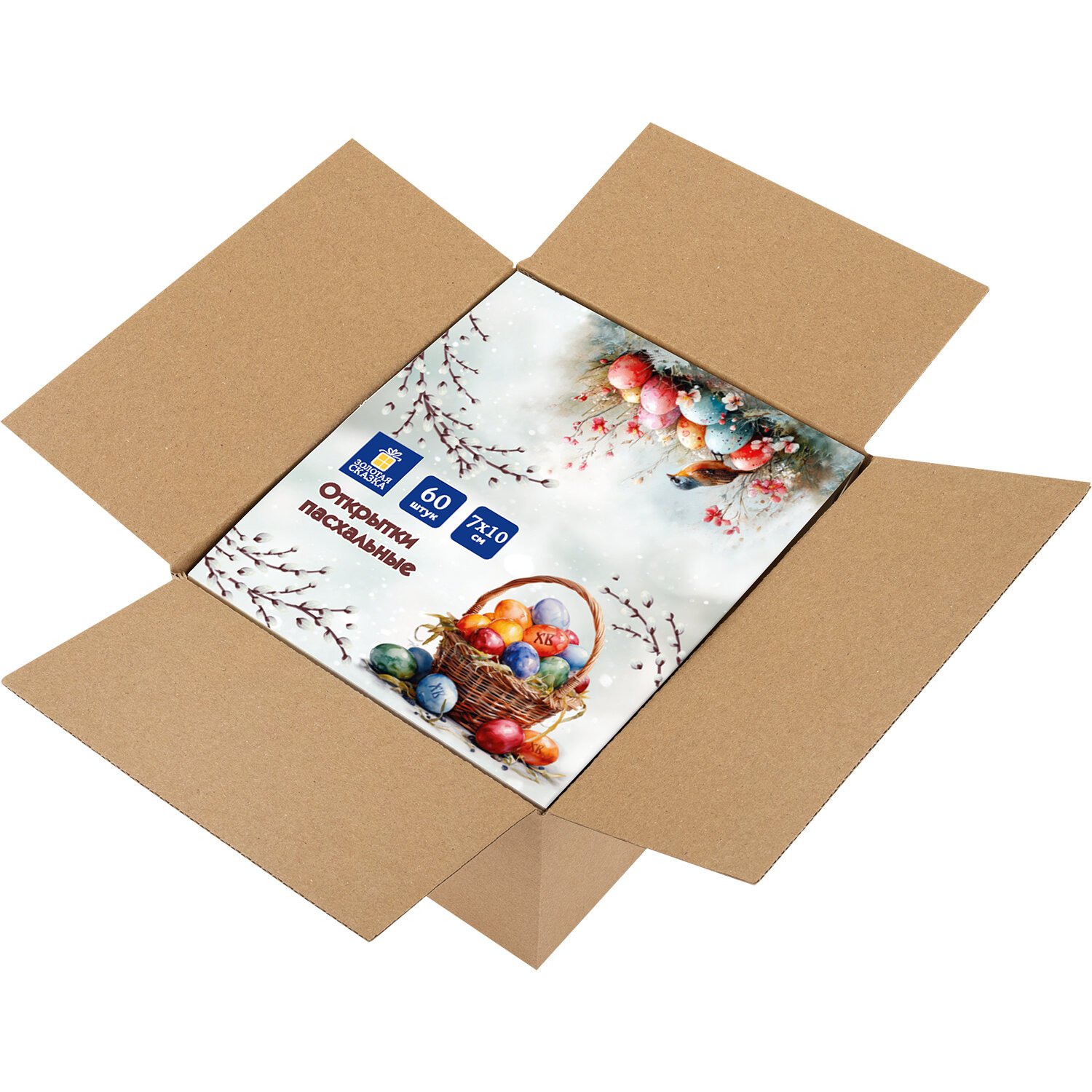Открытки поставляются в 10 уникальных дизайнах - с изображением пасхальных яиц, цыплят, кроликов, куличами, ангелочков, цветочных мотивов и нежных весенних узоров (без возможности выбора).