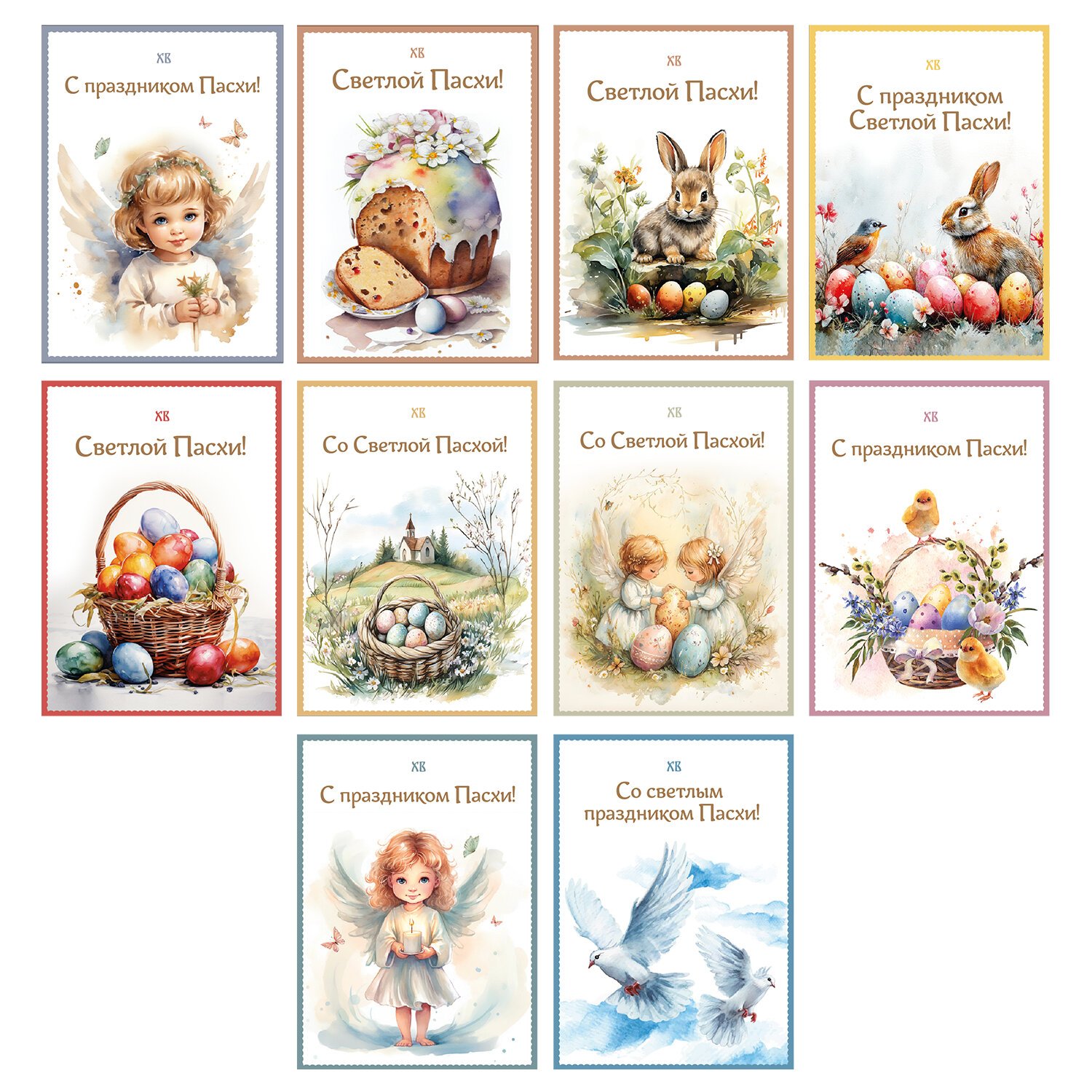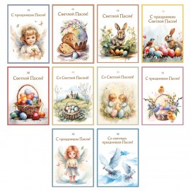 В наборе представлено 10 уникальных дизайнов - с пасхальными яйцами, цыплятами, кроликами, куличами, ангелочками, цветочными мотивами и нежными весенними узорами (по 3 штуки каждого дизайна).