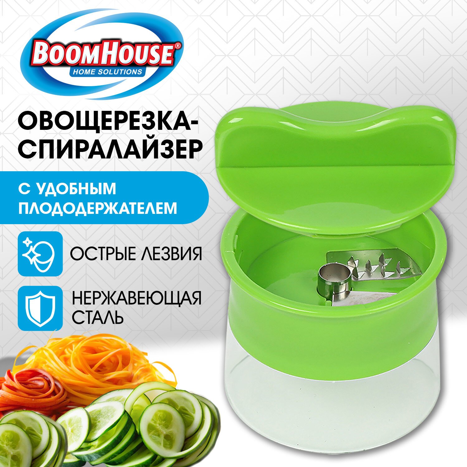 Овощерезка-спиралайзер BOOMHOUSE - ваша надежная помощница на кухне. Благодаря острым лезвиям и прочной конструкции она сделает приготовление блюд не только максимально простым и комфортным, но и увлекательным.