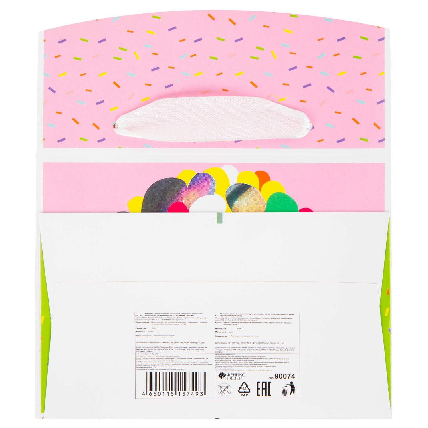 Пакет-коробка изготовлен из мелованной бумаги с ламинацией, плотность бумаги – 190 г/м2. Для удобства переноски имеются две ручки-ленты. Размер – 15х9х11см.