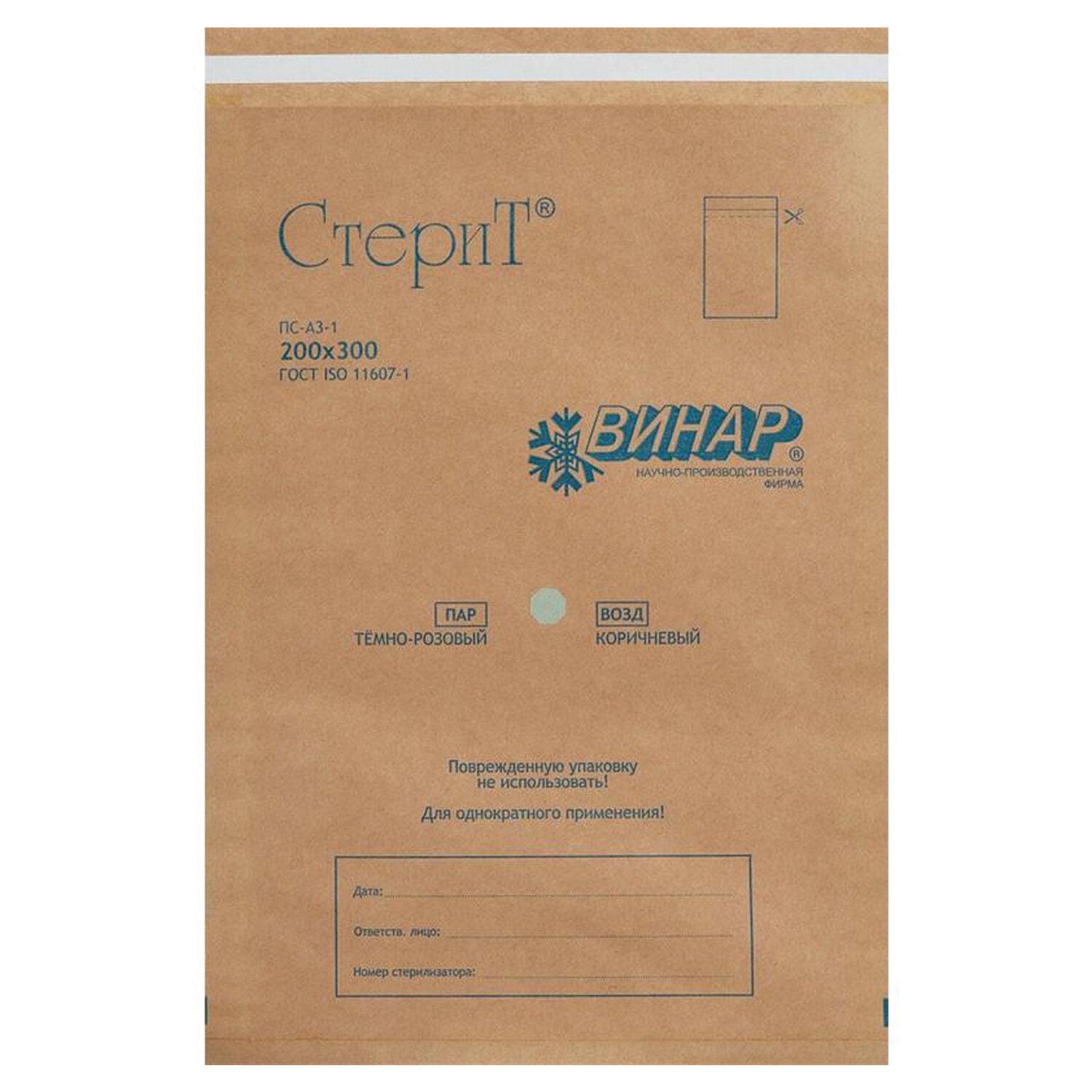 Пакет крафт самоклеящийся ВИНАР СТЕРИТ, комплект 100 шт., для ПАРОВОЙ/ВОЗДУШНОЙ стерилизации, 200х300 мм