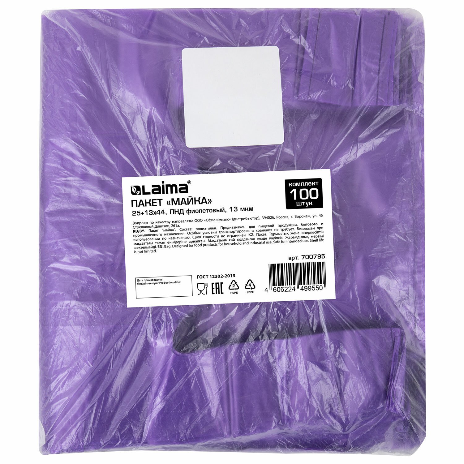 Пакет "майка" КОМПЛЕКТ 100 штук, 25+13х44, ПНД фиолетовый, 13 мкм, LAIMA, 700795