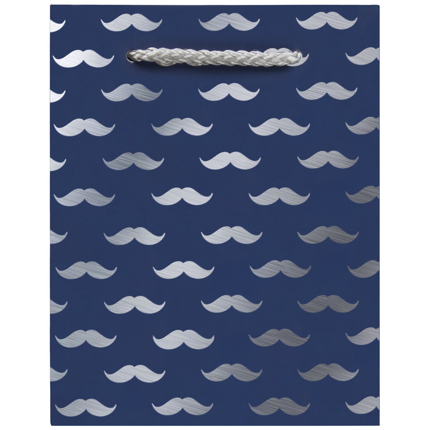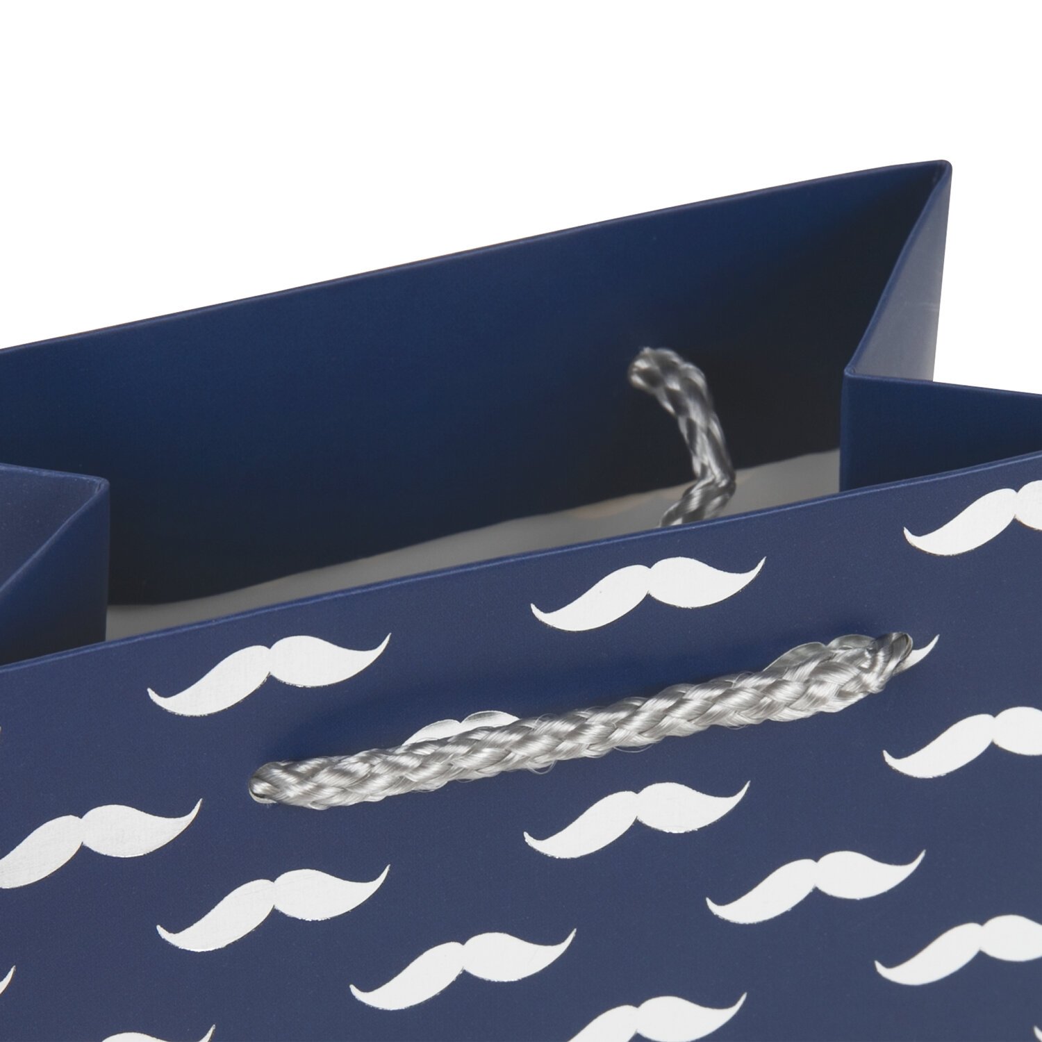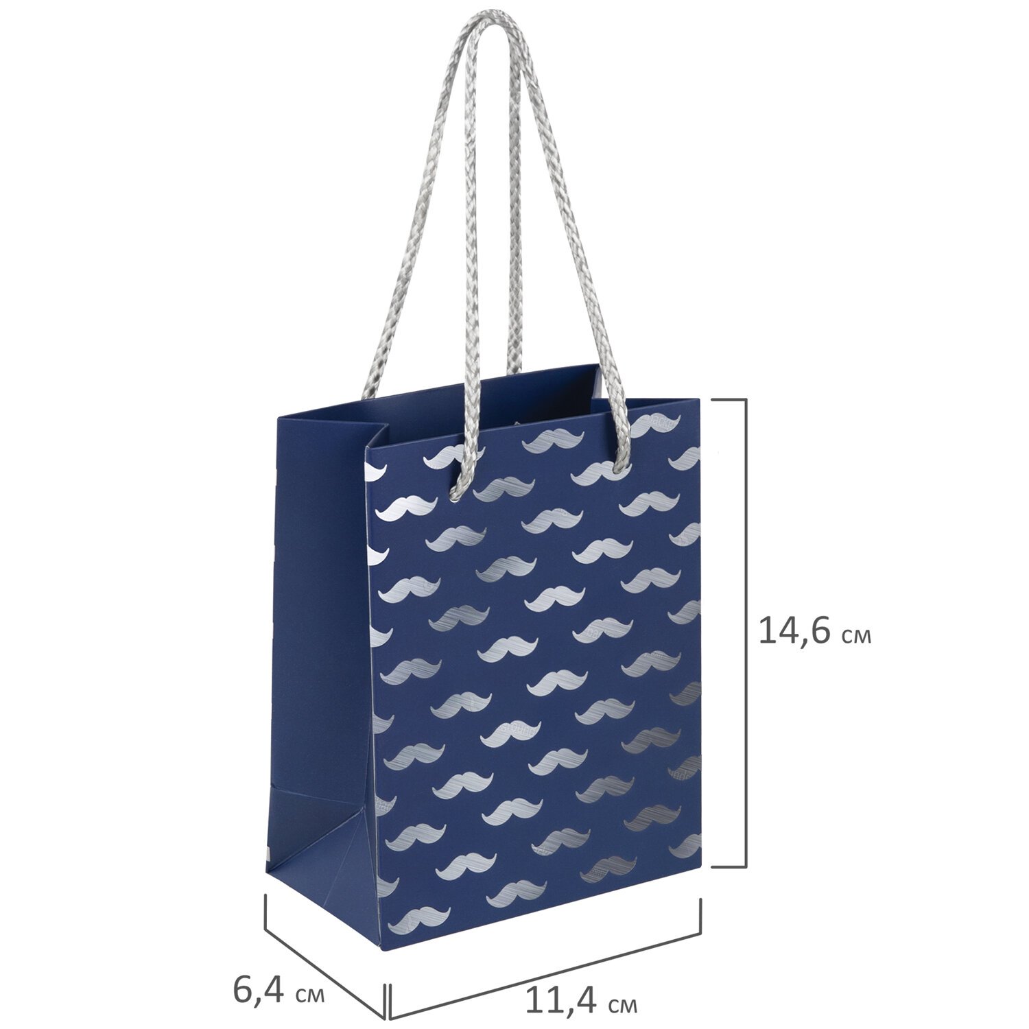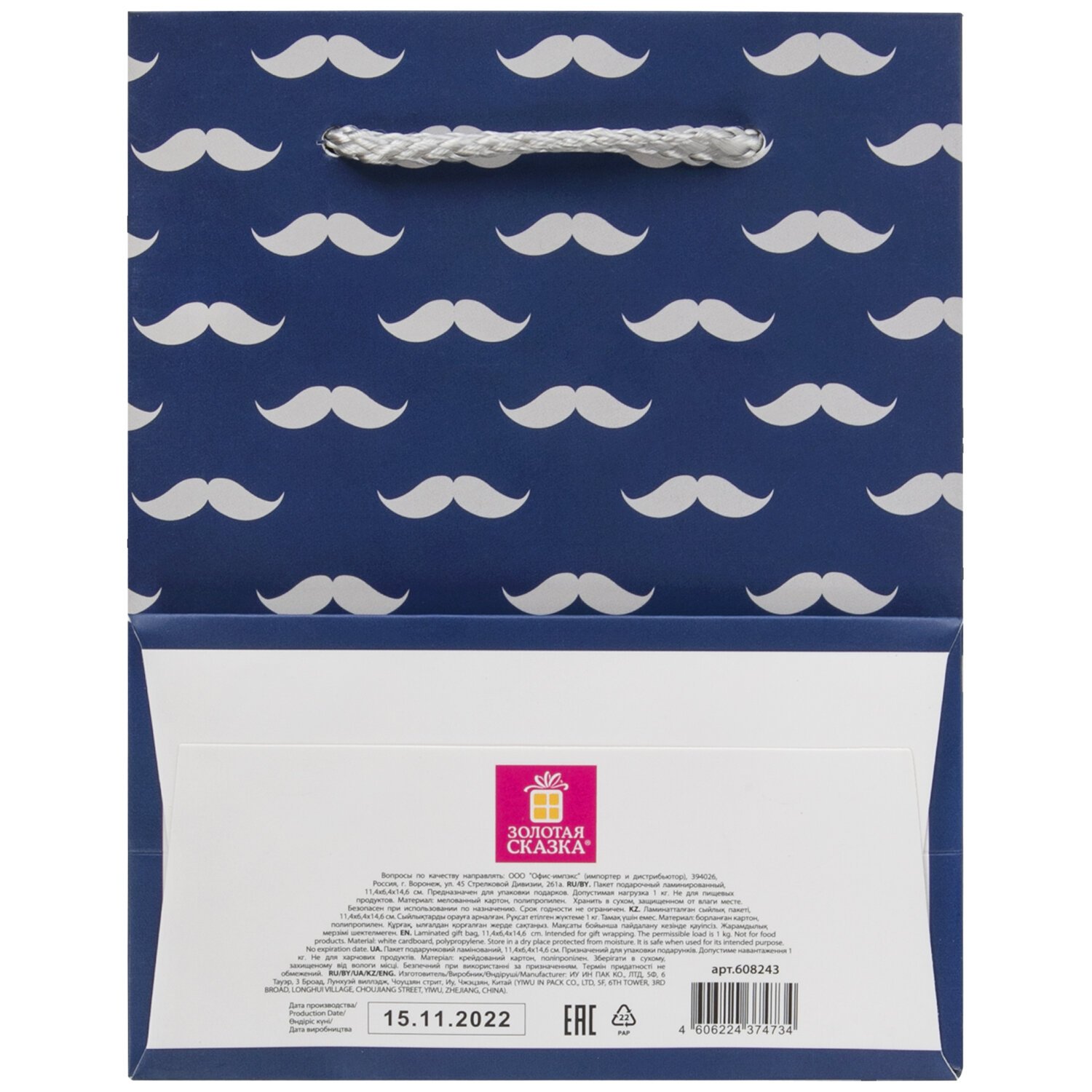 Изготовлен из ламинированного мелованного картона с веревочными ручками из полипропилена. Размер – 11x6x15 см. Пакет выполнен в мужском стиле в синем цвете. С лицевой стороны пакета некоторые детали покрыты тиснением серебристой фольгой.