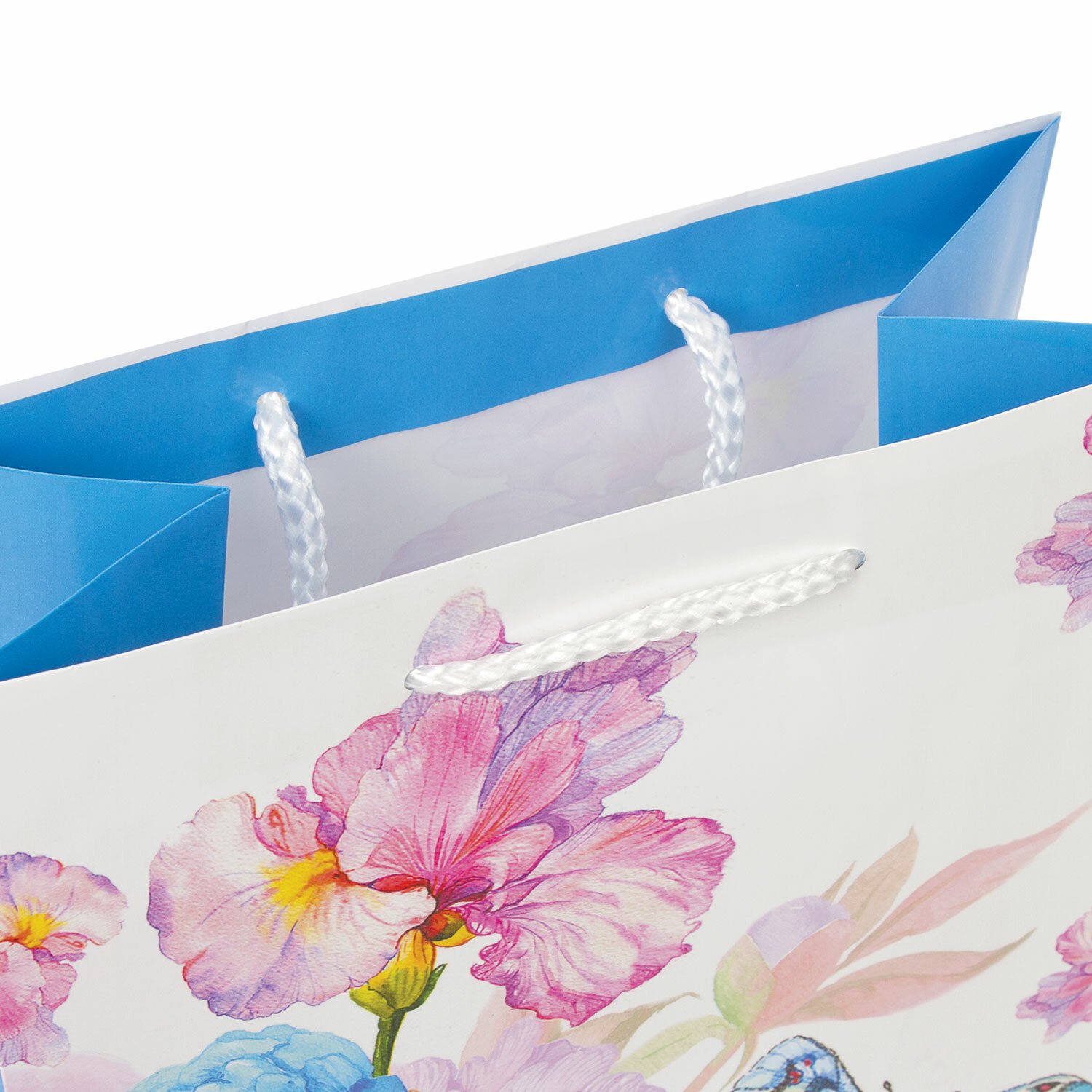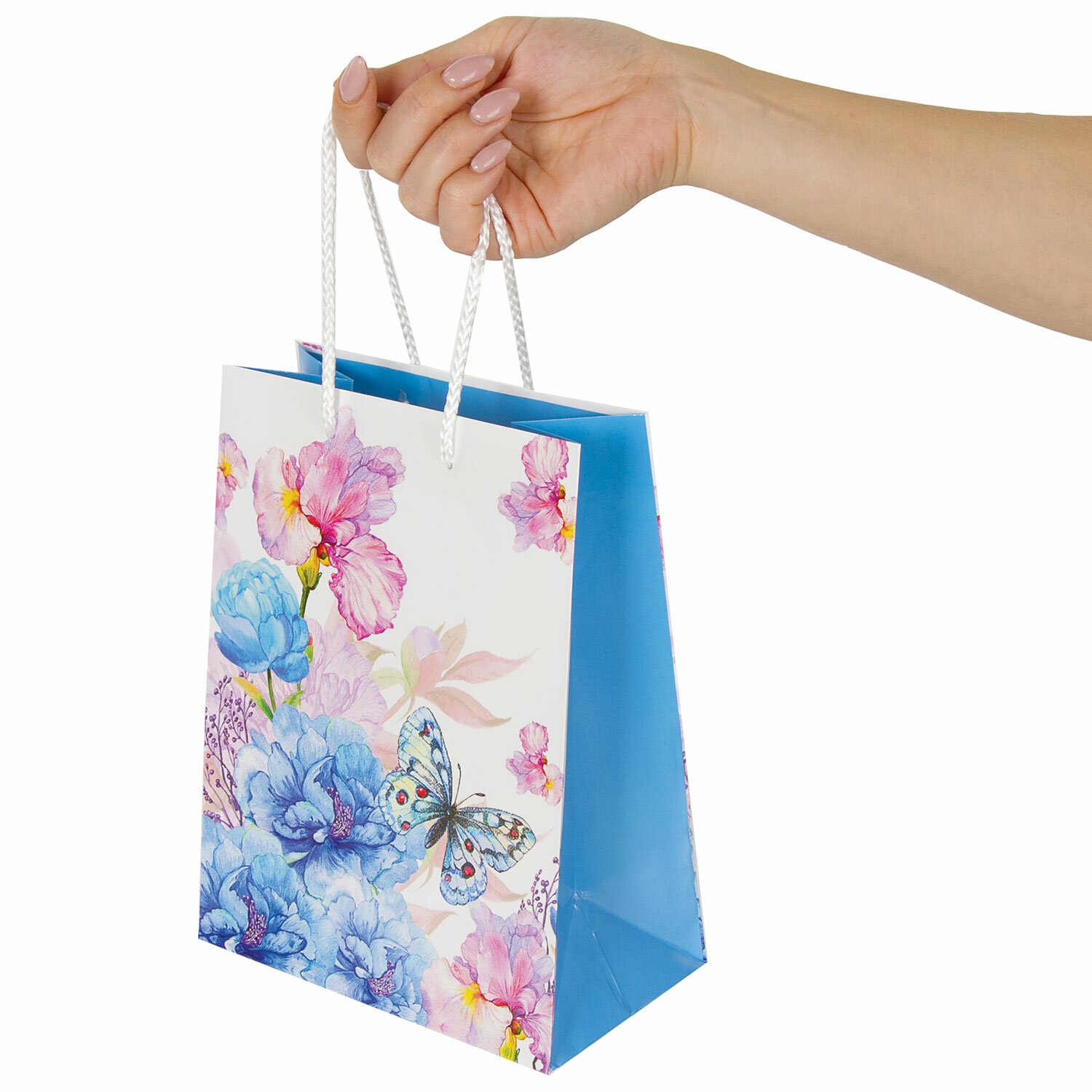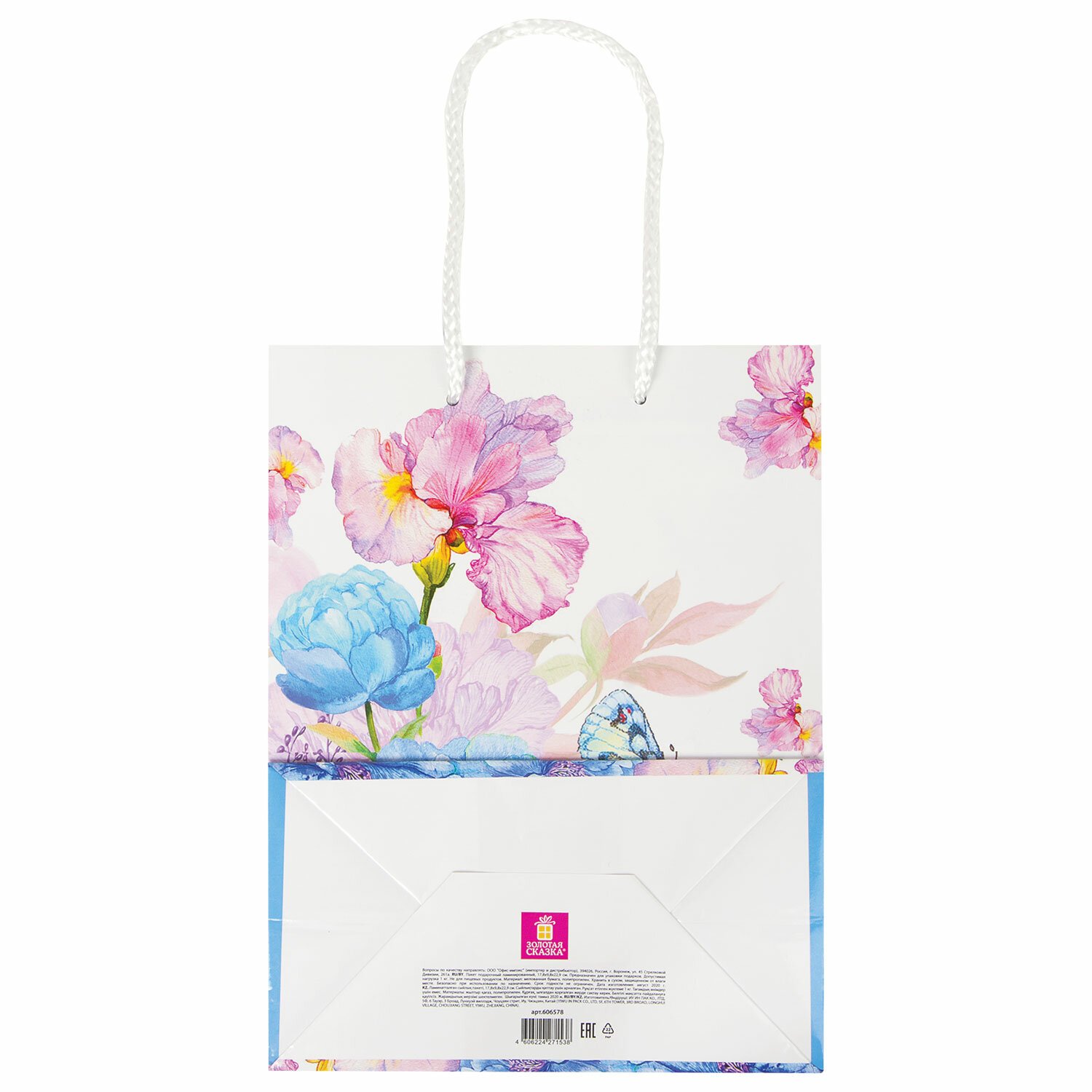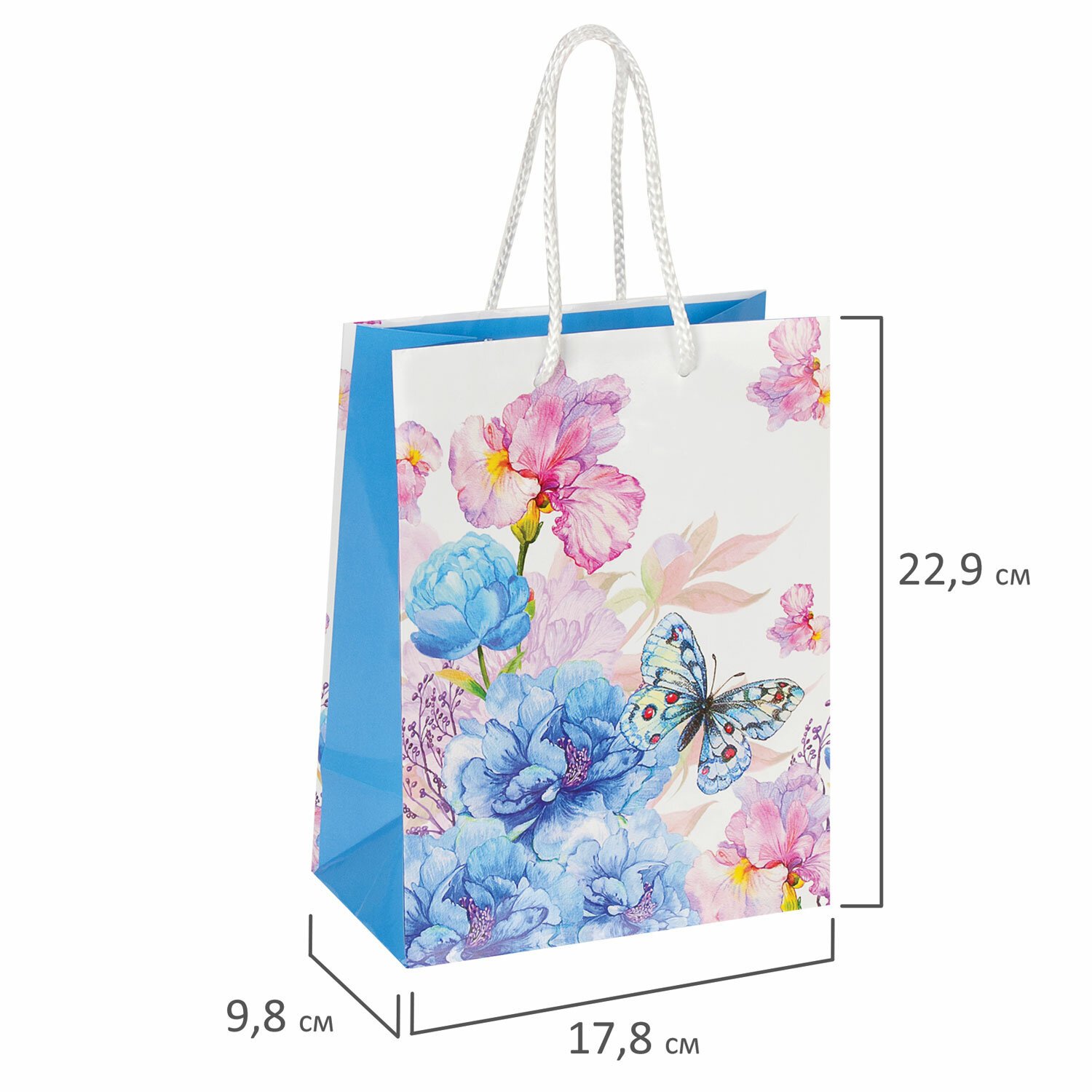 Изготовлен из ламинированной мелованной бумаги с веревочными ручками из полипропилена. Размер – 18x10x23 см. Пакет выполнен в белых и голубых тонах с изображением бабочки и цветов.