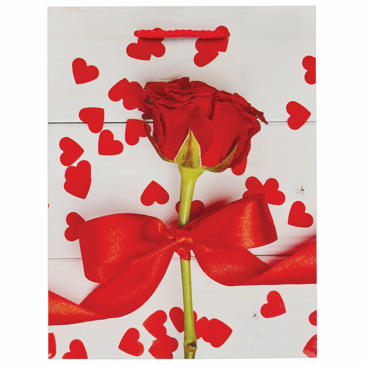 Изготовлен из ламинированной мелованной бумаги с веревочными ручками из полипропилена. Размер – 18x10x23 см. Пакет выполнен в белых и красных тонах с изображением красной розы, украшенной лентой.