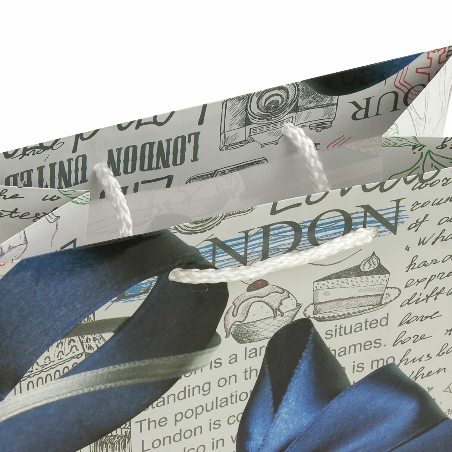Изготовлен из ламинированной мелованной бумаги с веревочными ручками из полипропилена. Размер – 18x10x23 см. Пакет выполнен в белых и серых тонах с изображением синего банта.