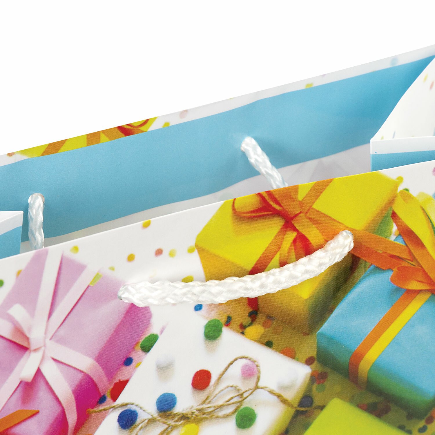 Изготовлен из ламинированной мелованной бумаги с веревочными ручками из полипропилена. Размер – 18x10x23 см. Пакет выполнен в белом цвете с изображением разноцветных подарочных коробочек.