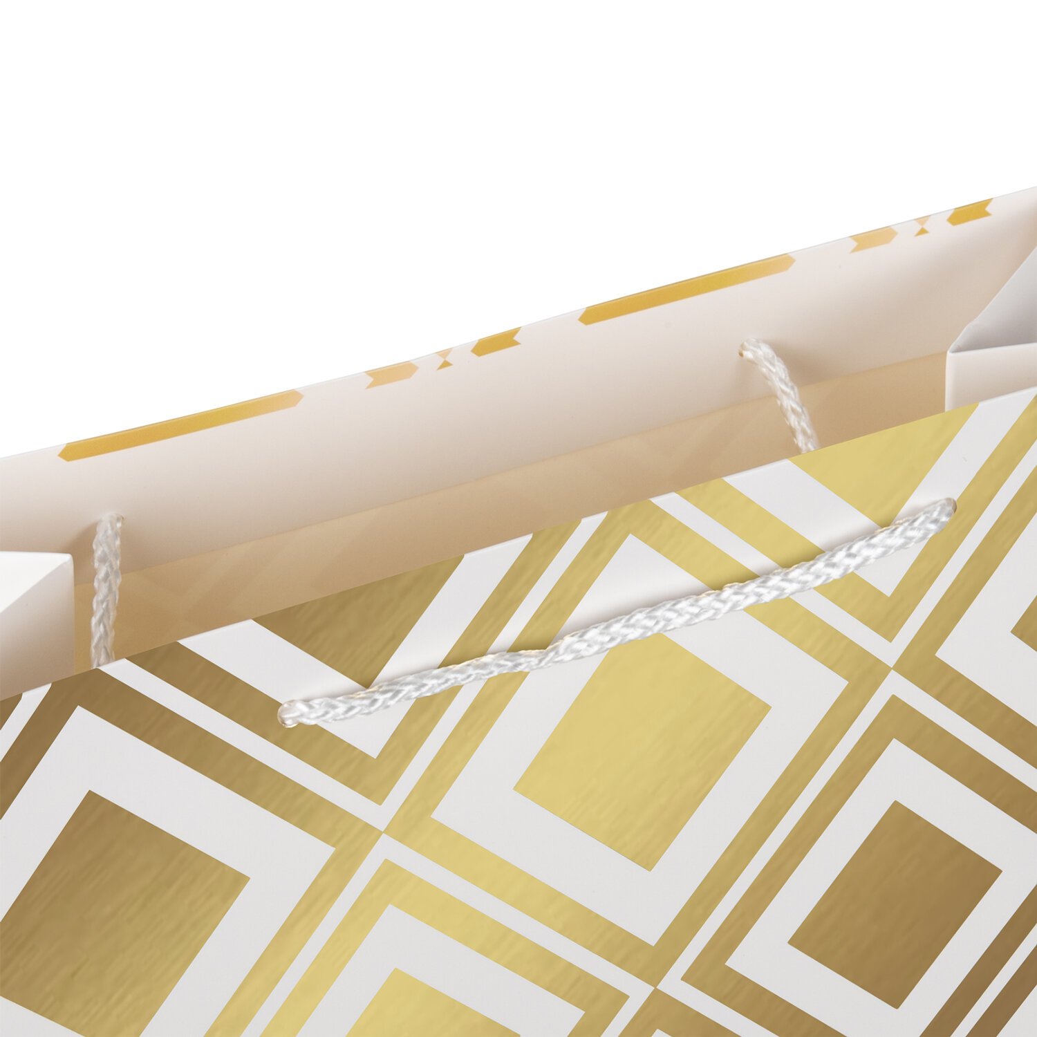Изготовлен из ламинированного мелованного картона с веревочными ручками из полипропилена. Размер – 26x13x32 см. Пакет выполнен в белом цвете с изображением абстракции в форме ромба. С лицевой стороны пакета некоторые детали покрыты тиснением золотистой фольгой.