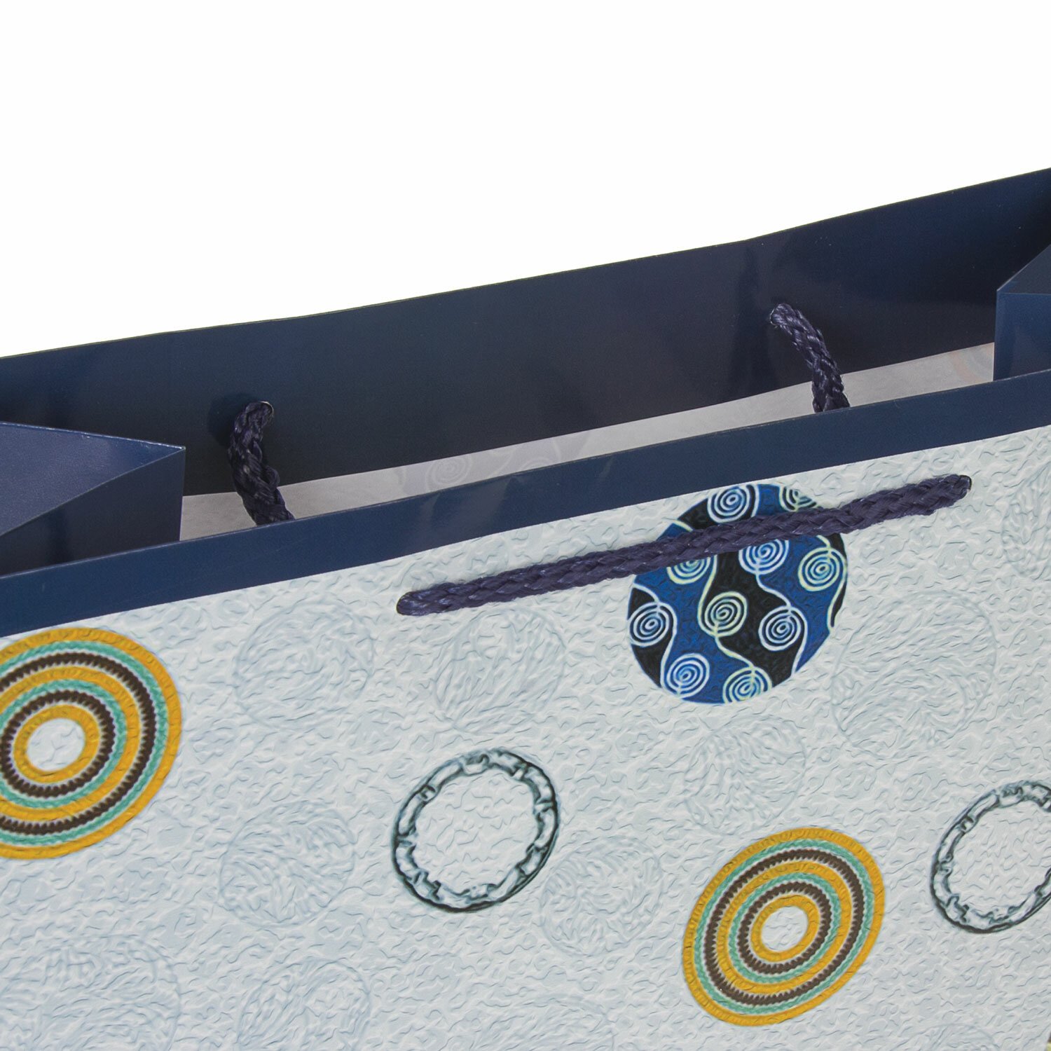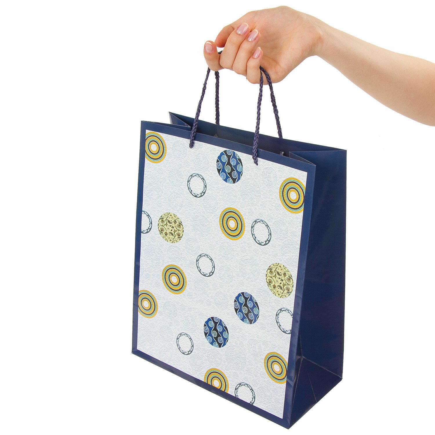 Изготовлен из ламинированной мелованной бумаги с веревочными ручками из полипропилена. Размер – 26x13x32 см. Пакет с принтом в виде кругов и колец выполнен в серых, синих и бежевых тонах.