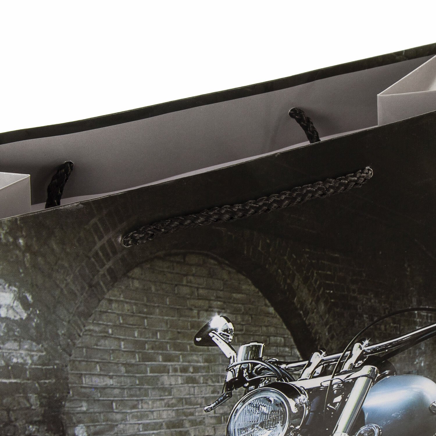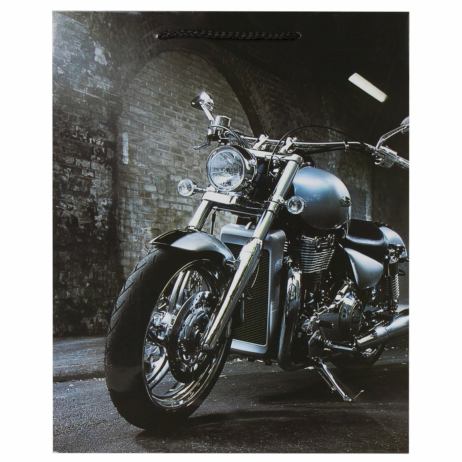 Изготовлен из ламинированной мелованной бумаги с веревочными ручками из полипропилена. Размер – 26x13x32 см. Пакет выполнен в серых тонах с изображением мотоцикла.