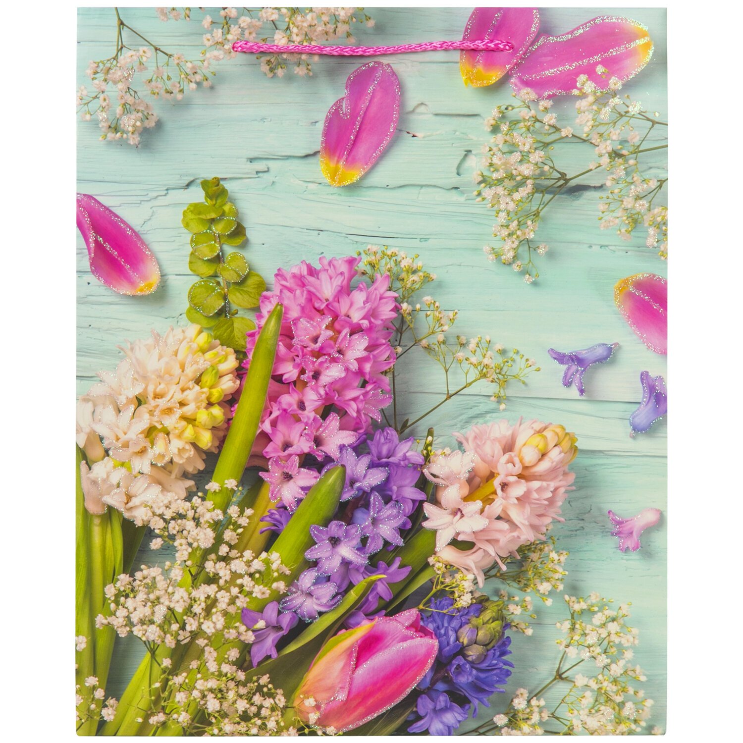 Изготовлен из ламинированного мелованного картона с веревочными ручками из полипропилена. Размер – 26x13x32 см. Пакет выполнен в светлых тонах с изображением весенних цветов. С лицевой стороны пакета некоторые детали покрыты глиттером.
