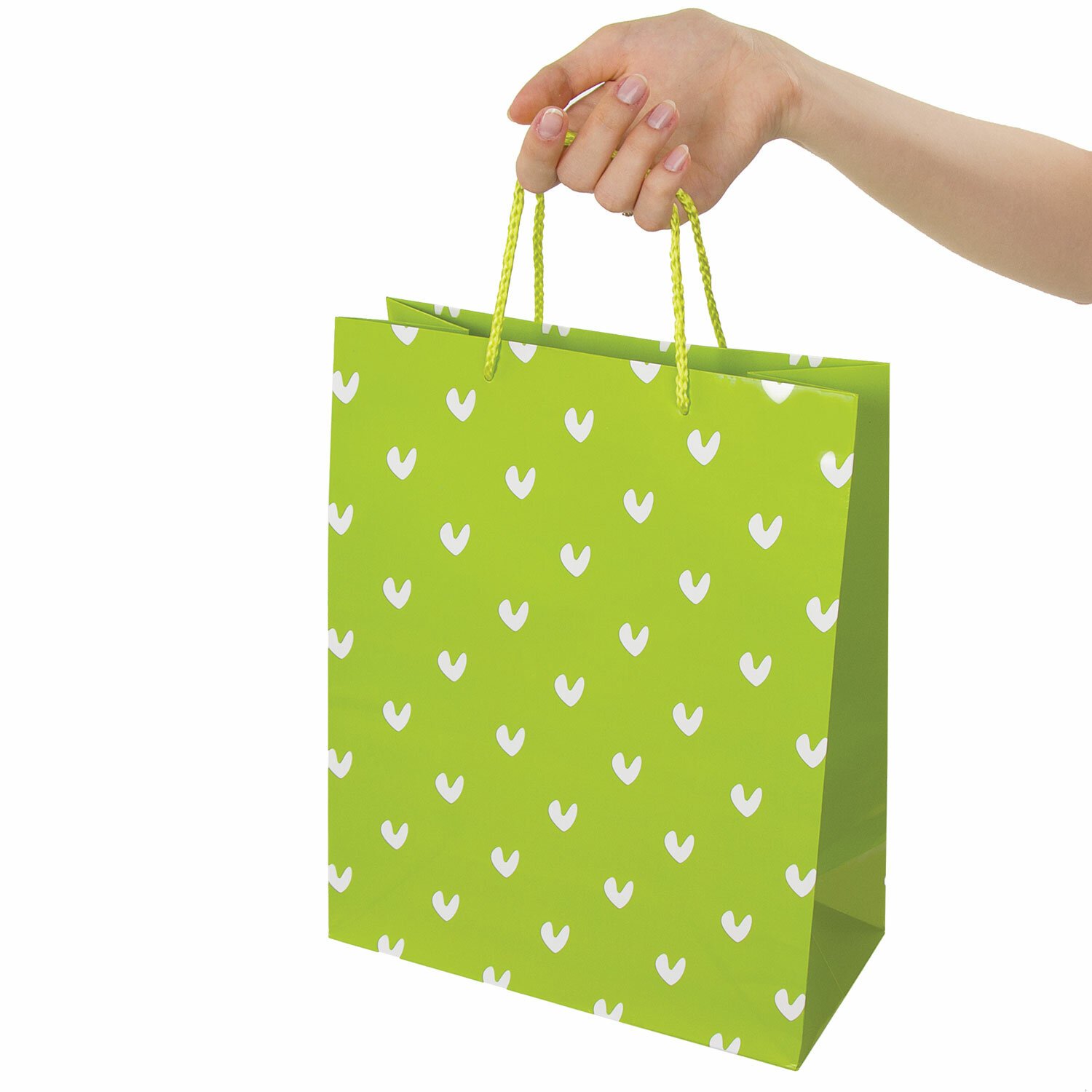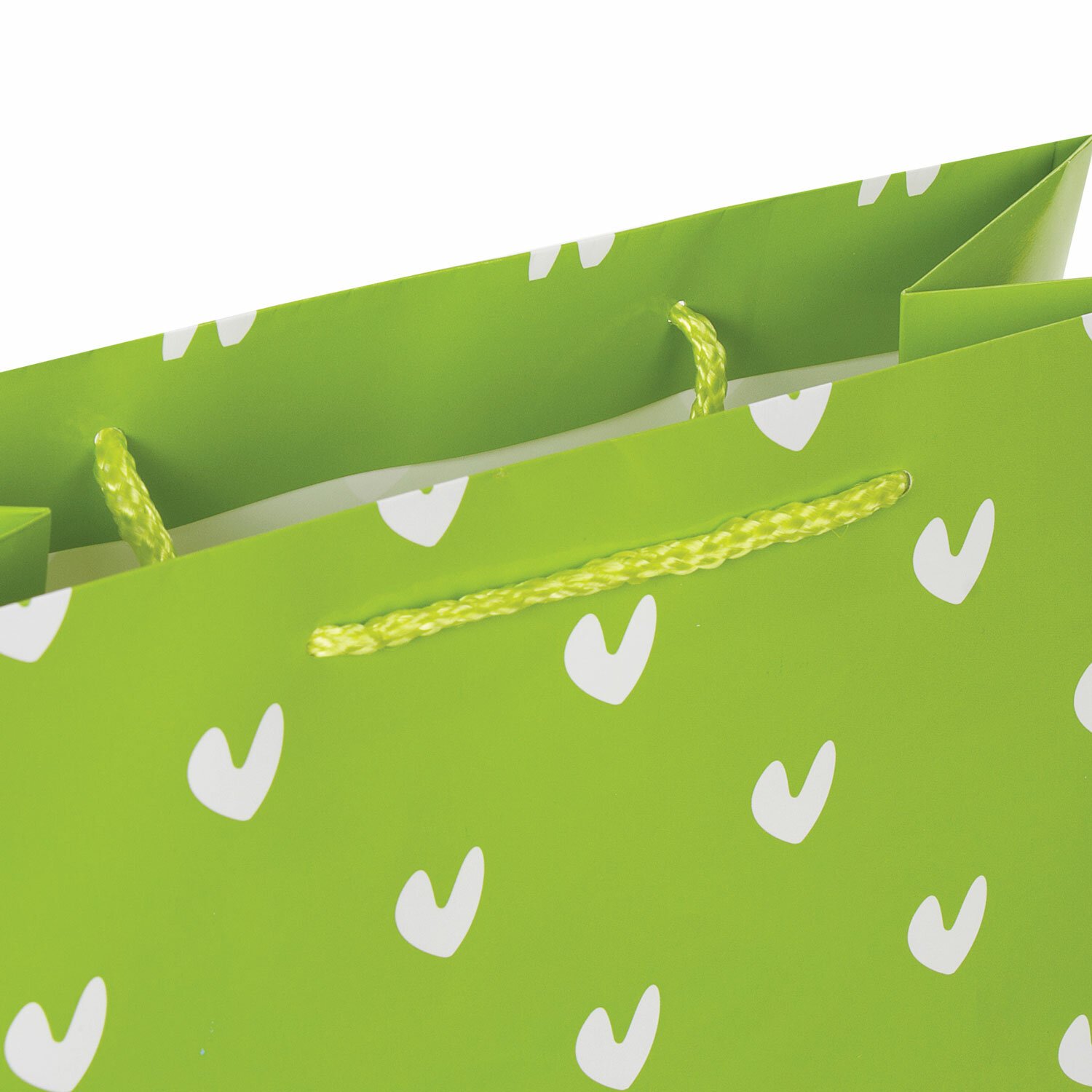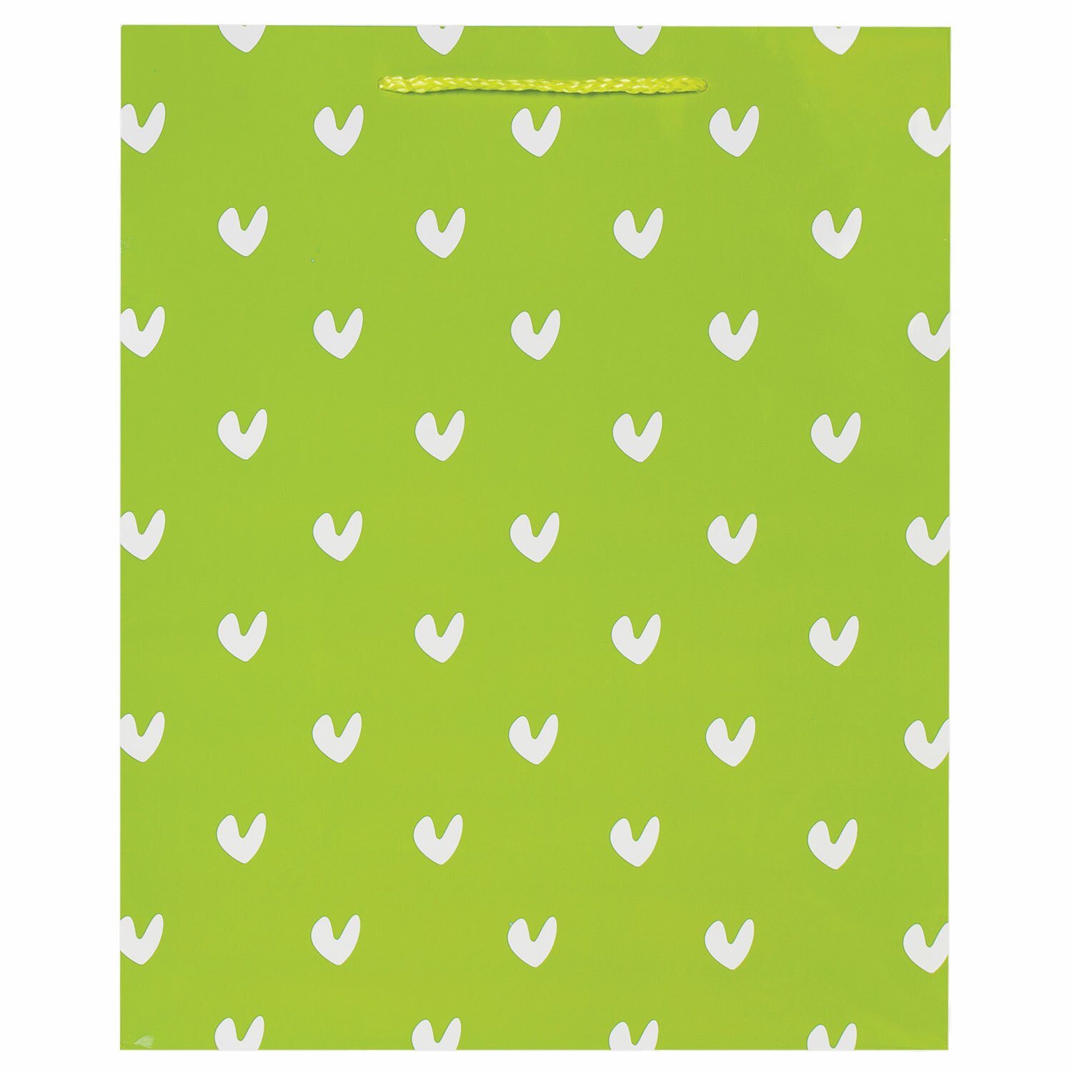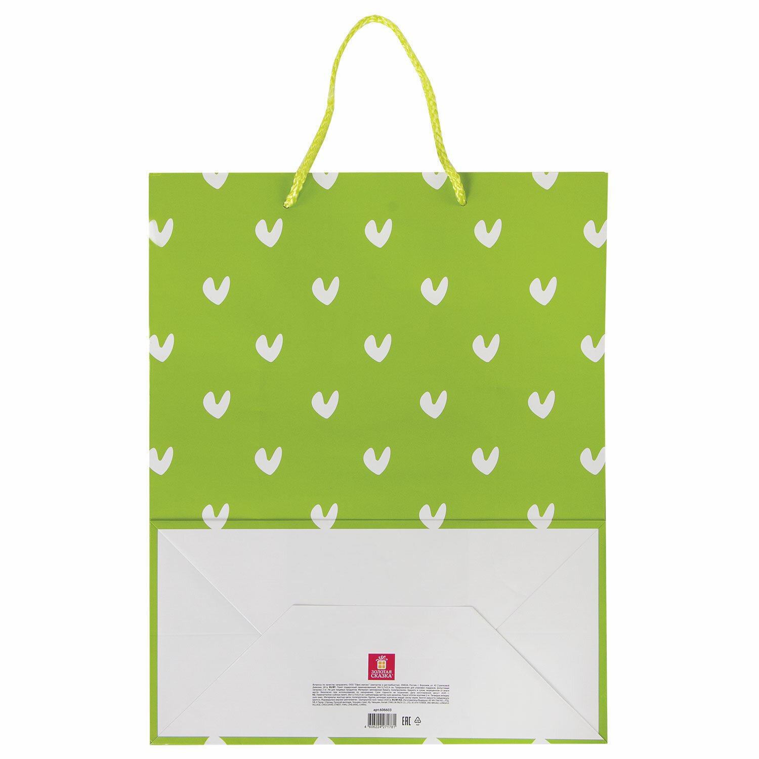Изготовлен из ламинированной мелованной бумаги с веревочными ручками из полипропилена. Размер – 26x13x32 см. Пакет с принтом в виде галочек-сердечек выполнен в зеленом цвете.