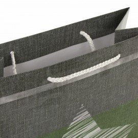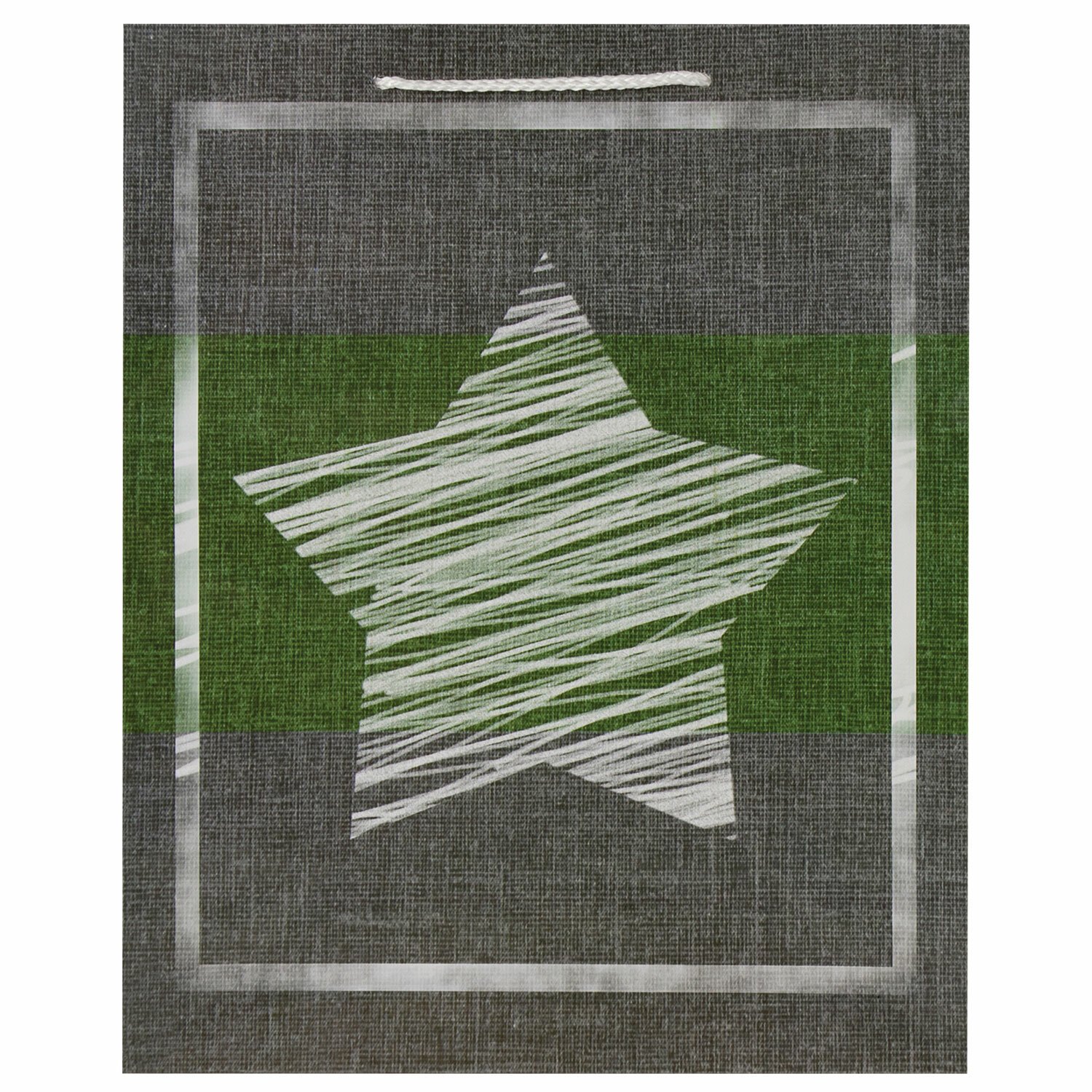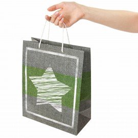 Изготовлен из ламинированной мелованной бумаги с веревочными ручками из полипропилена. Размер – 26x13x32 см. Пакет выполнен в серых, белых и зеленых тонах с изображением звезды.
