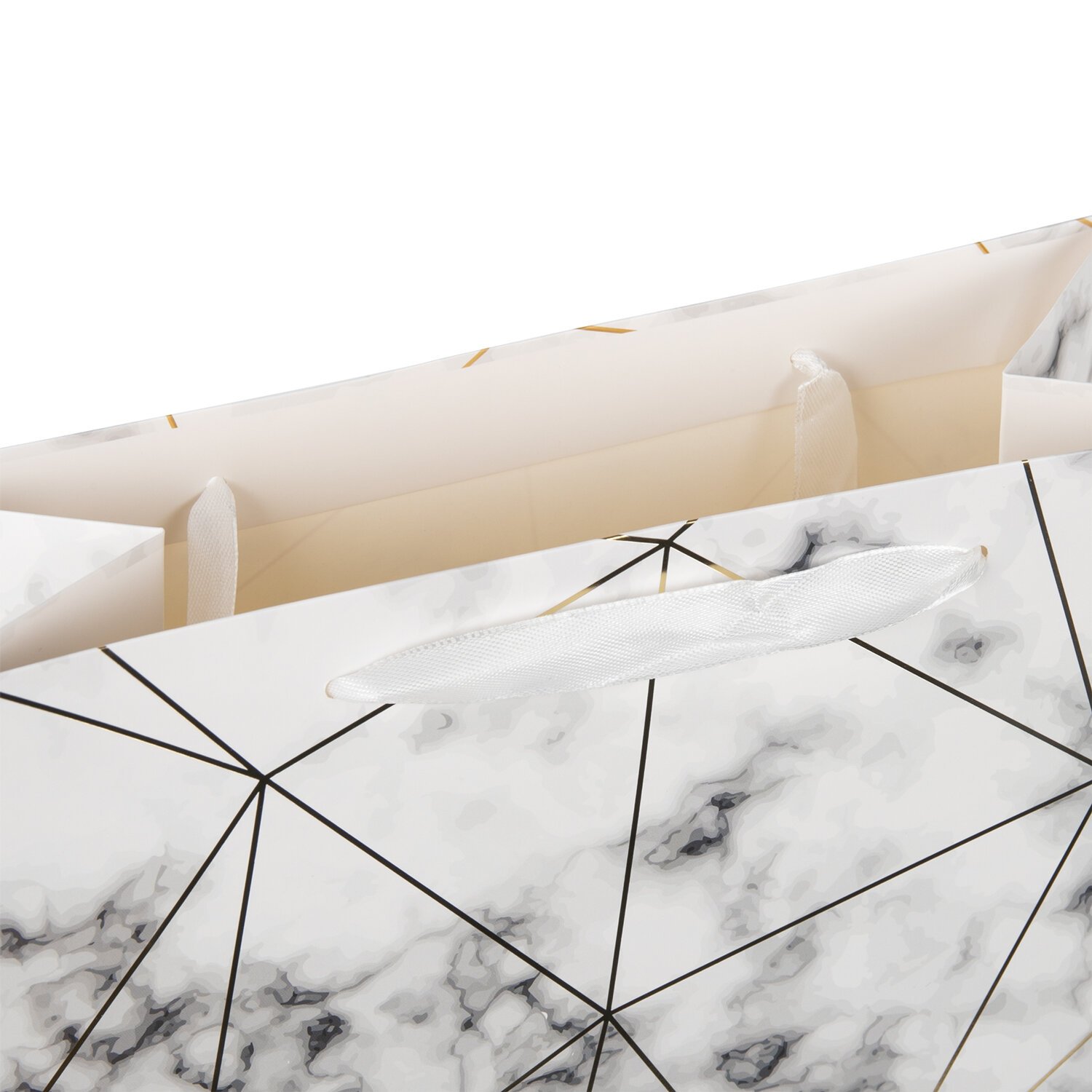 Изготовлен из ламинированного мелованного картона с ленточным ручками из полиэстера. Размер – 26x13x33 см. Пакет выполнен в цвете белого мрамора с изображением абстракции. С лицевой стороны пакета некоторые детали покрыты тиснением золотистой фольгой.