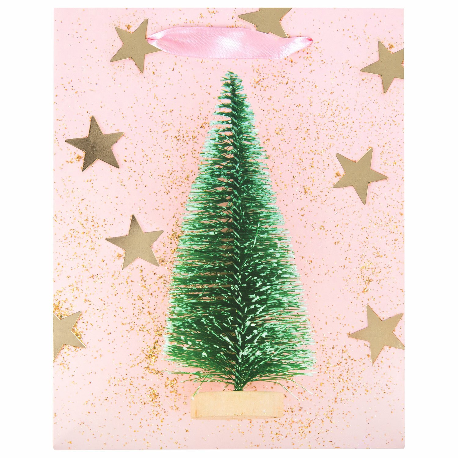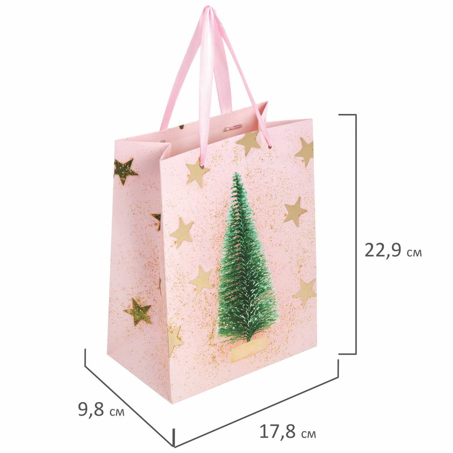 Изготовлен из ламинированного мелованного картона с ленточными ручками из полиэстера. Размер – 18x10x23 см. Пакет выполнен в розовом и золотистом цветах с изображением праздничных новогодних атрибутов. С лицевой стороны пакета некоторые детали покрыты тиснением золотистой фольгой.