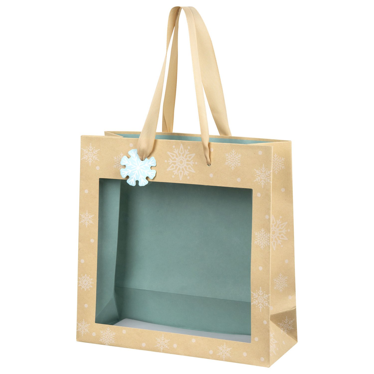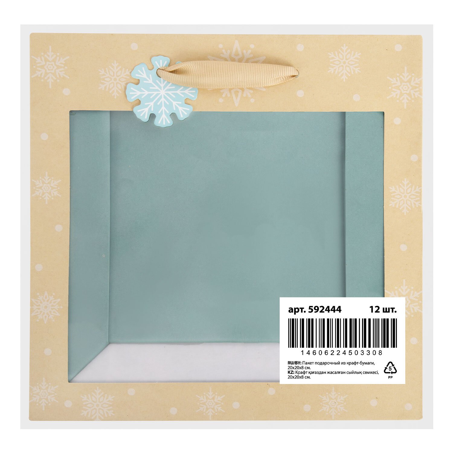 Пакет изготовлен из крафт-бумаги, украшенной нежными узорами снежинок, снабжен ленточными ручками из полиэстера. Размер – 20x8x20 см. Внутри пакет выполнен в светло-голубом цвете. С лицевой стороны пакета - прозрачное "окно", через которое виден голубой цвет внутренней части пакета - оригинальный акцент, привлекающий внимание.