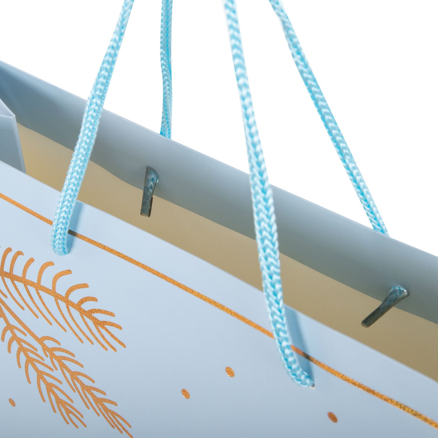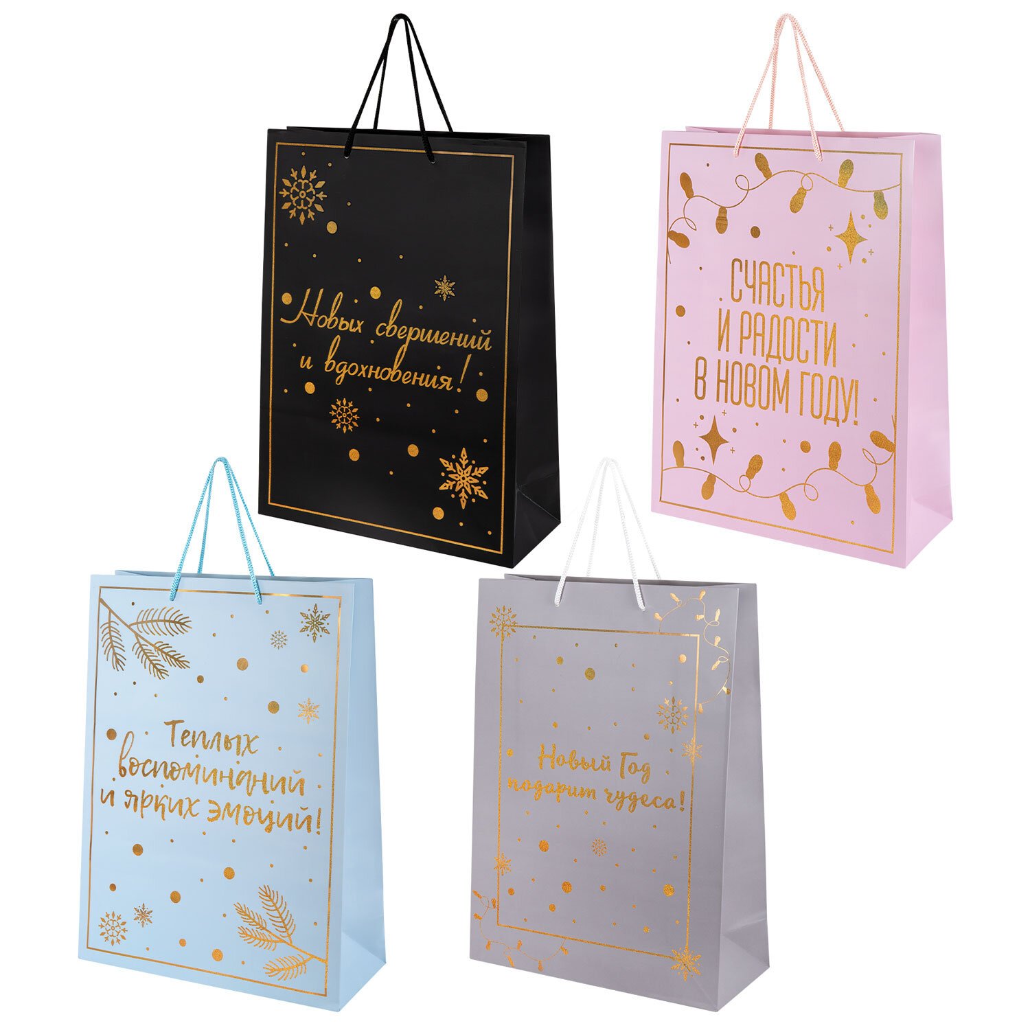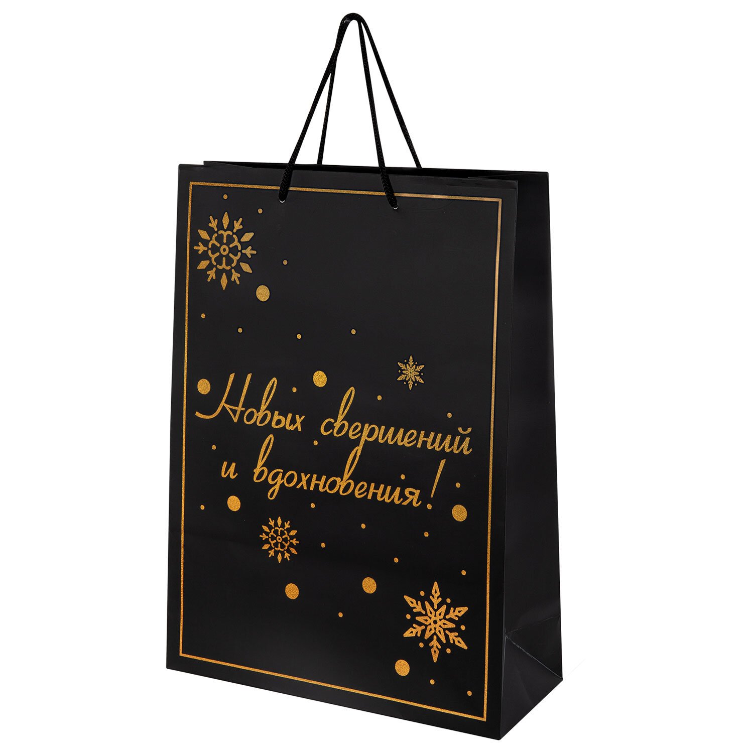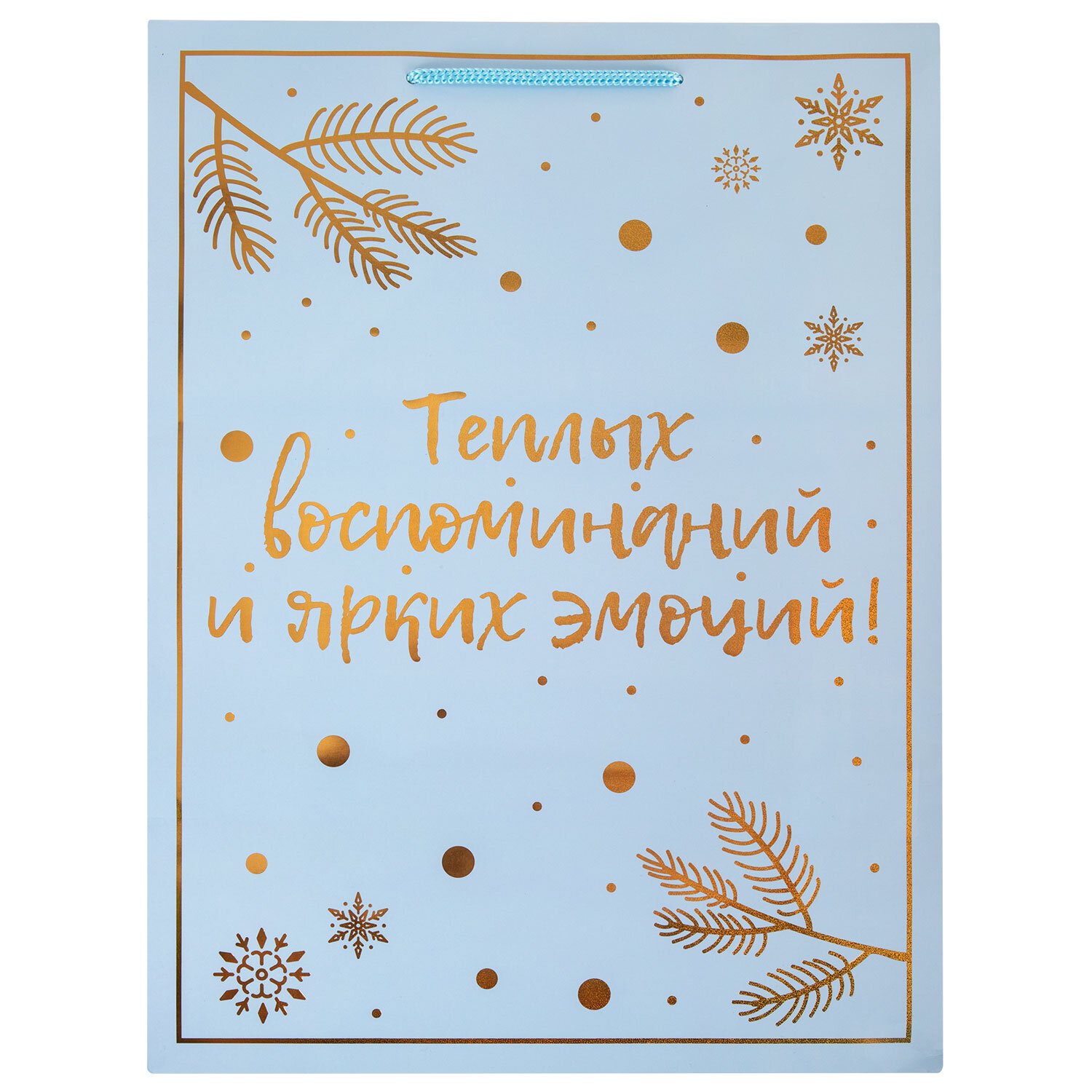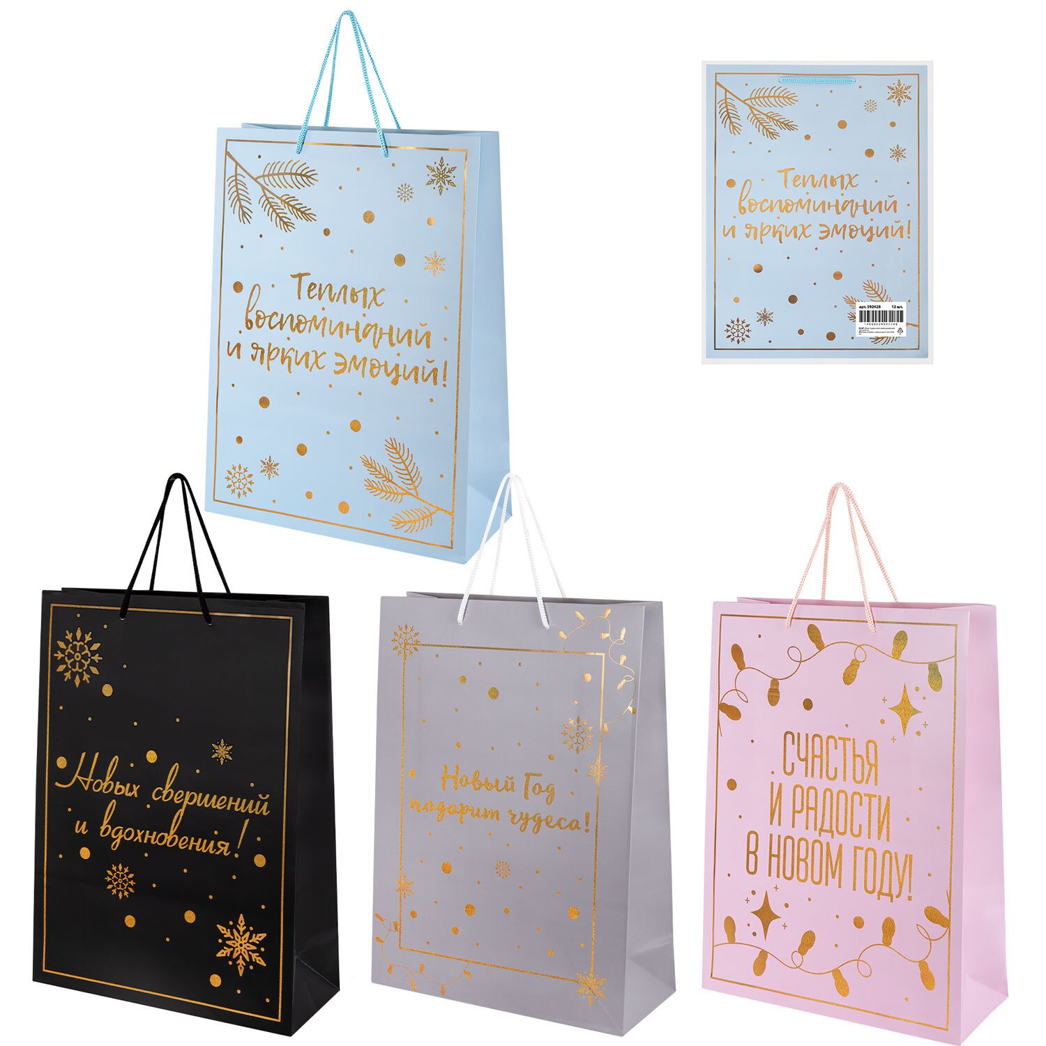 На каждом пакете написаны новогодние пожелания, что делает пакет частью поздравления. Можно просто вручить его с добрыми словами — и он всё скажет за вас. Дополнительные элементы декора — маленькие снежинки и звёздочки — создают атмосферу праздника и добавляют каждому пакету особую магию в сочетании с переливающимся голографическим эффектом на всех деталях рисунка. Размер – 33x13x45см.