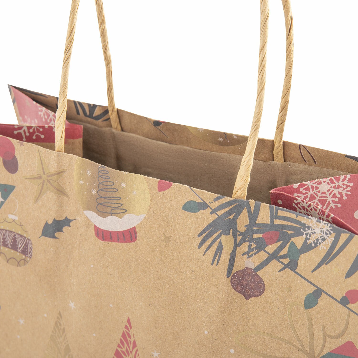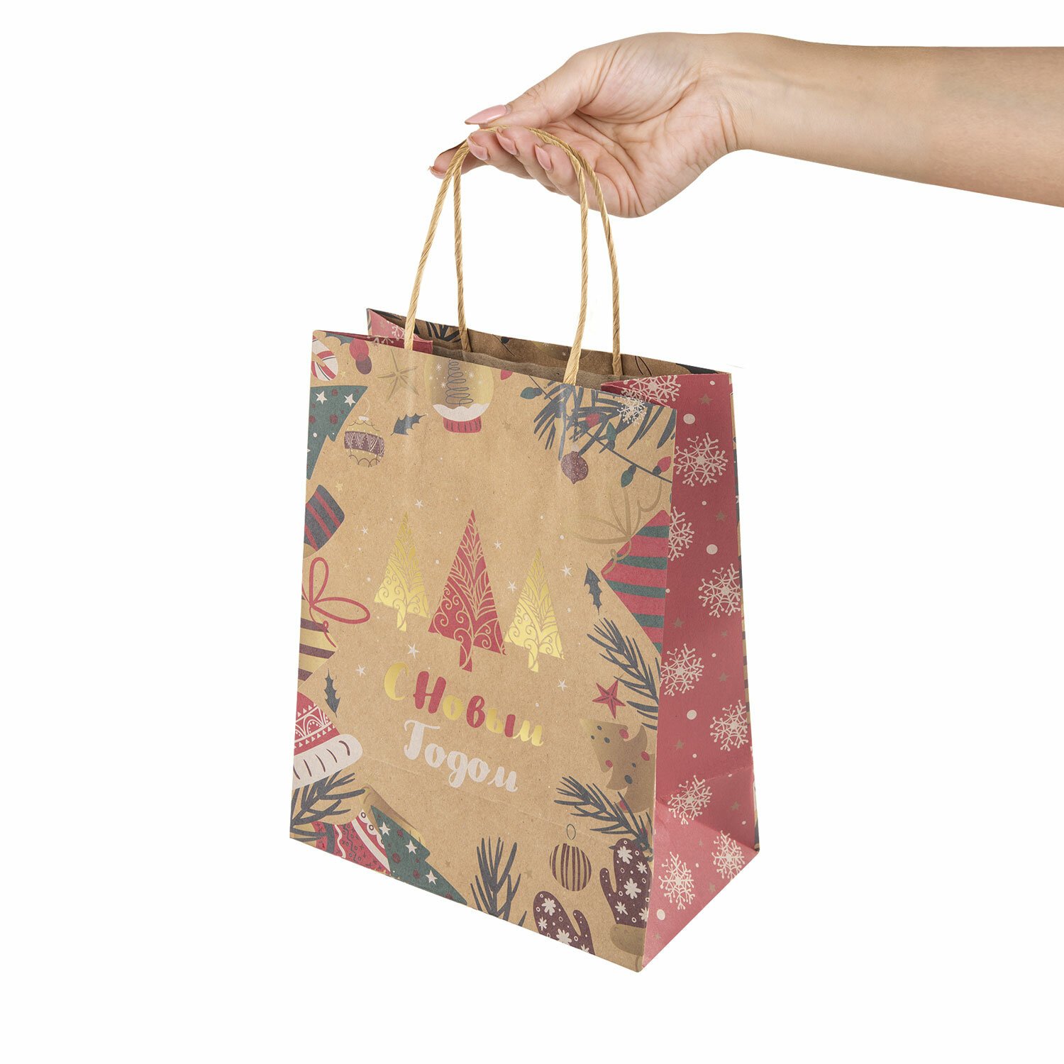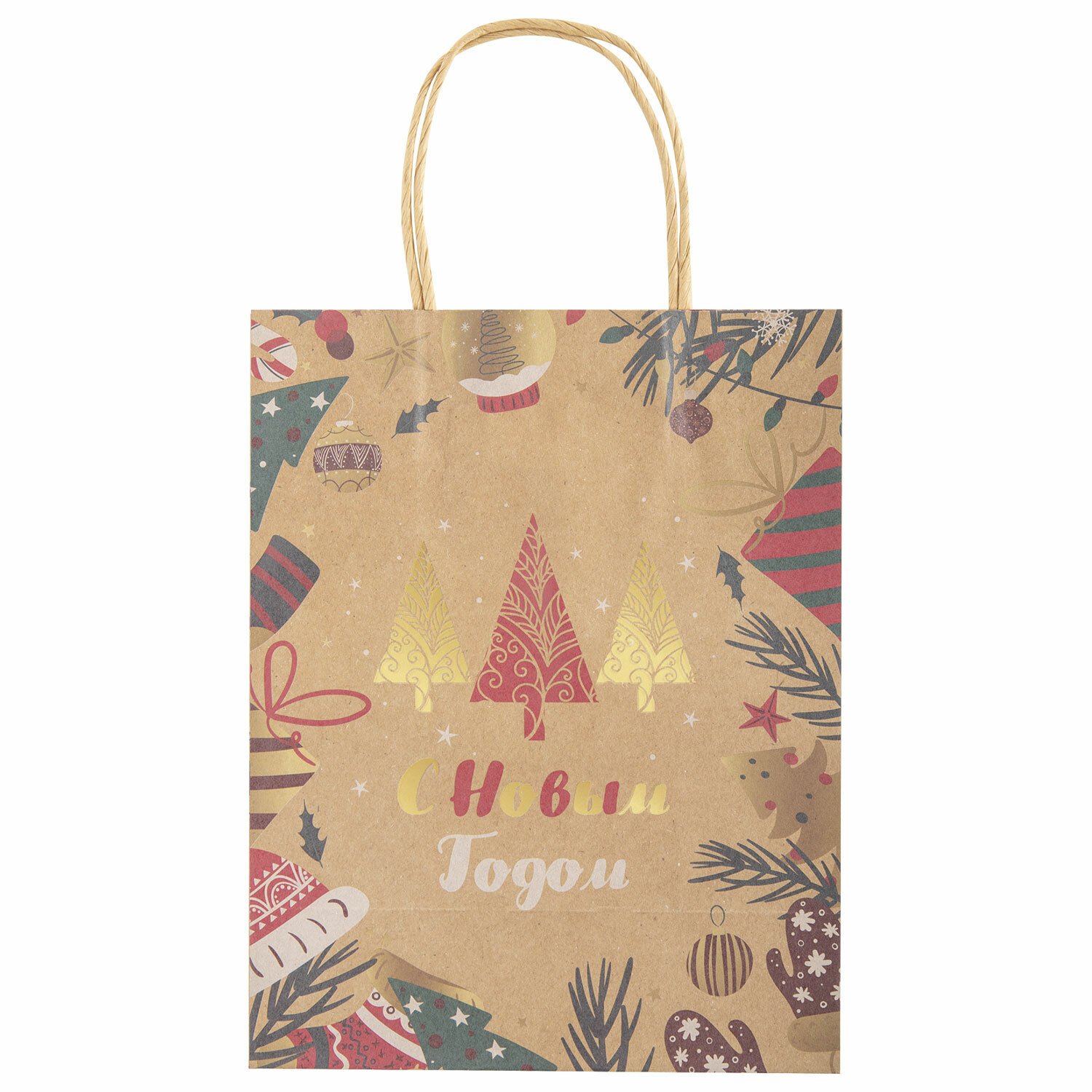 Подарочный пакет новогодний изготовлен из крафт-бумаги, снабжен бумажными ручками. Размер – 18x10x23 см. Пакет украшен изображениями новогодних атрибутов.