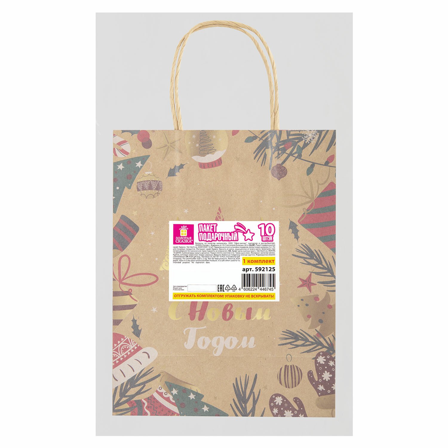 Пакет подарочный КОМПЛЕКТ 10 штук новогодний 18x10x23 см, "Merry Christmas", ЗОЛОТАЯ СКАЗКА, 592125