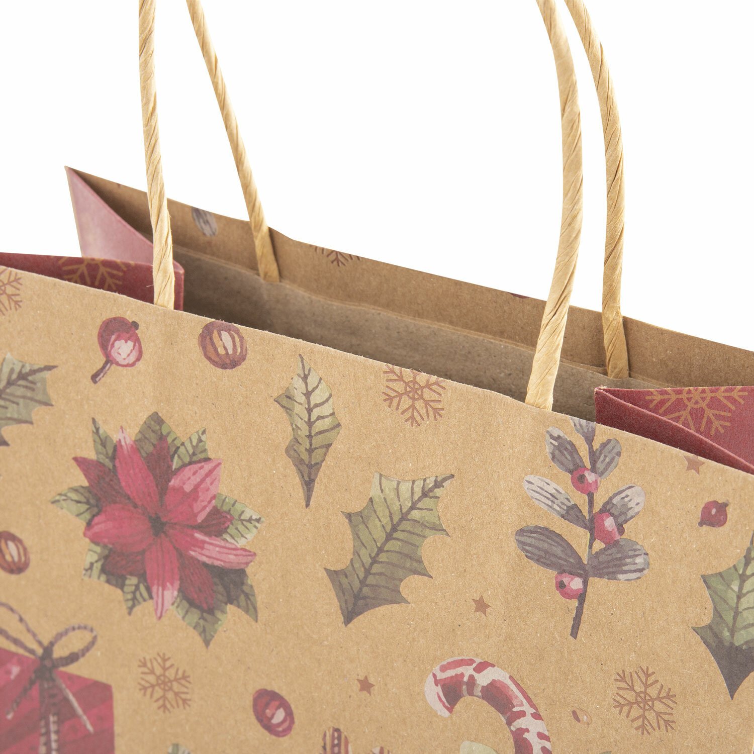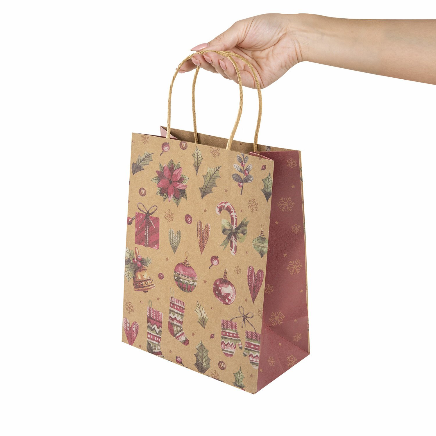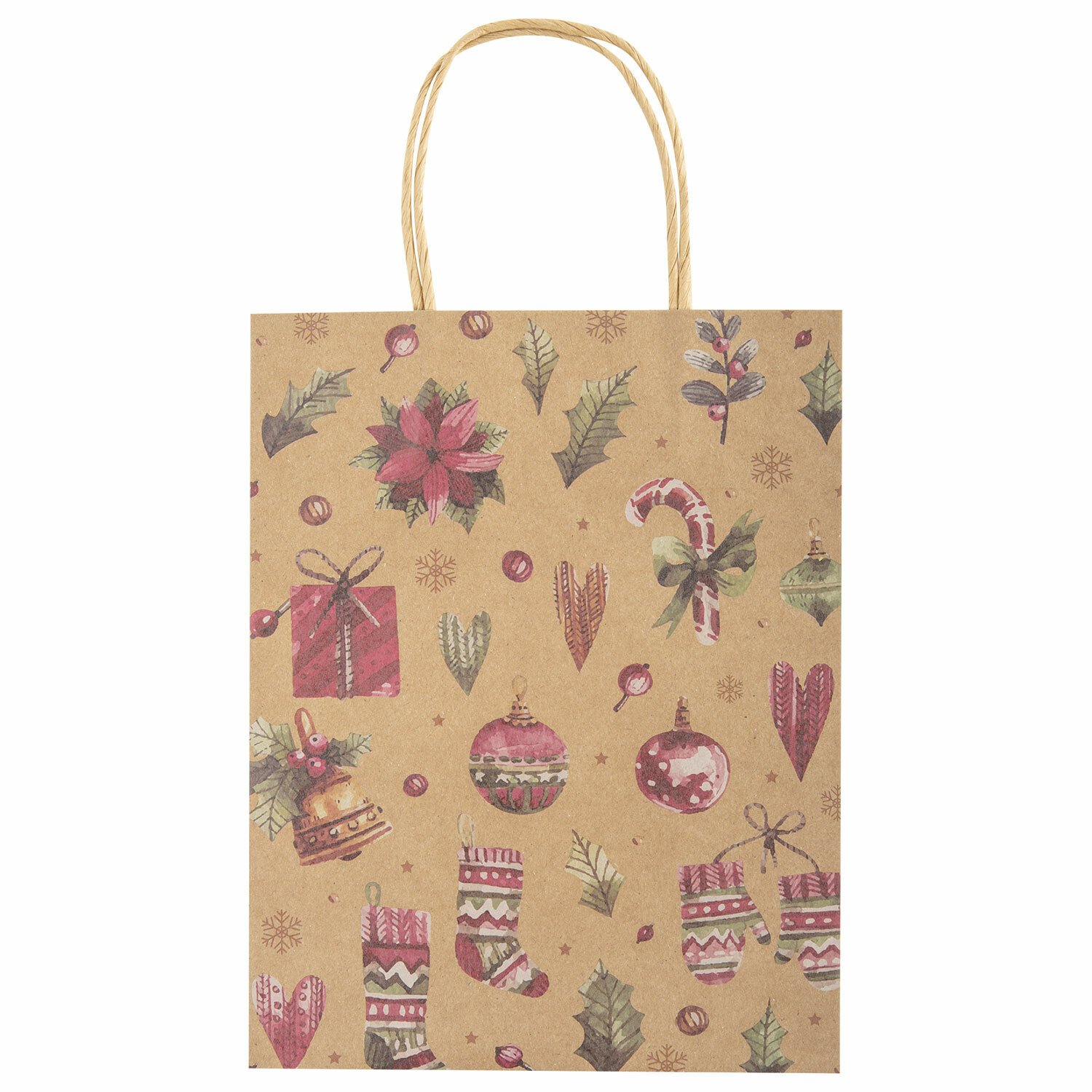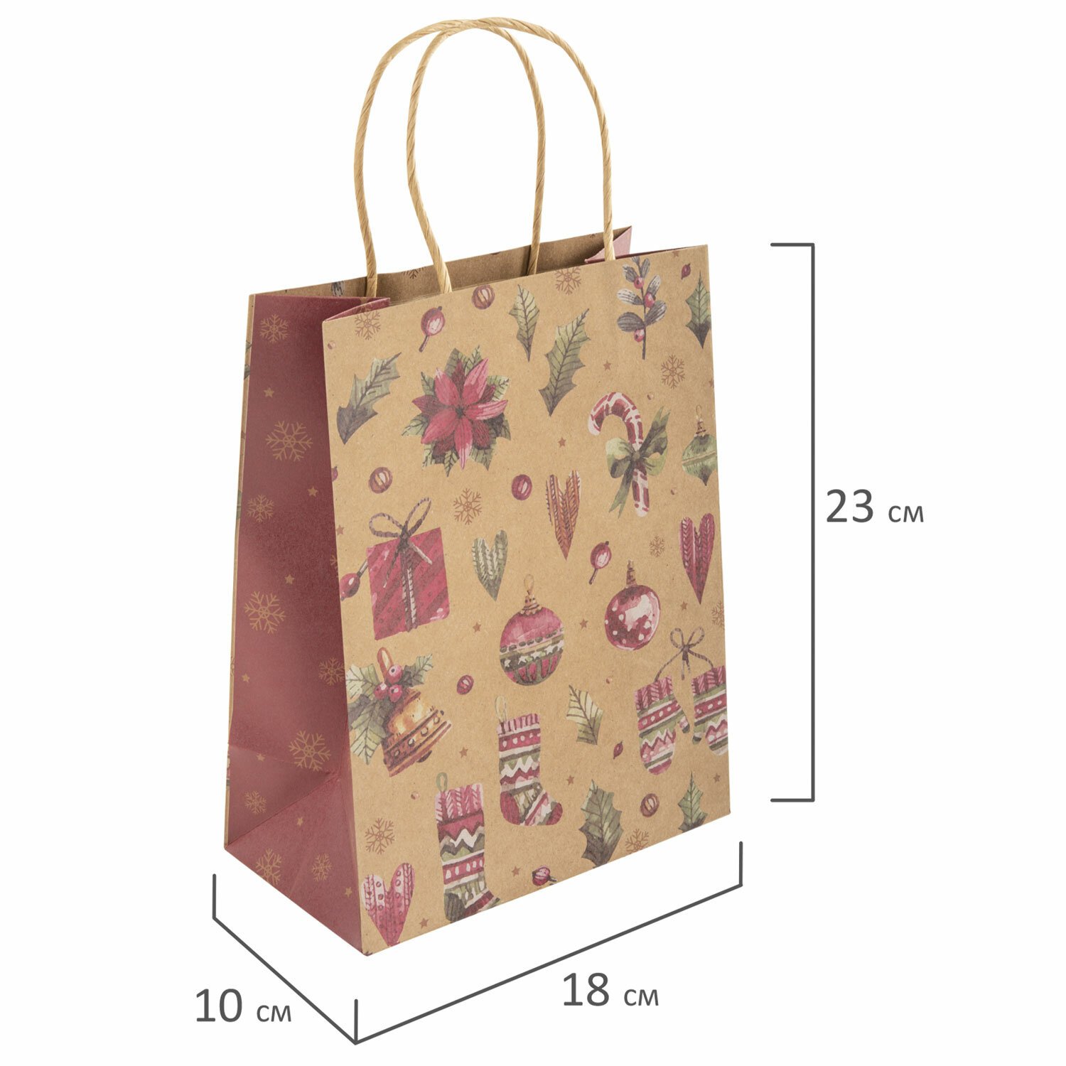 Подарочный пакет новогодний изготовлен из крафт-бумаги, снабжен бумажными ручками. Размер – 18x10x23 см. Пакет украшен изображениями новогодних атрибутов.