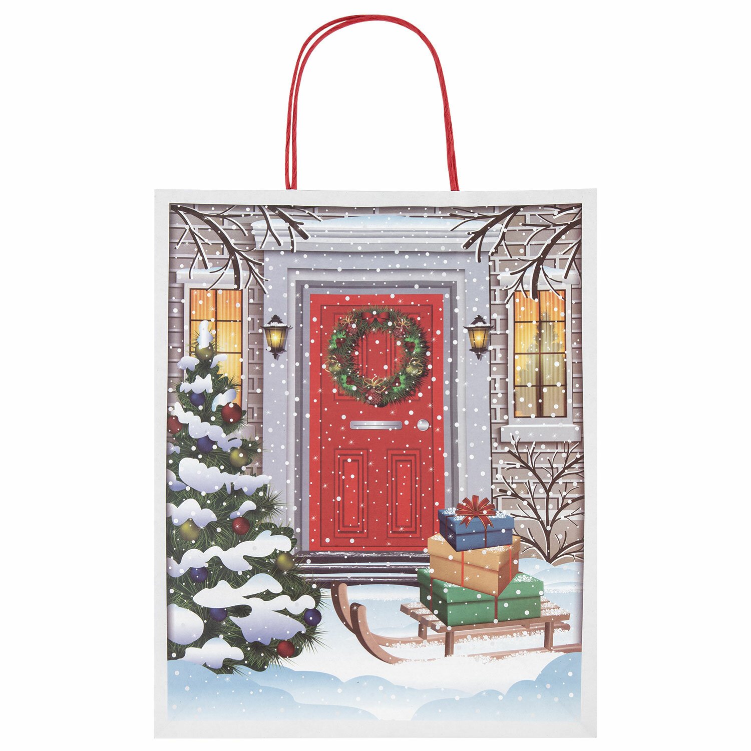 Подарочный пакет новогодний изготовлен из крафт-бумаги, снабжен бумажными ручками. Размер – 26x32x13 см. Пакет украшен изображением новогодних атрибутов.