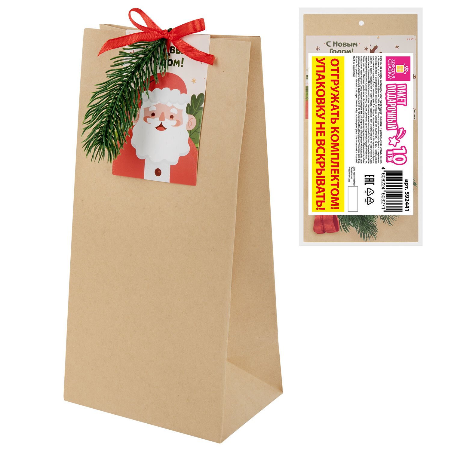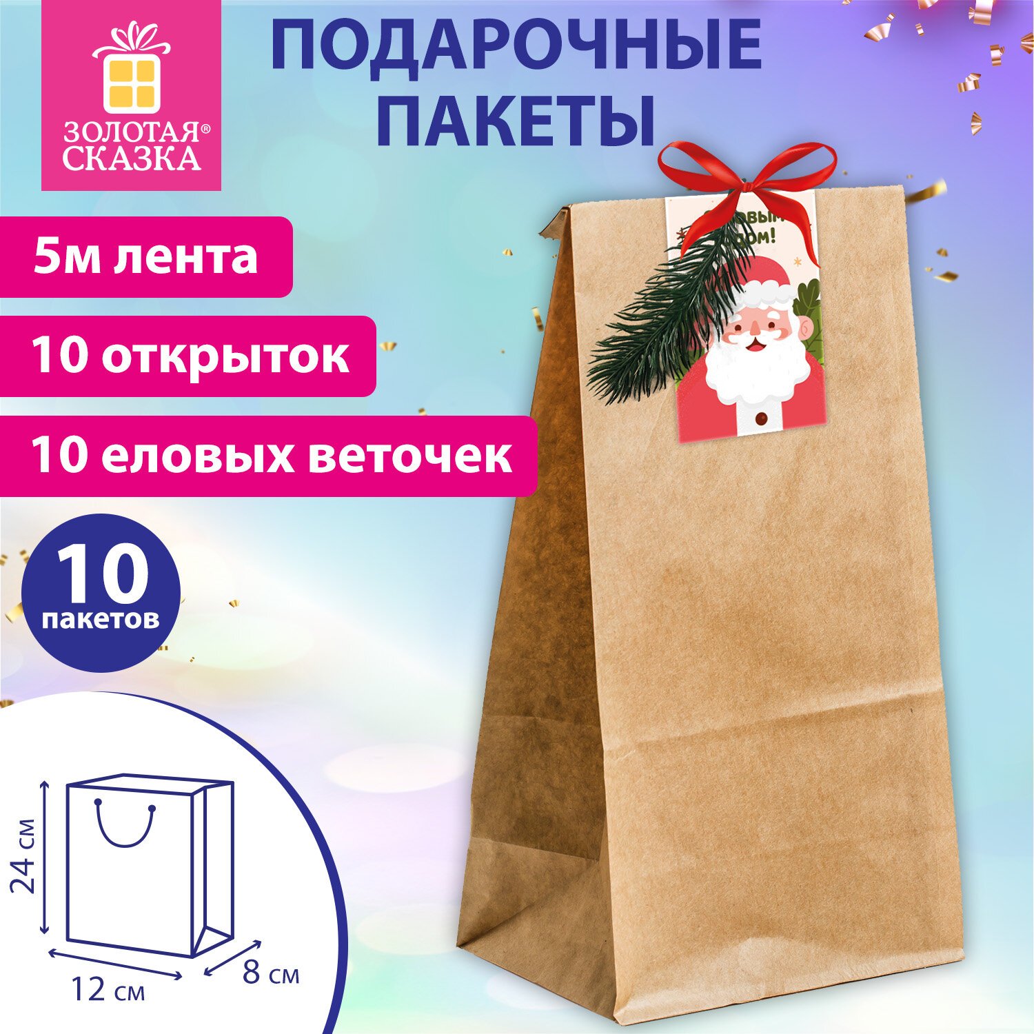 Набор пакетов изготовлен из крафт-бумаги и имеет все для идеальной упаковки! В комплекте идут 10 открыток с иллюстрациями новогодних персонажей (2 дизайна, 6х9см), 10 искусственных еловых веточек и 5-и метровая ленточка. В каждом пакете проколоты дырочки, чтобы быстро и аккуратно продеть ленточку, зафиксировать открытку и еловую веточку. Благодаря продуманному дизайну пакетов и наличию всех необходимых элементов, Вы сможете легко и быстро оформить подарок. Размер пакетов – 12х8х24см.