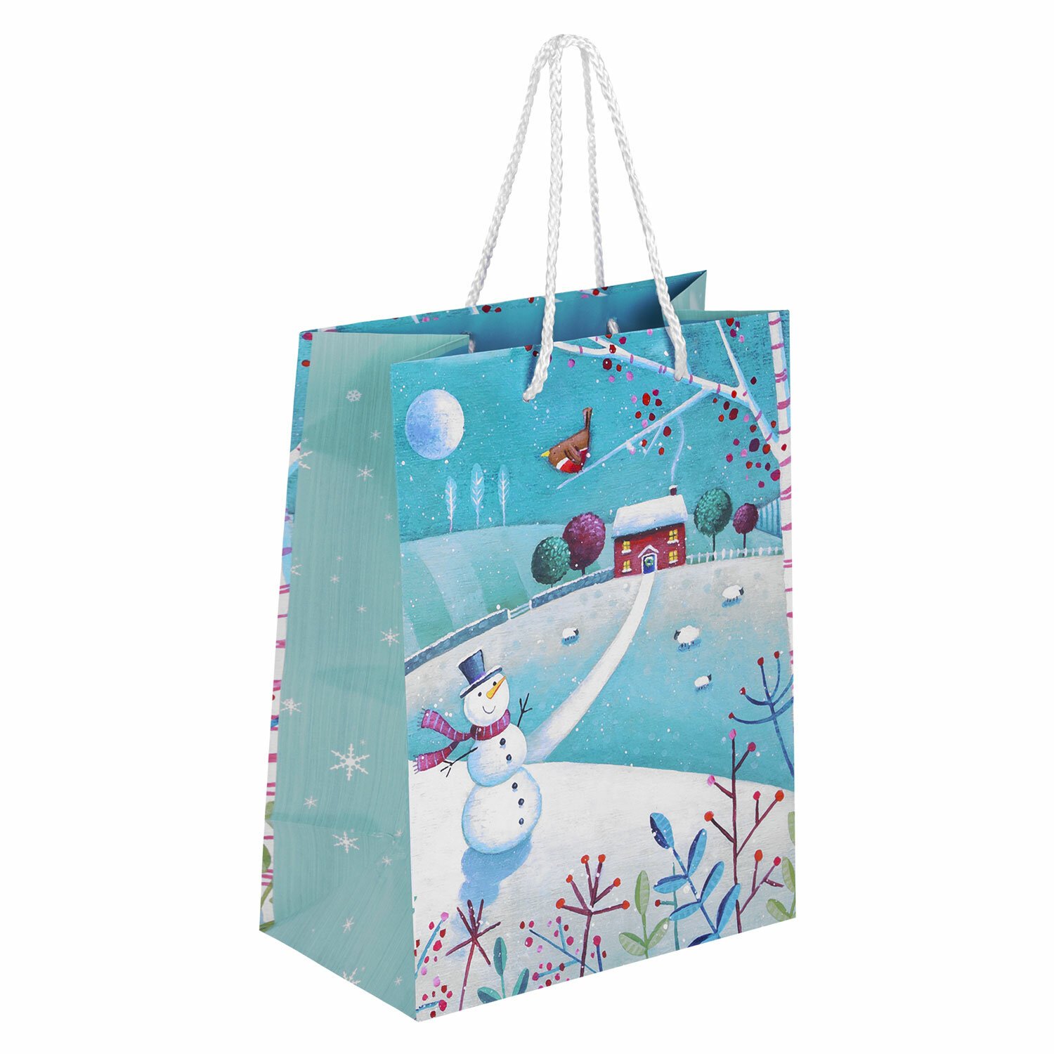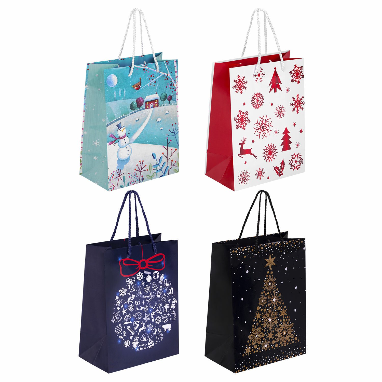 Пакет изготовлен из ламинированной мелованной бумаги с веревочными ручками из полипропилена. Размер – 18х10х23 см. В наборе – 4 пакета с изображением разных новогодних атрибутов.