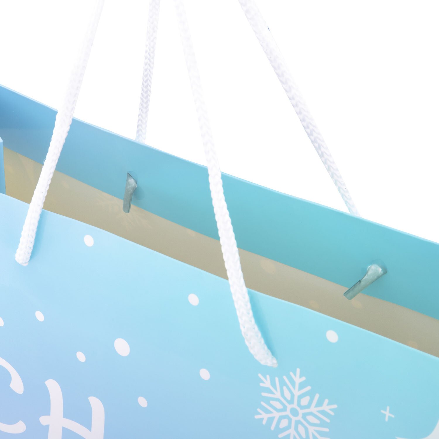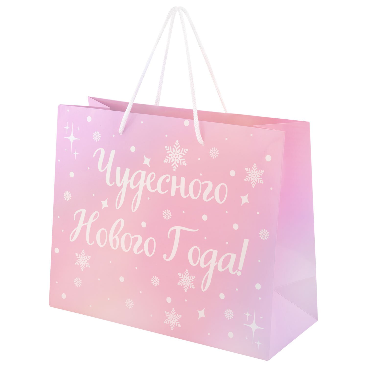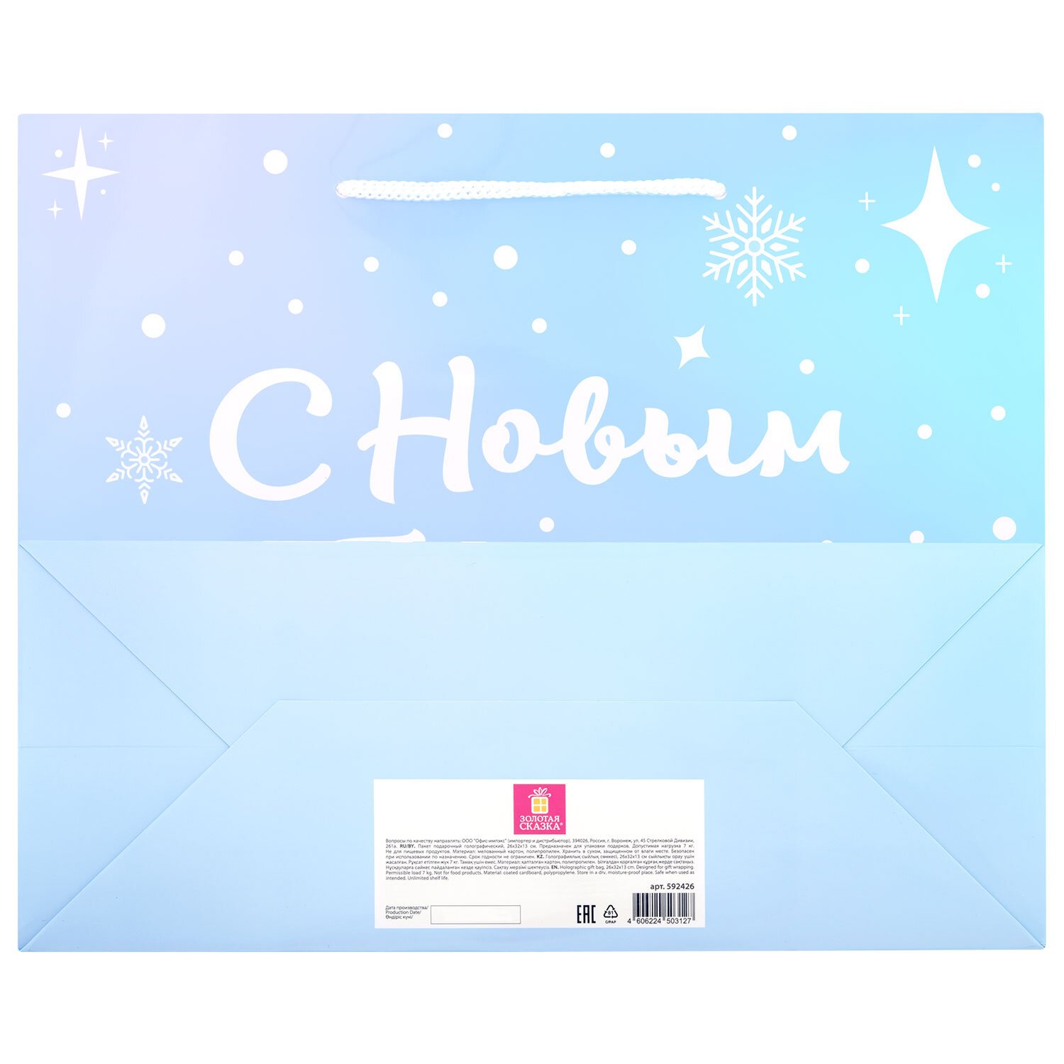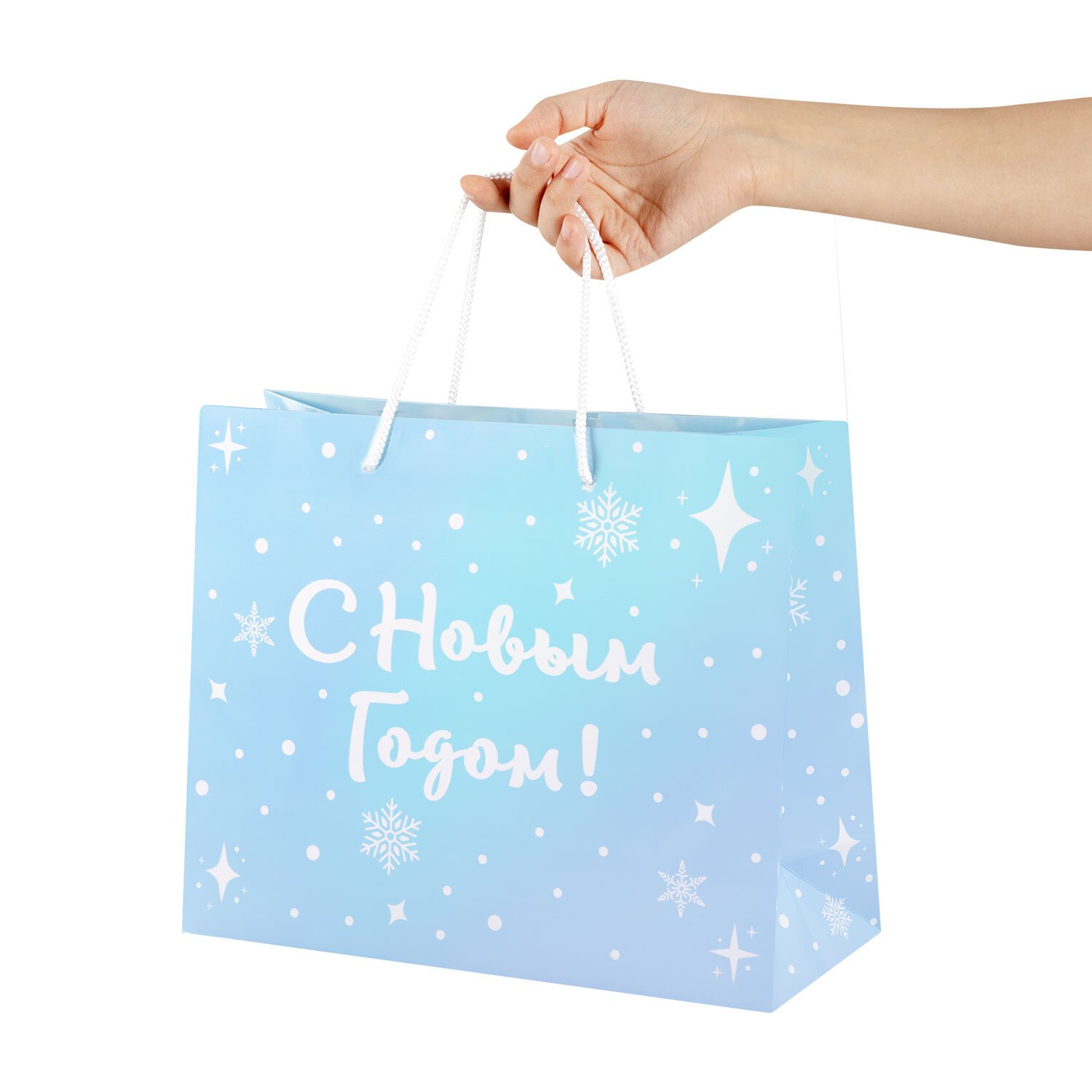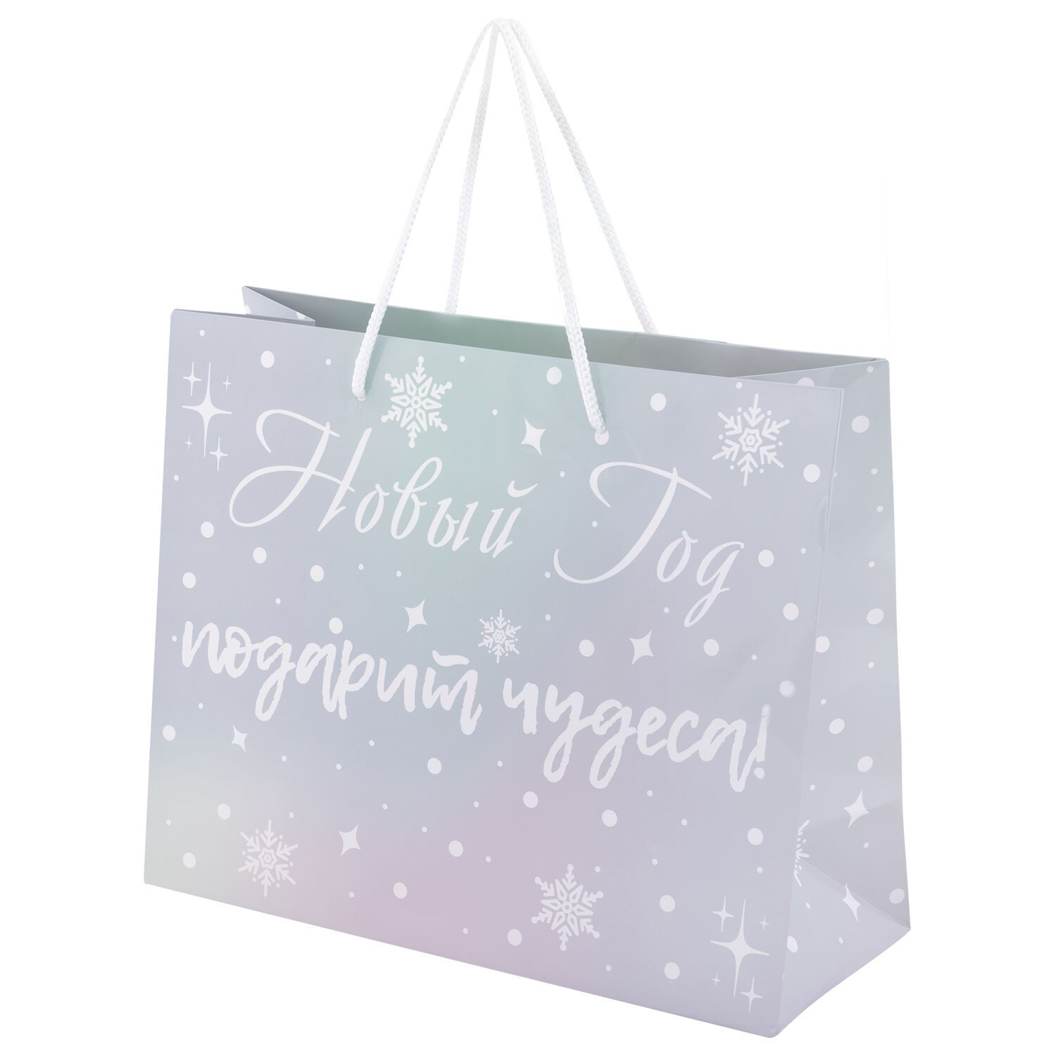 На каждом пакете написаны новогодние пожелания, что делает пакет частью поздравления. Можно просто вручить его с добрыми словами — и он всё скажет за вас. Дополнительные элементы декора — маленькие снежинки и звёздочки — создают атмосферу праздника и добавляют каждому пакету особую магию в сочетании с переливающимся голографическим эффектом. Размер – 26х13х32см.