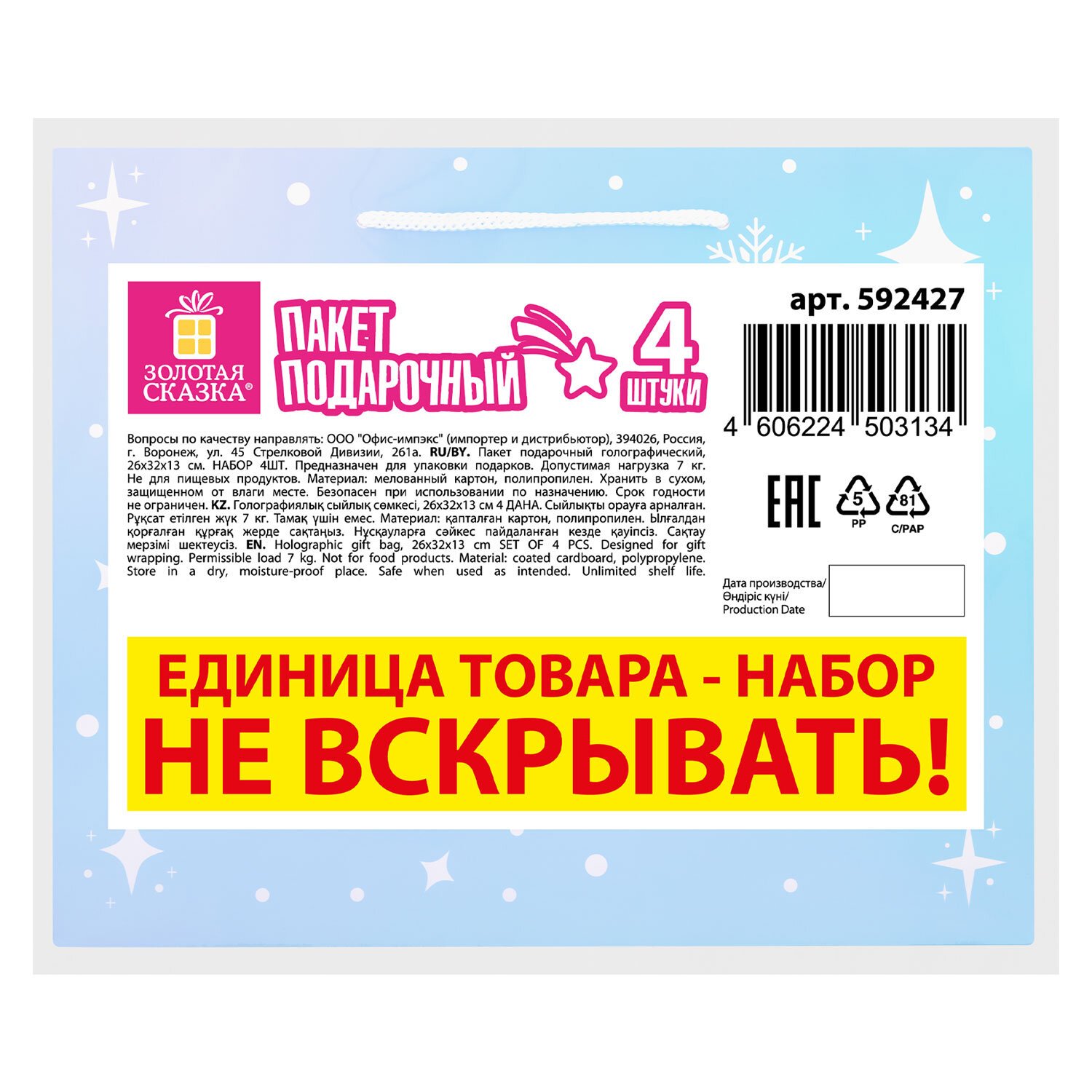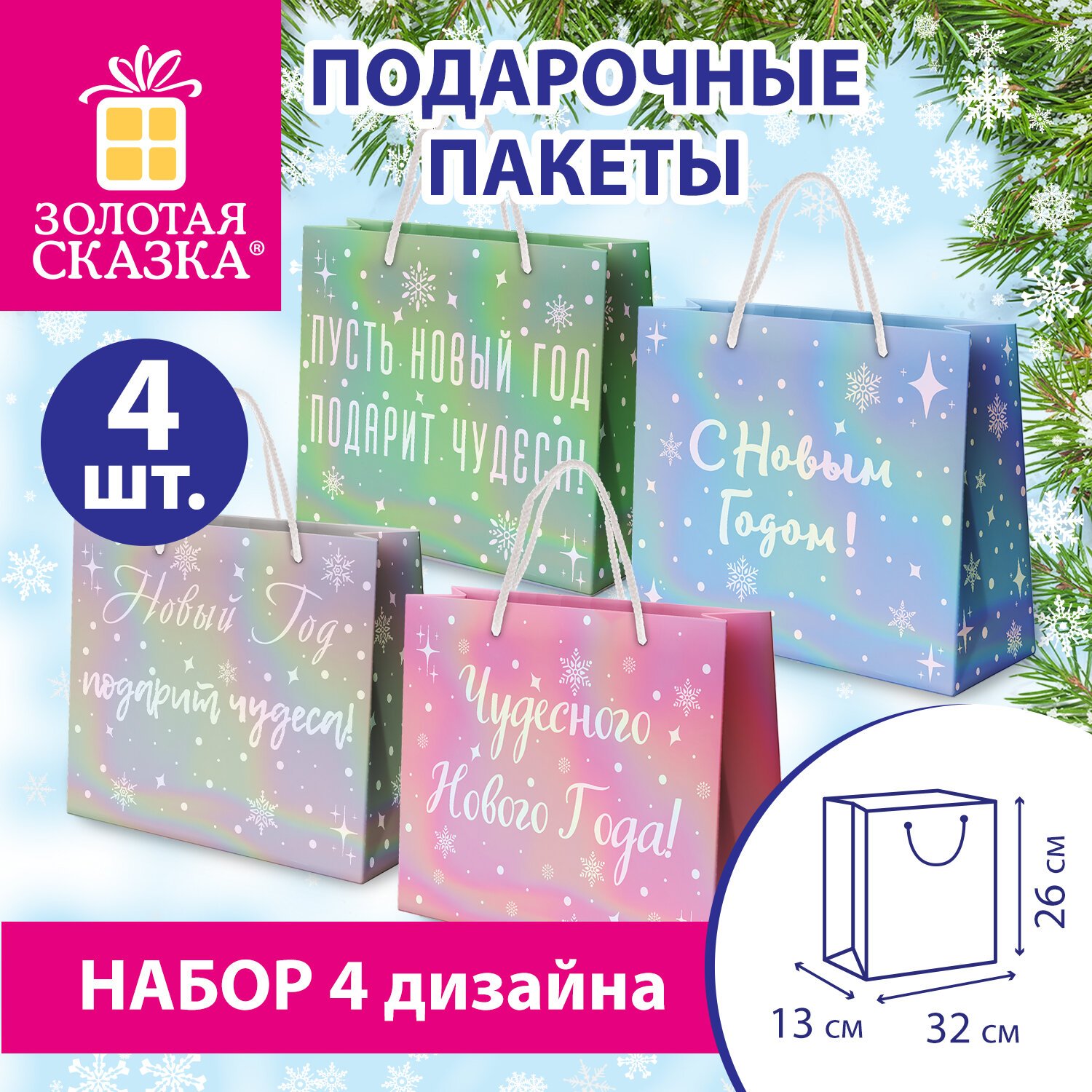 Пакет подарочный НАБОР 4 штуки, новогодний, 26х13х32см, "Сияние", голография, ЗОЛОТАЯ СКАЗКА, 592427