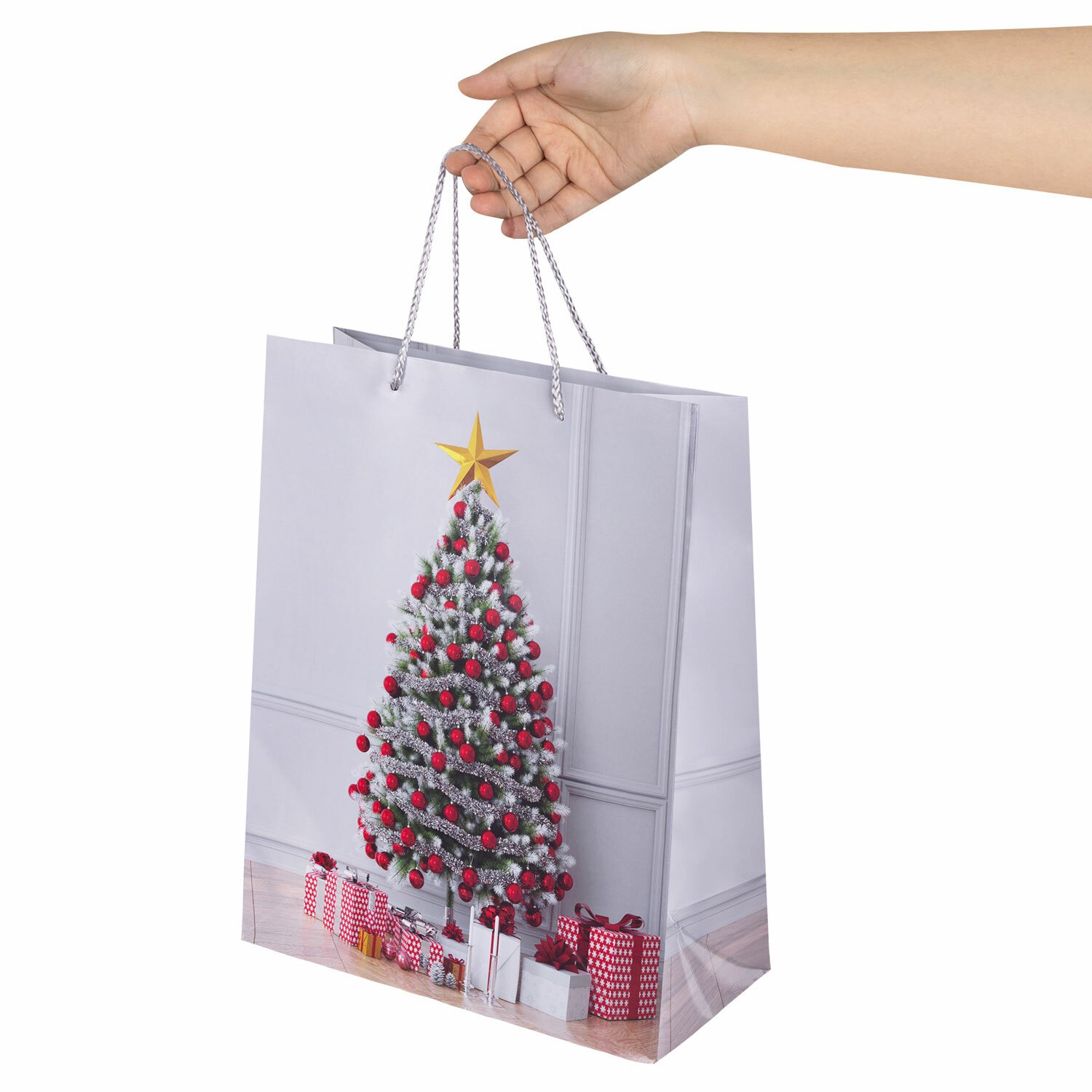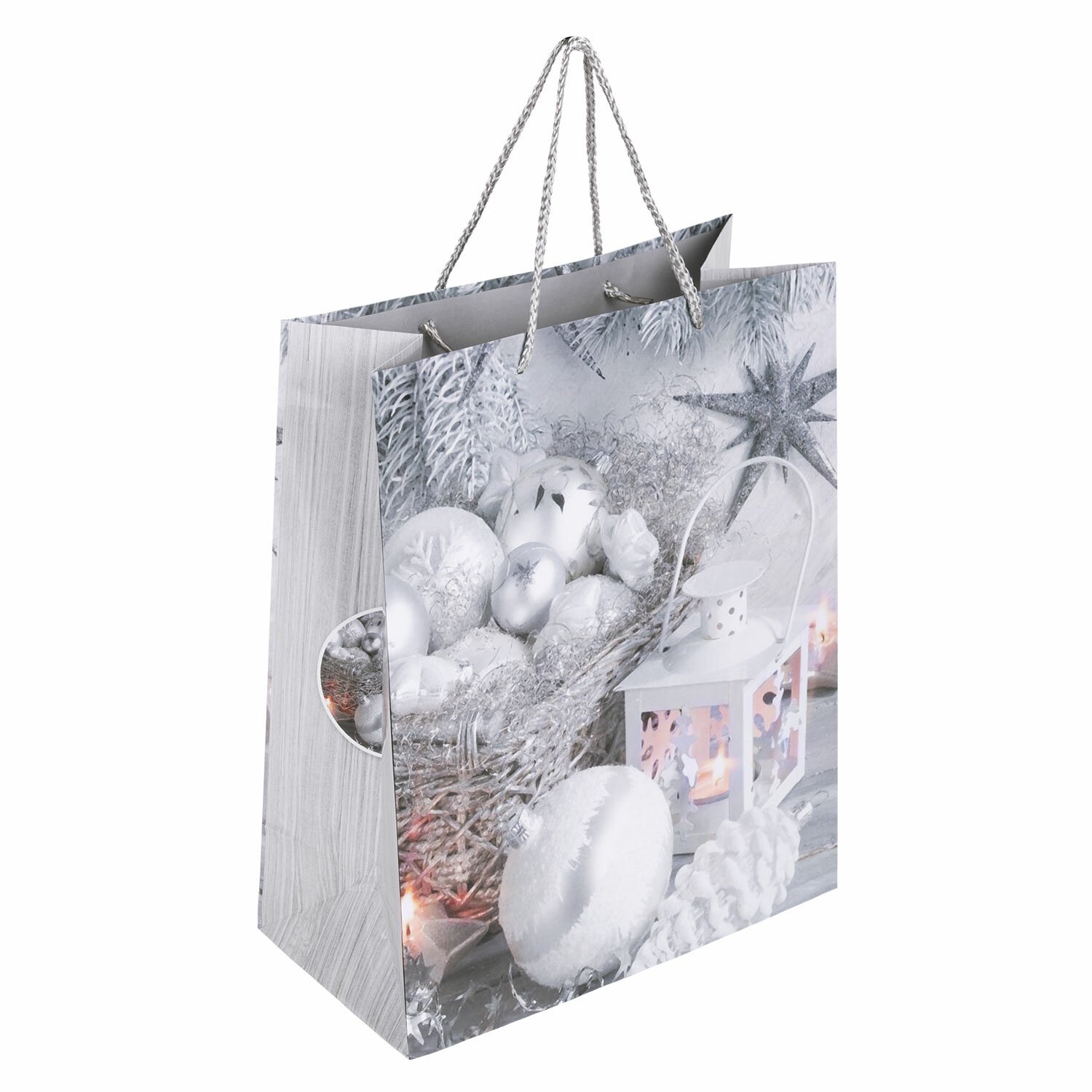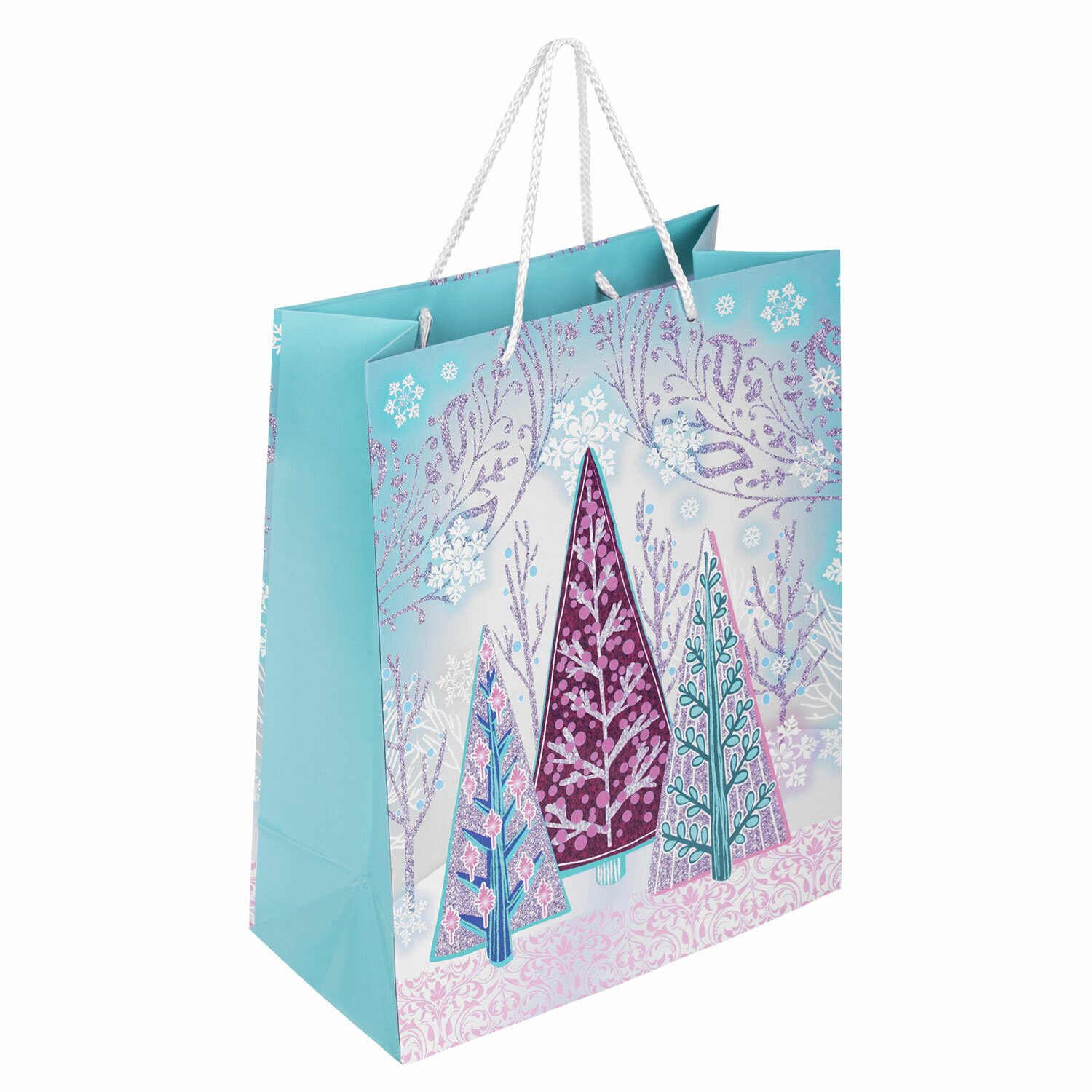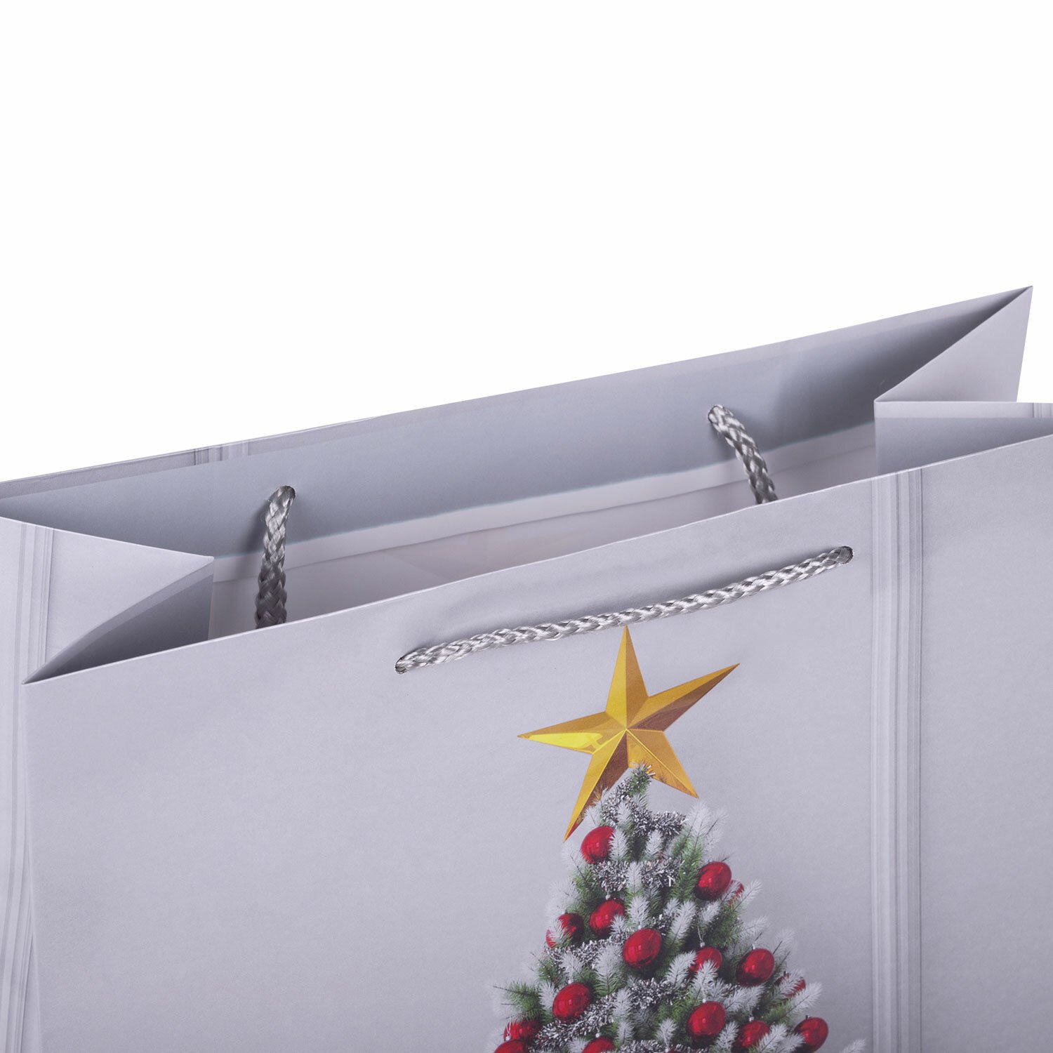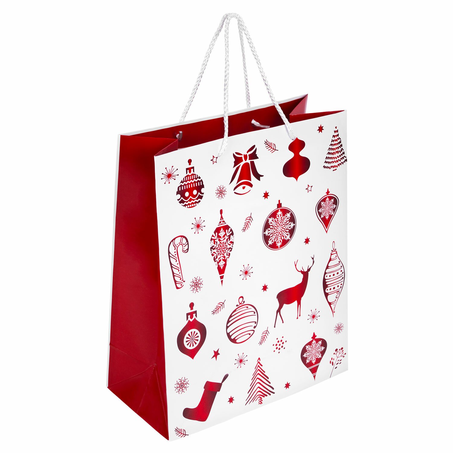 Набор подарочных пакетов изготовлен из ламинированной мелованной бумаги с веревочными ручками из полипропилена. Размер – 26x13x32 см. Пакет выполнен с изображением новогодних атрибутов.