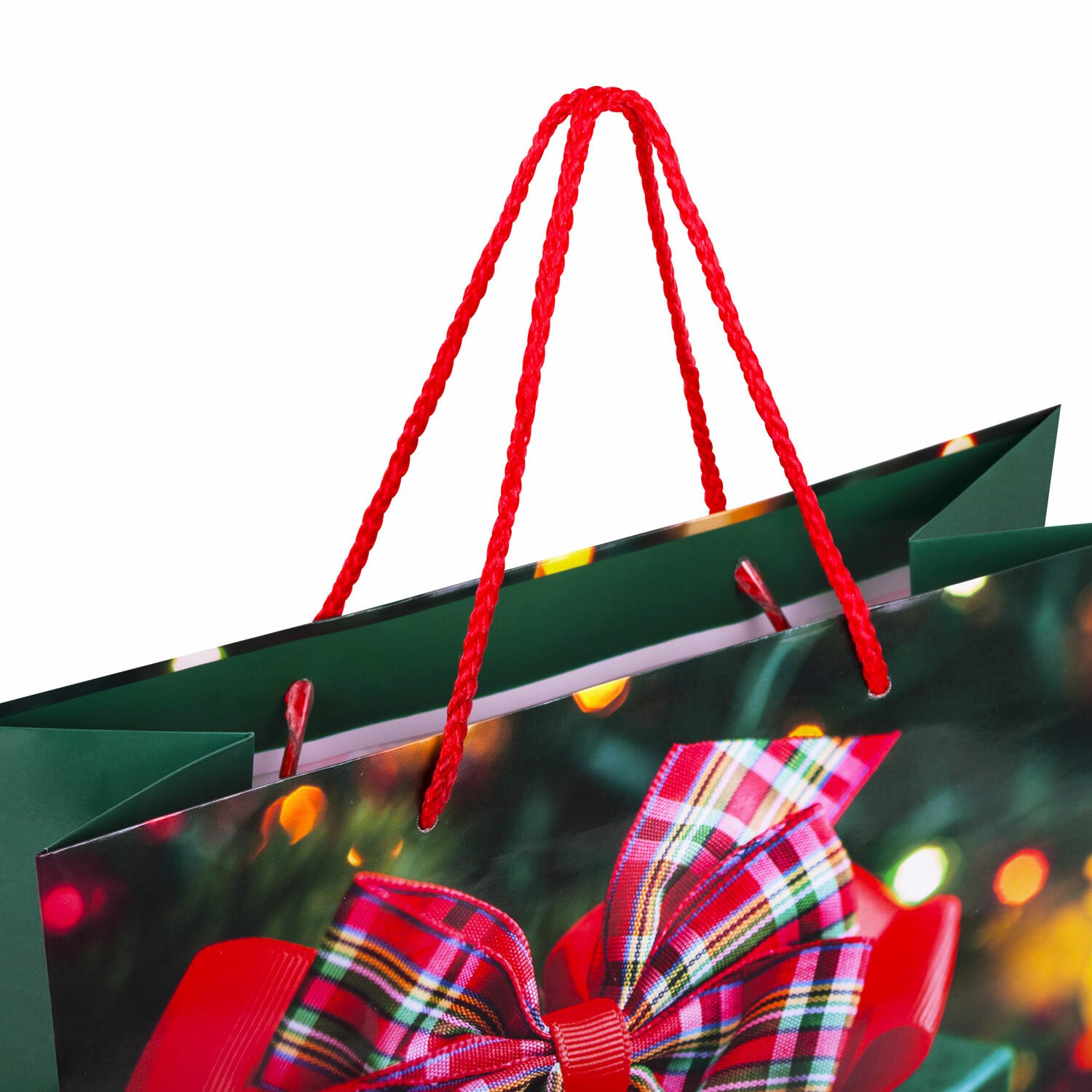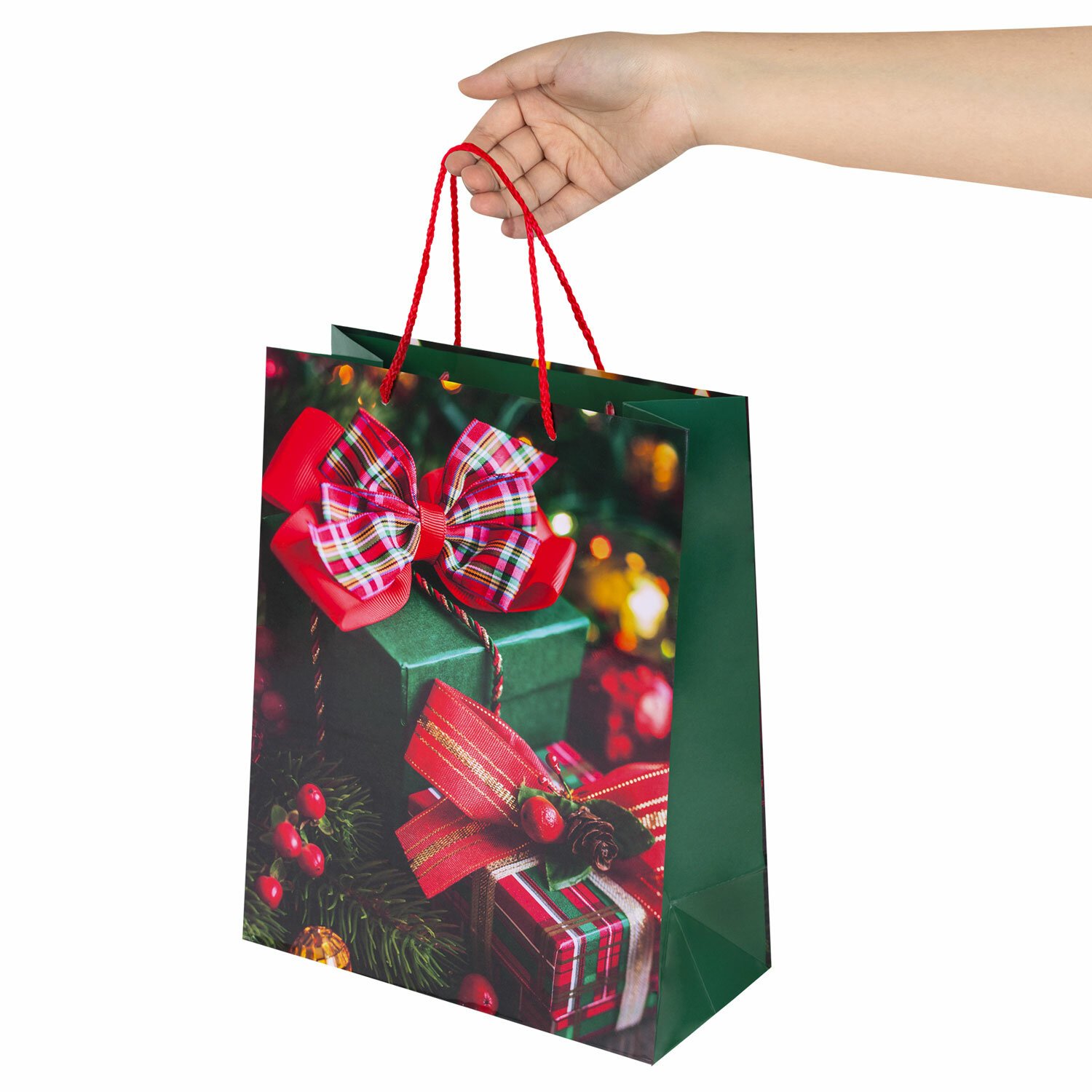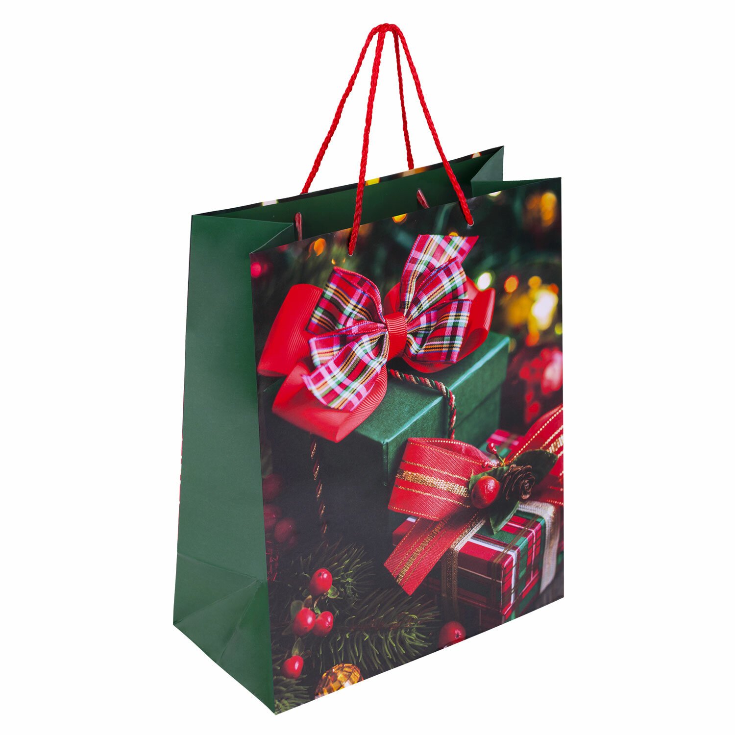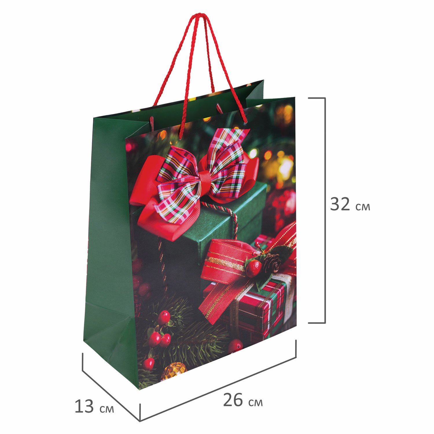 Набор подарочных пакетов изготовлен из ламинированной мелованной бумаги с веревочными ручками из полипропилена. Размер – 26x13x32 см. Пакет выполнен с изображением новогодних атрибутов.