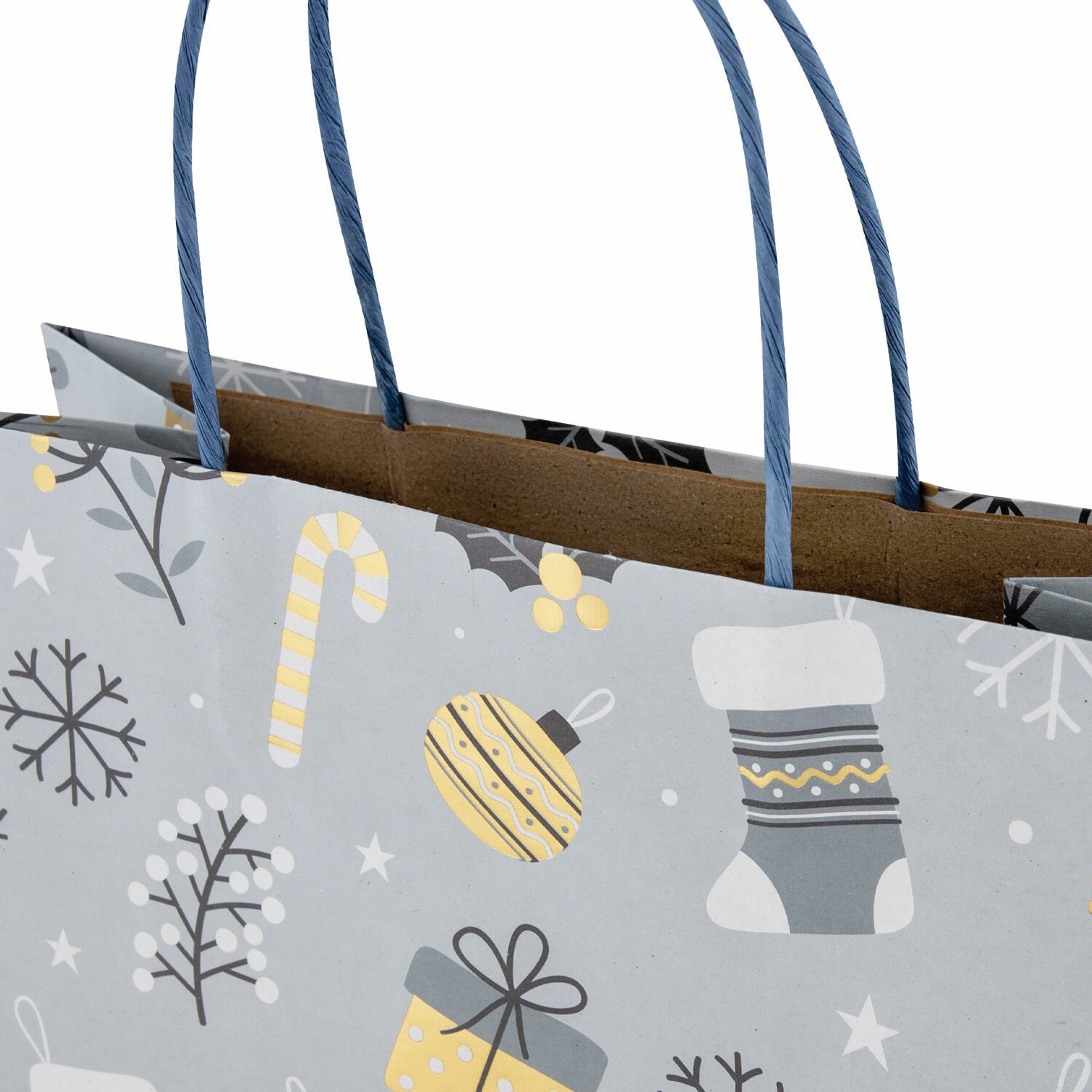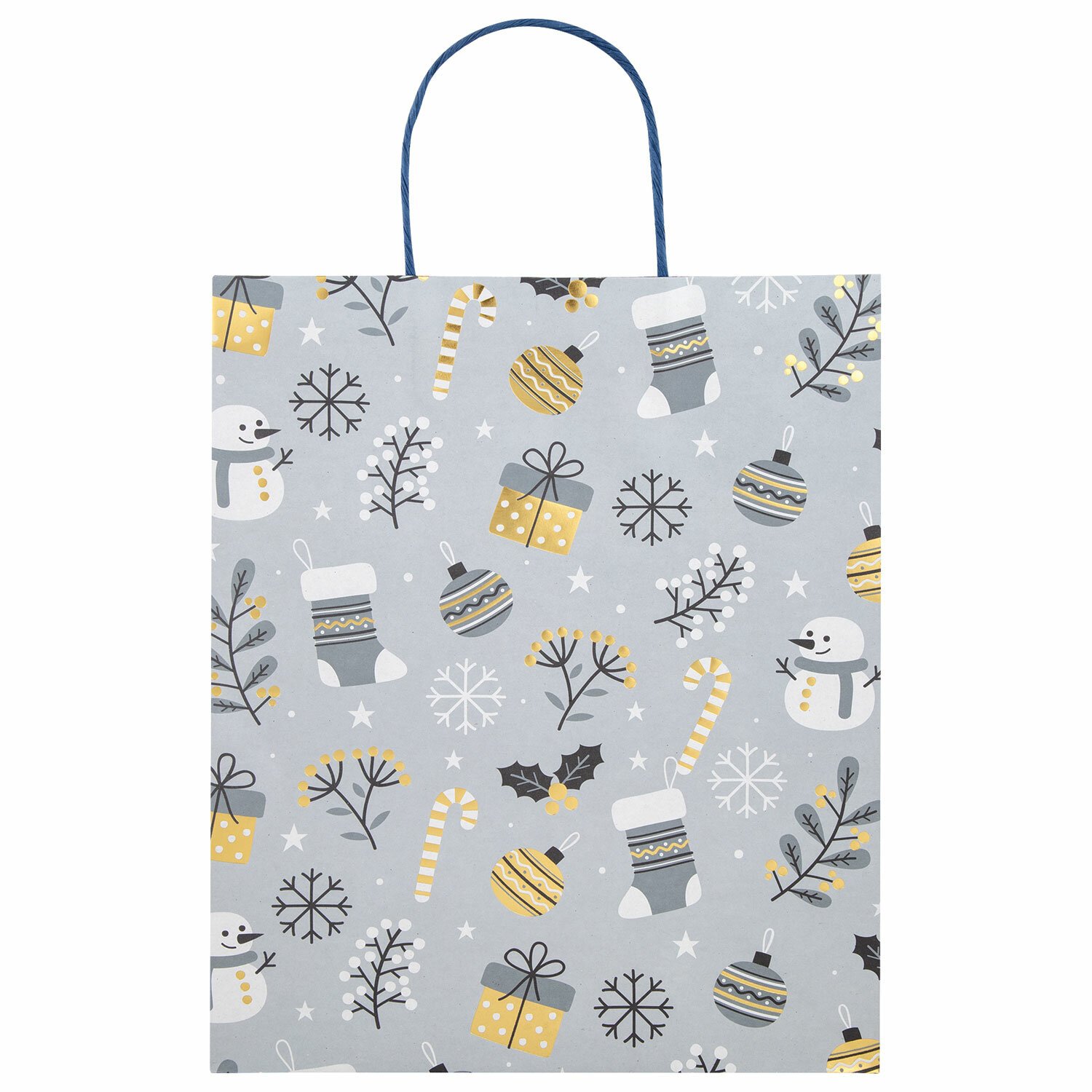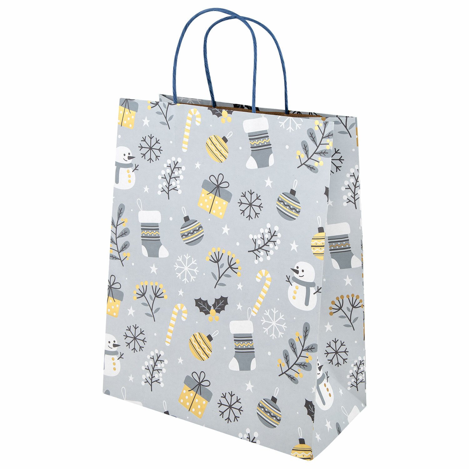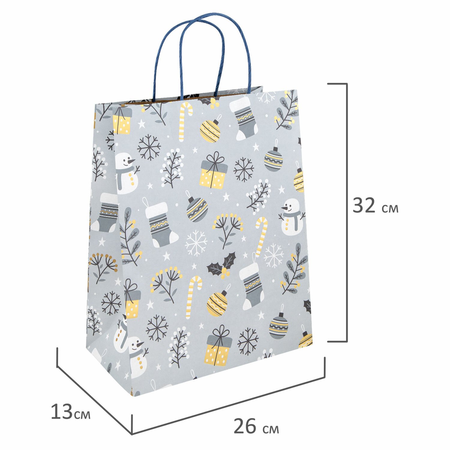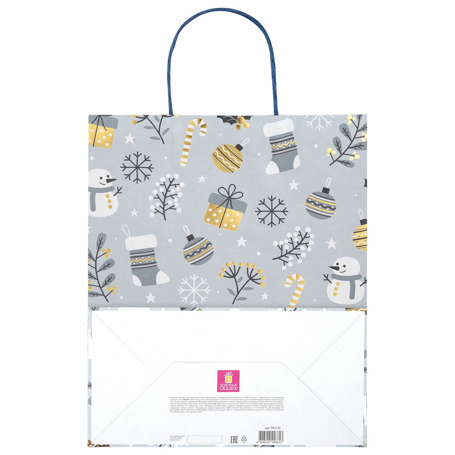 Подарочный пакет новогодний изготовлен из крафт-бумаги, снабжен бумажными ручками. Размер – 26x32x13 см. Пакет украшен изображением новогодних атрибутов. С лицевой стороны пакета некоторые детали покрыты тиснением золотистой фольгой.