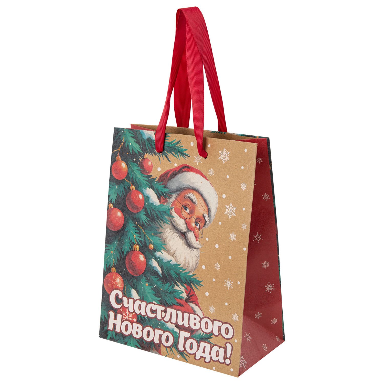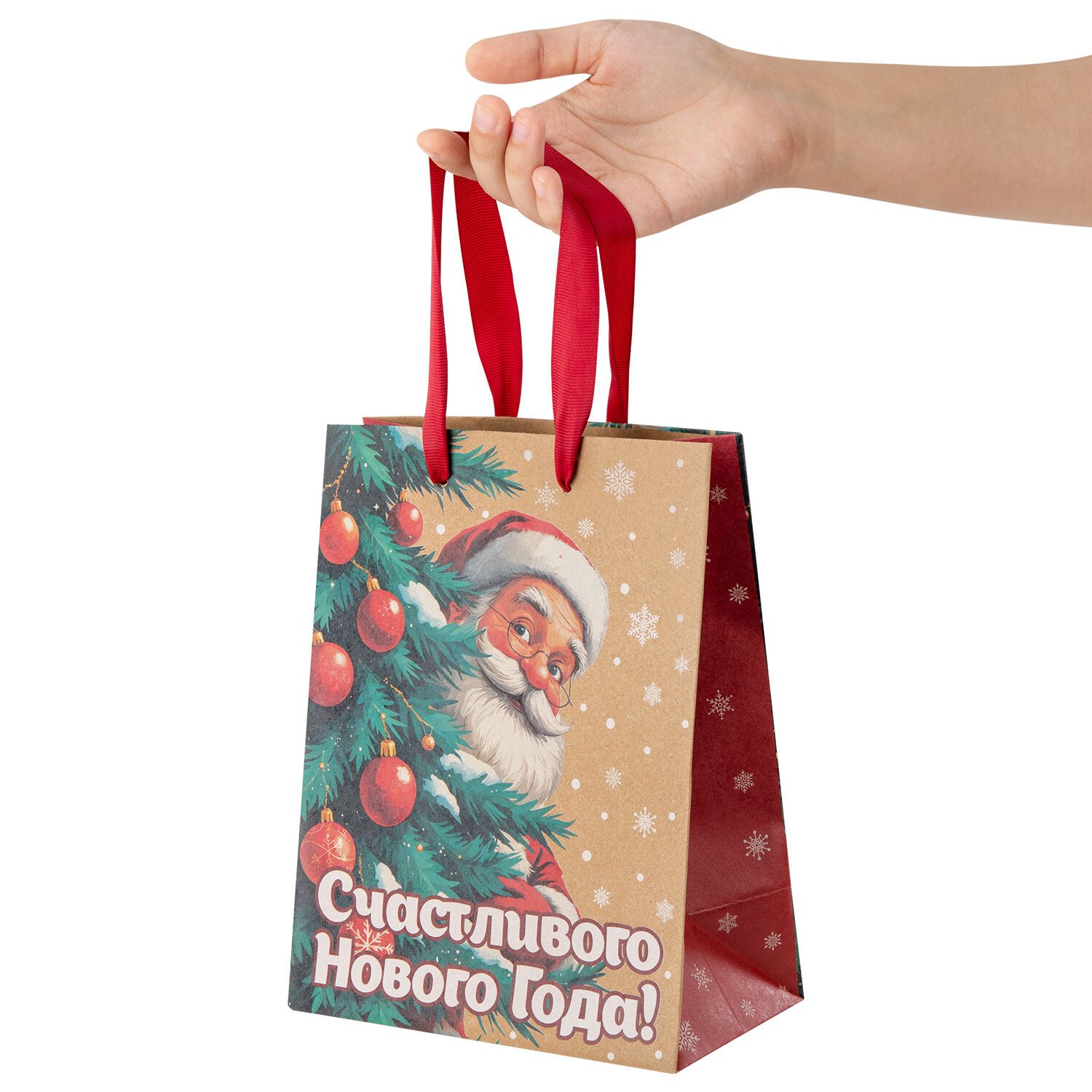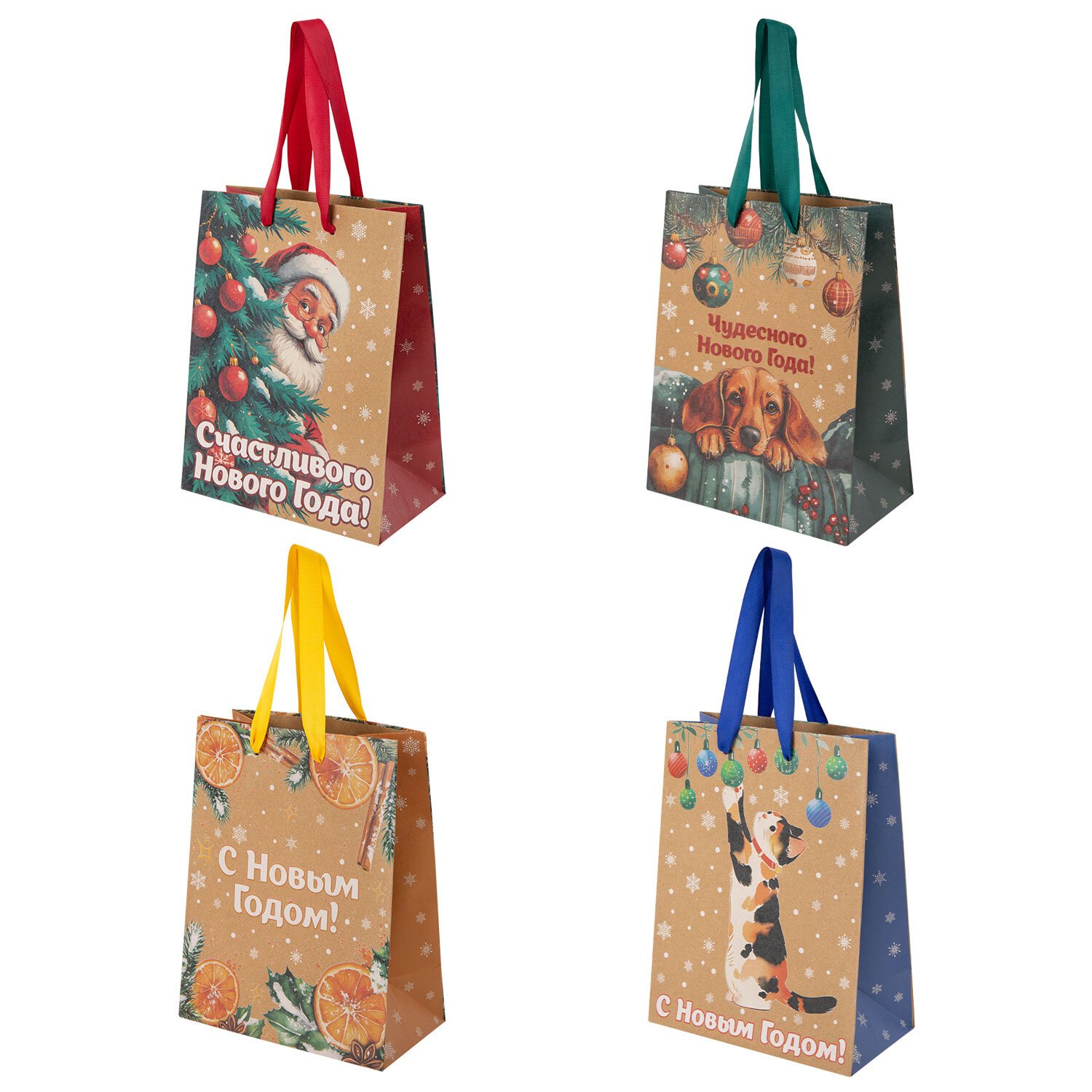 Набор подарочных новогодних пакетов изготовлен из крафт-бумаги, снабжен ленточными ручками из полиэстера. Размер – 18х10х23см. На пакетах изображены иллюстрации в новогодней тематике и поздравительные надписи, которые точно вызовут улыбку.