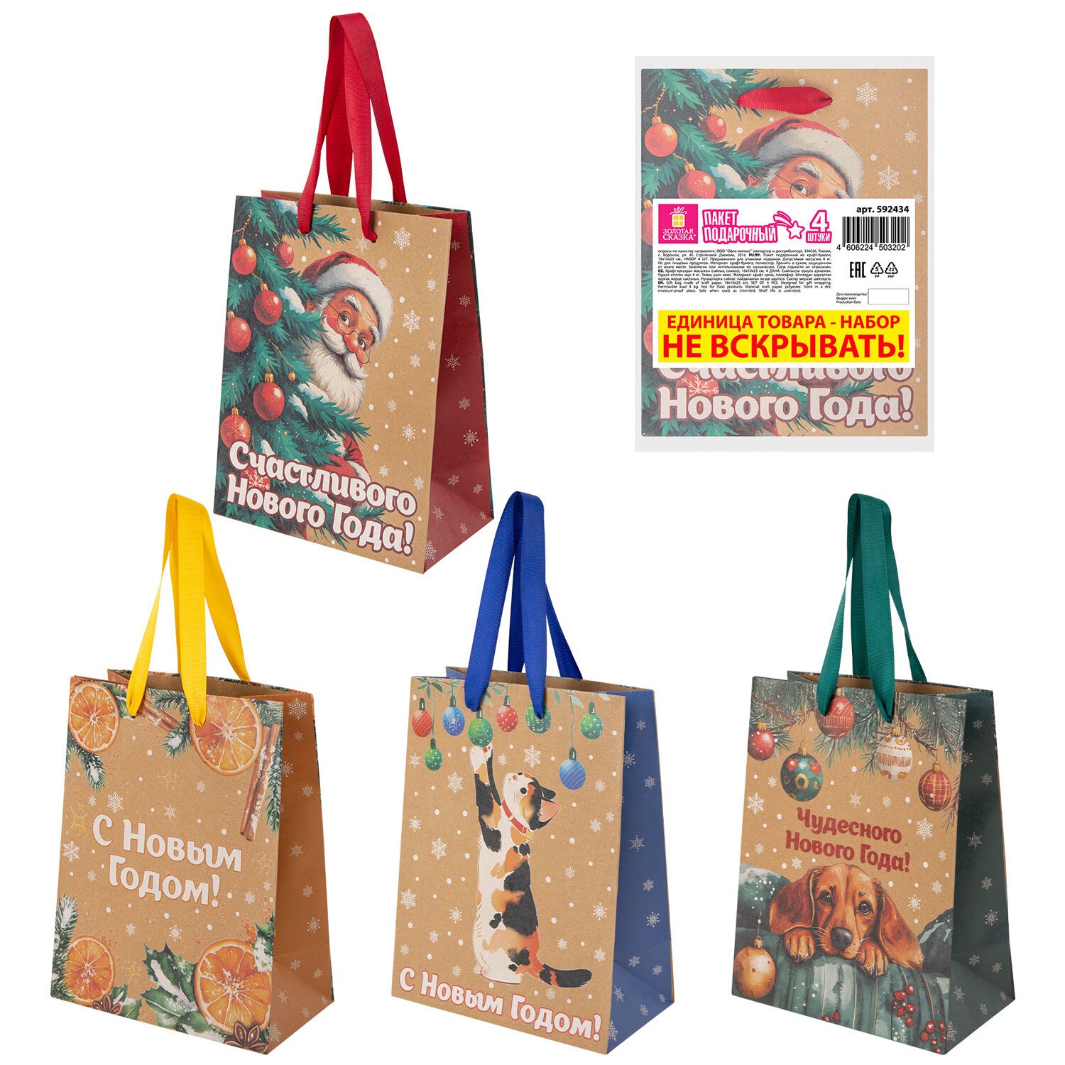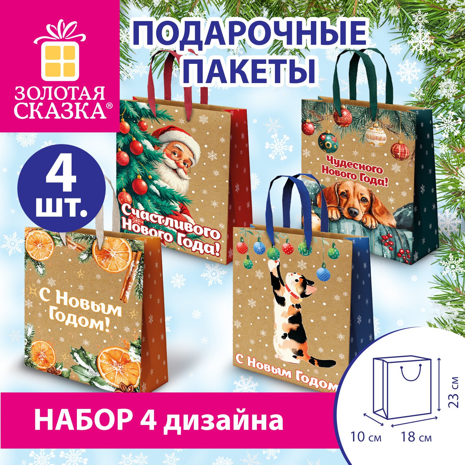 Пакет подарочный НАБОР 4шт новогодний, 18х10х23см, "Зимнее волшебство", крафт, ЗОЛОТАЯ СКАЗКА 592434