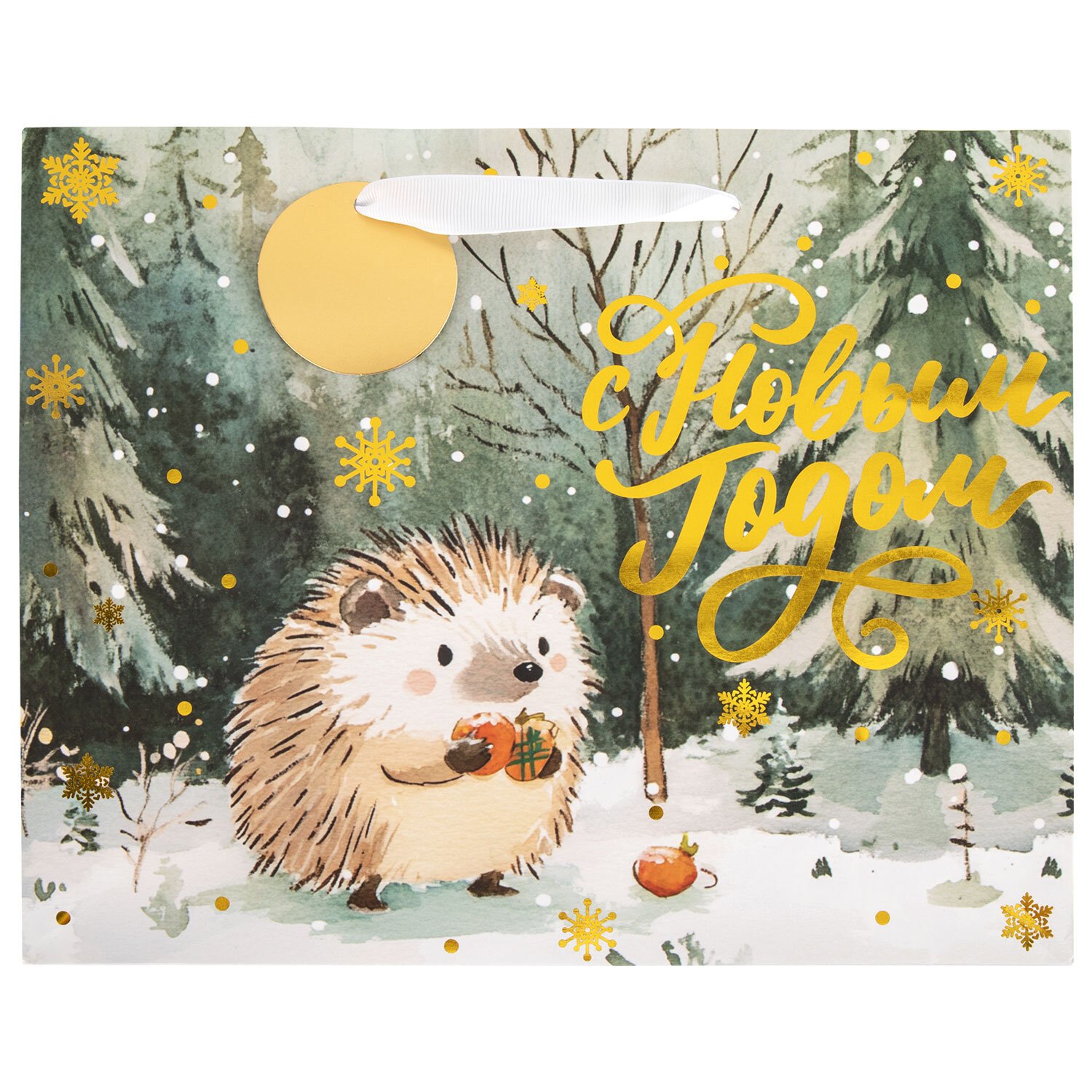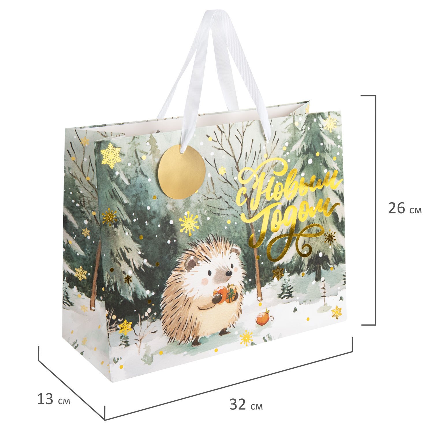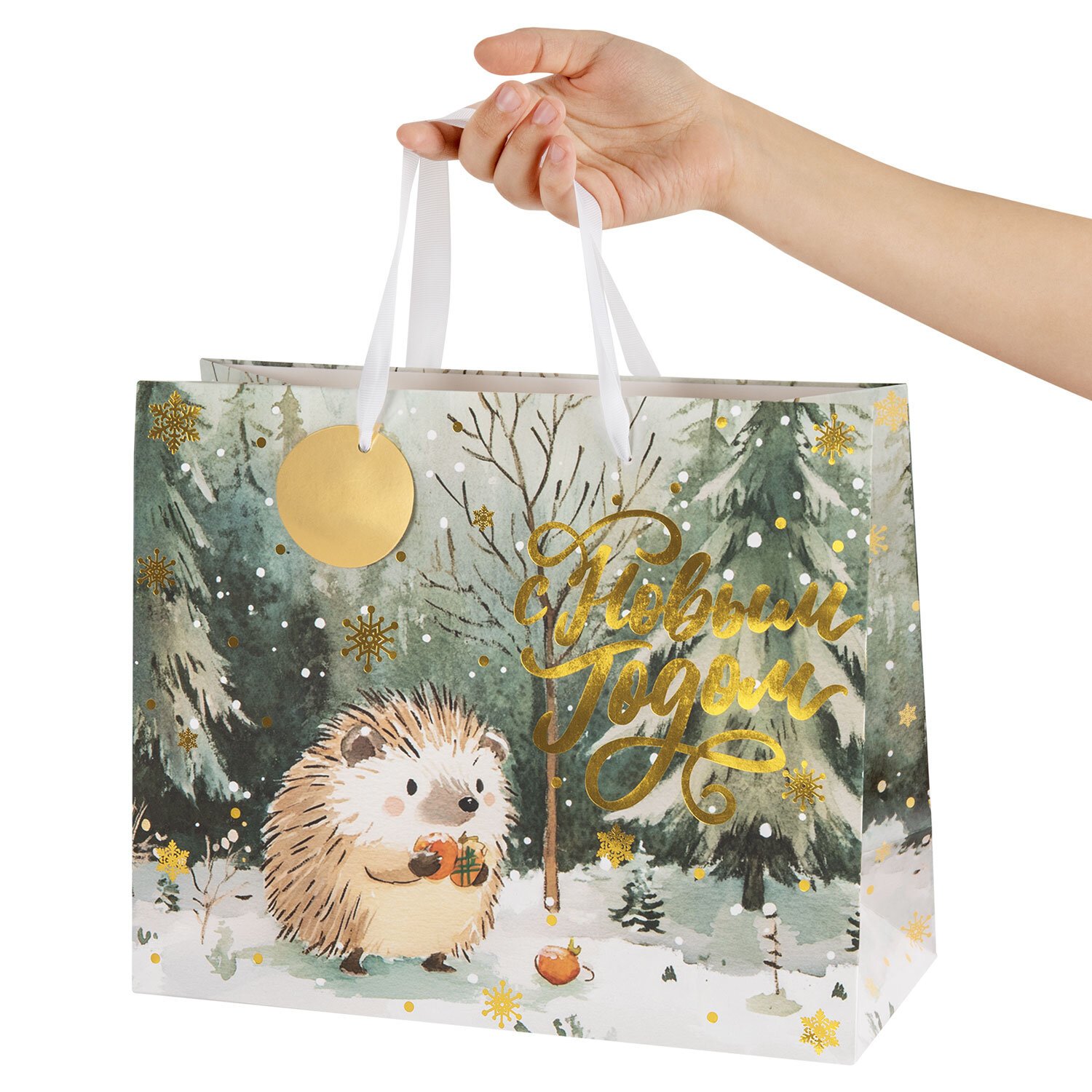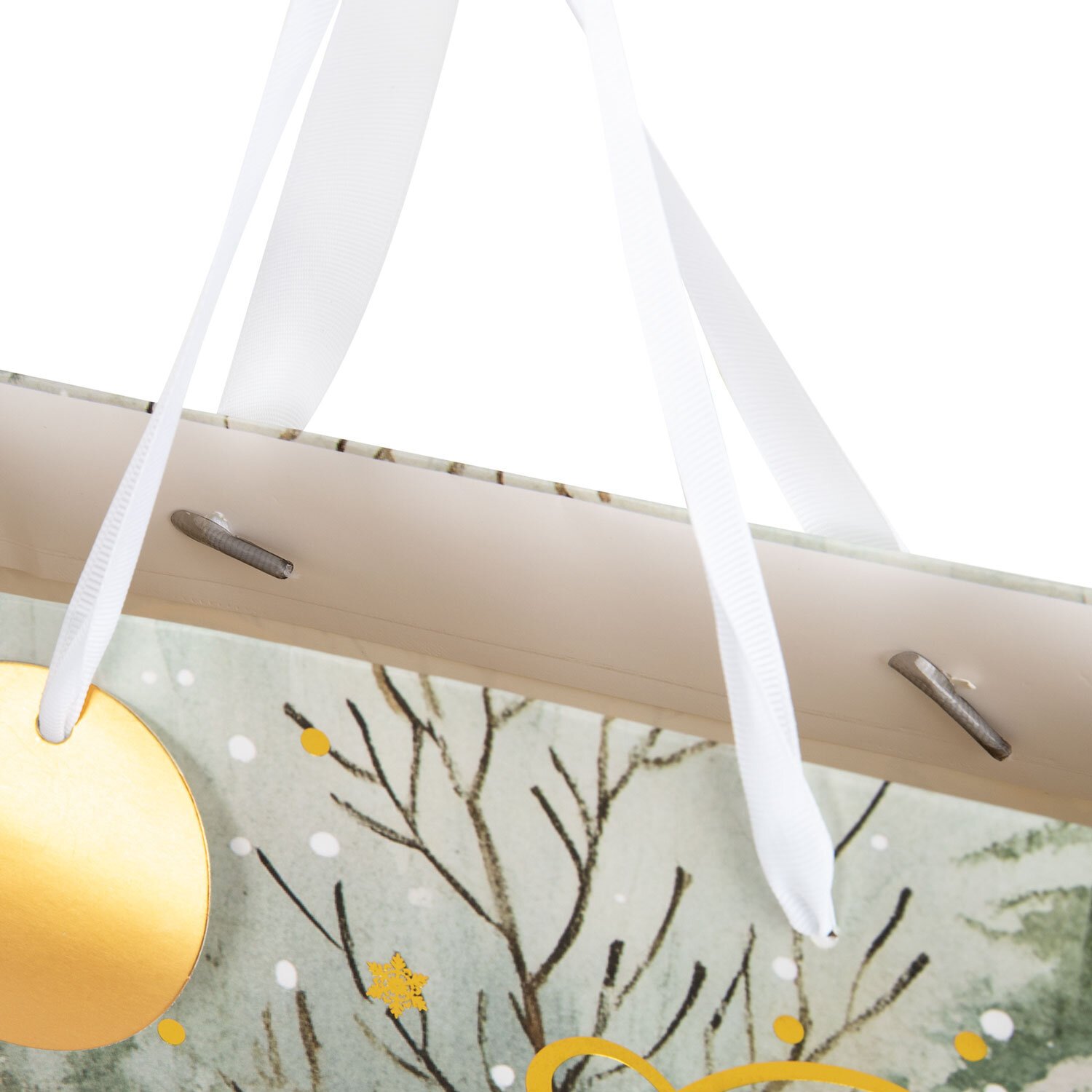 Подарочный пакет новогодний изготовлен из ламинированного мелованного картона, снабжен ленточными ручками из полиэстера. К каждому пакету прикреплен круглый хэнгтэг, на обратной стороне которого можно оставить свои теплые пожелания, сделав подарок еще ближе и трогательнее. А лицевая сторона хэнгтэга покрыта золотистой фольгой, что делает его ярким завершающим акцентом. Пакеты украшены акварельными иллюстрациями с зимними пейзажами и новогодними атрибутами. С лицевой стороны пакета некоторые детали покрыты тиснением золотистой и серебристой фольгой. Размер – 26x13x32 см.