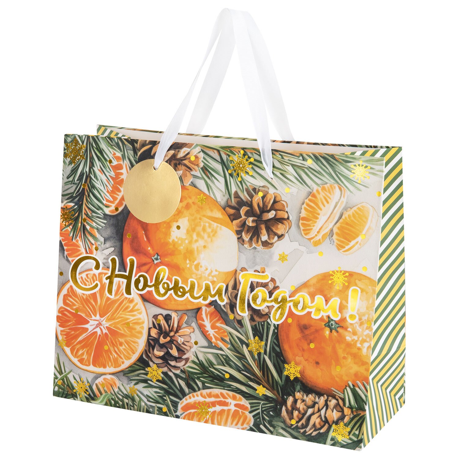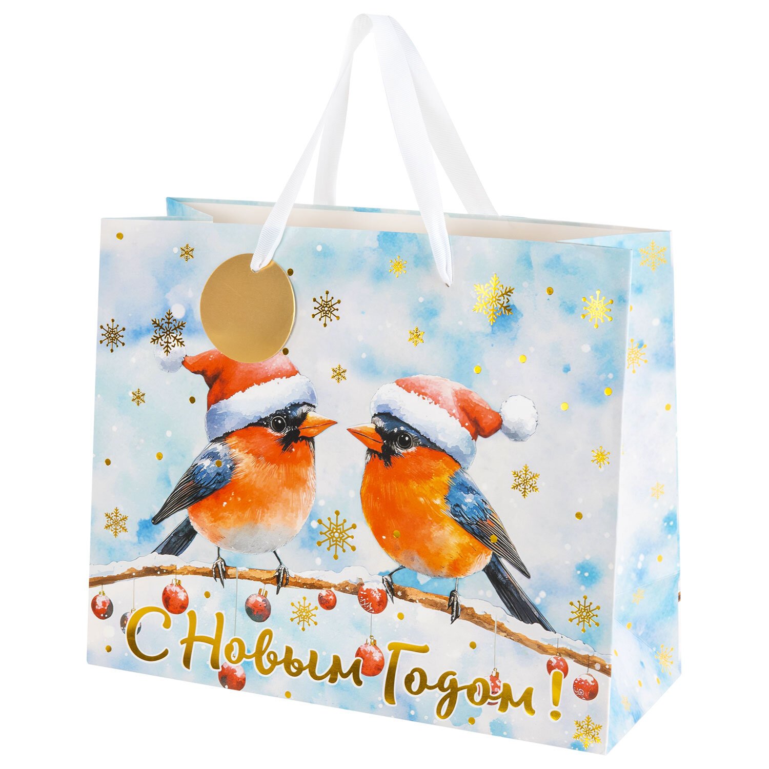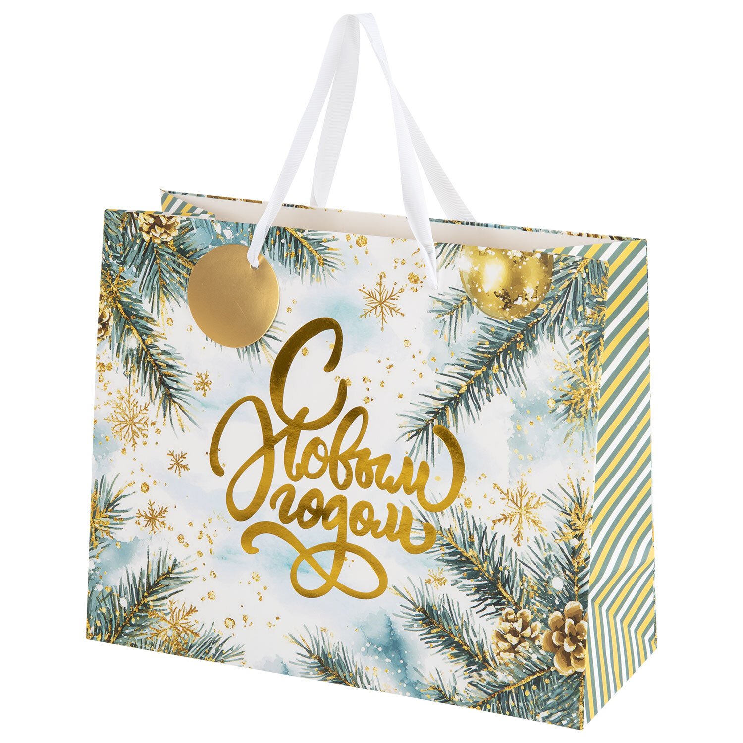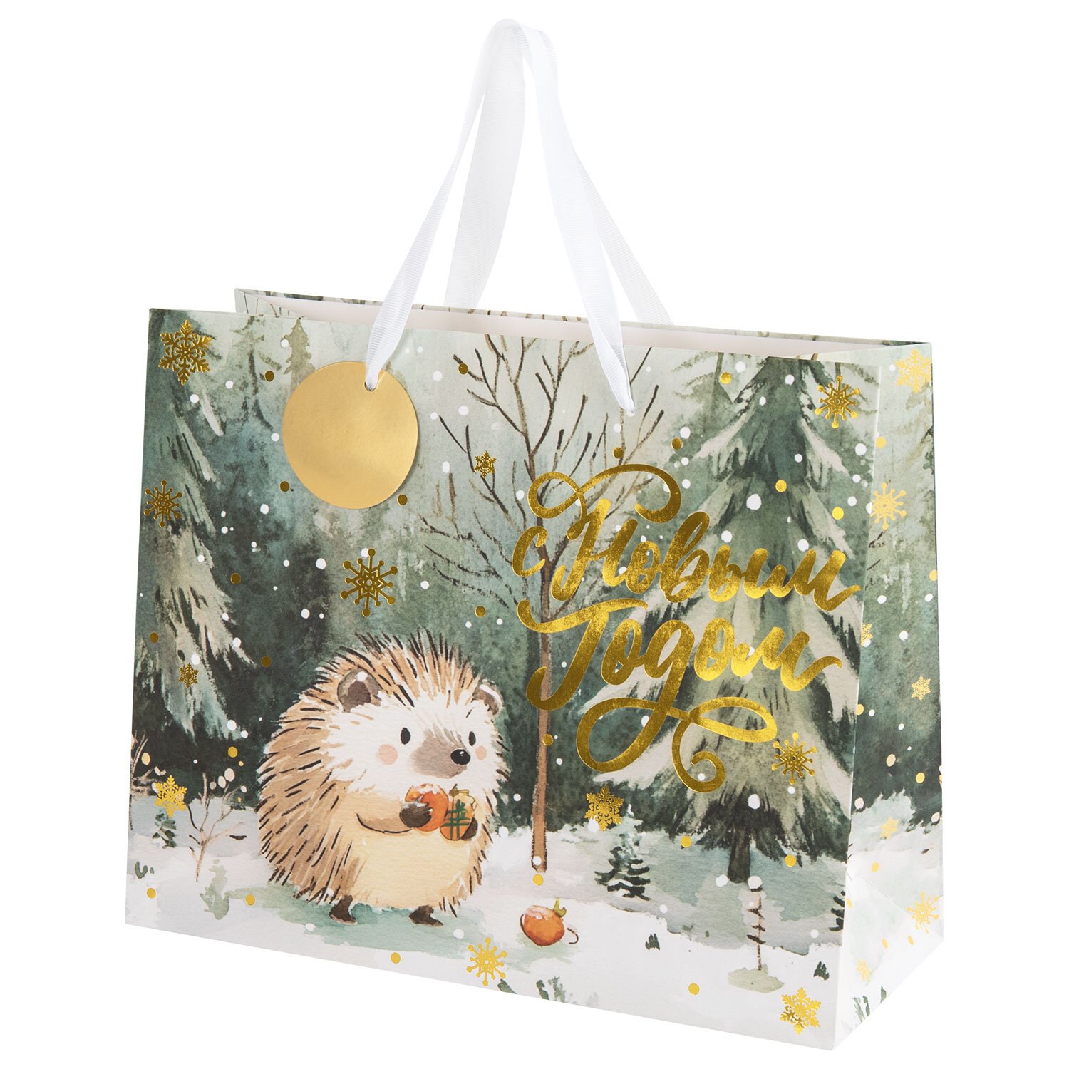 Подарочный пакет новогодний изготовлен из ламинированного мелованного картона, снабжен ленточными ручками из полиэстера. К каждому пакету прикреплен круглый хэнгтэг, на обратной стороне которого можно оставить свои теплые пожелания, сделав подарок еще ближе и трогательнее. А лицевая сторона хэнгтэга покрыта золотистой фольгой, что делает его ярким завершающим акцентом. Пакеты украшены акварельными иллюстрациями с зимними пейзажами и новогодними атрибутами. С лицевой стороны пакета некоторые детали покрыты тиснением золотистой и серебристой фольгой. Размер – 26x13x32 см.