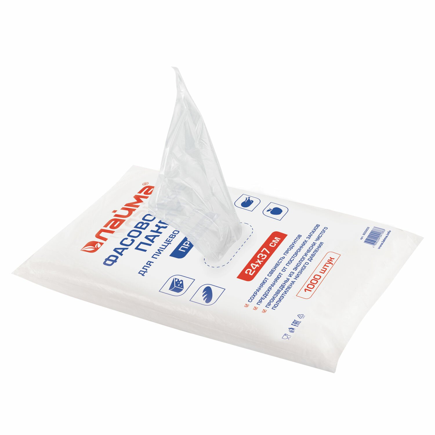 Обладают высокой эластичностью и прочностью, сохраняют свежесть продуктов, предохраняют содержимое от посторонних запахов. Прозрачные фасовочные пакеты плотностью 10 мкм в экономичной евроупаковке на 1000 штук изготовлены из экологически чистого ПНД (полиэтилена низкого давления). Размер - 24 х 37 см.