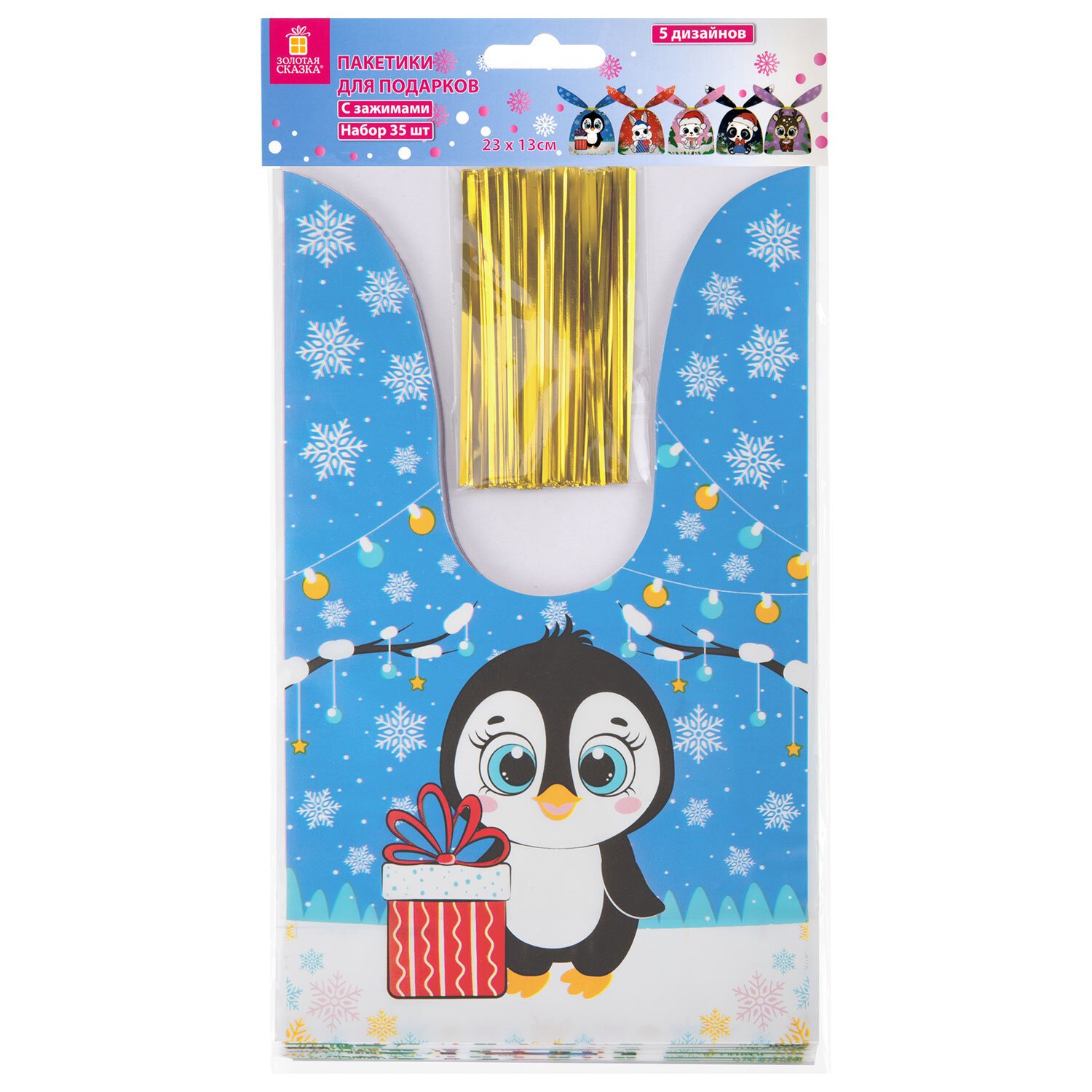 Пакетик подарочный НАБОР 35 штук, новогодний, 13х23см, с зажимами, полиэтилен, ЗОЛОТАЯ СКАЗКА, 592423