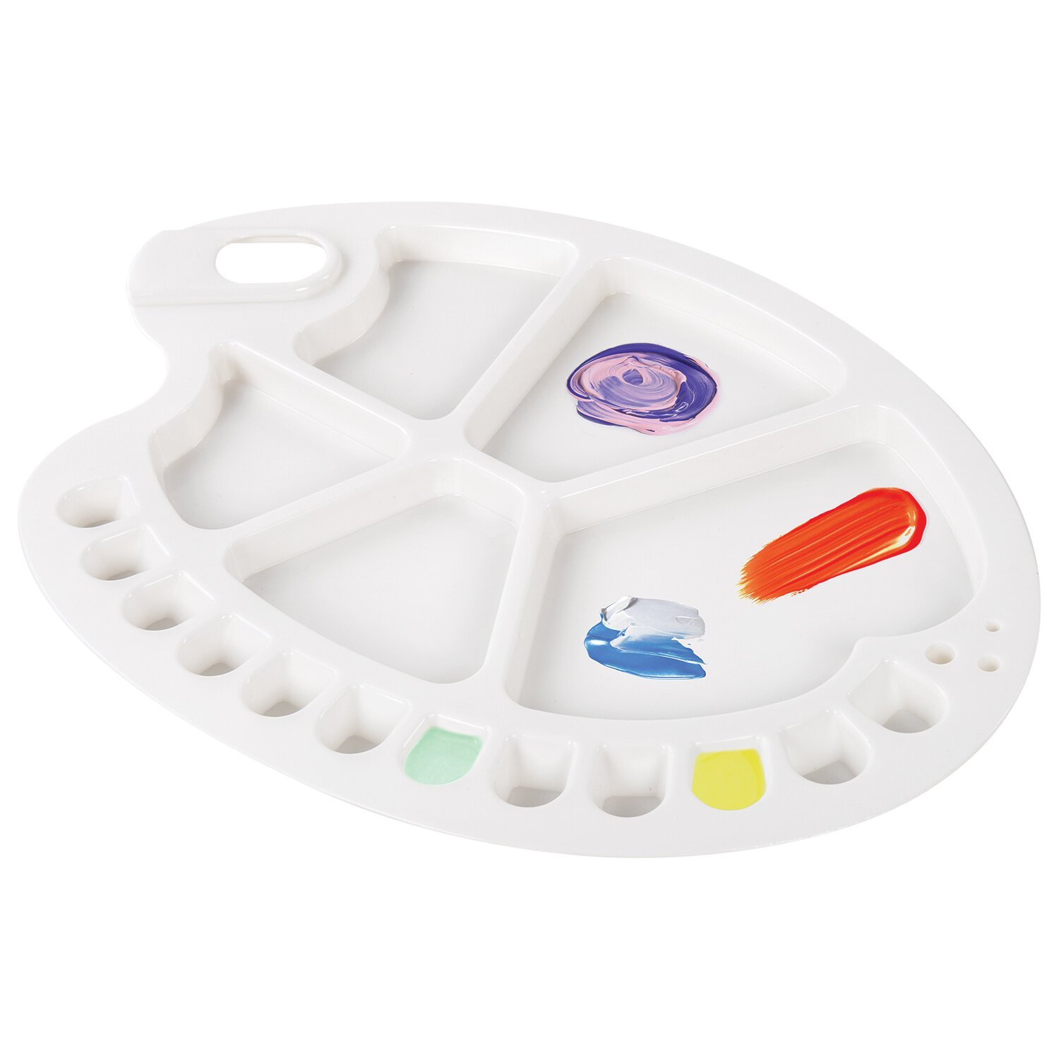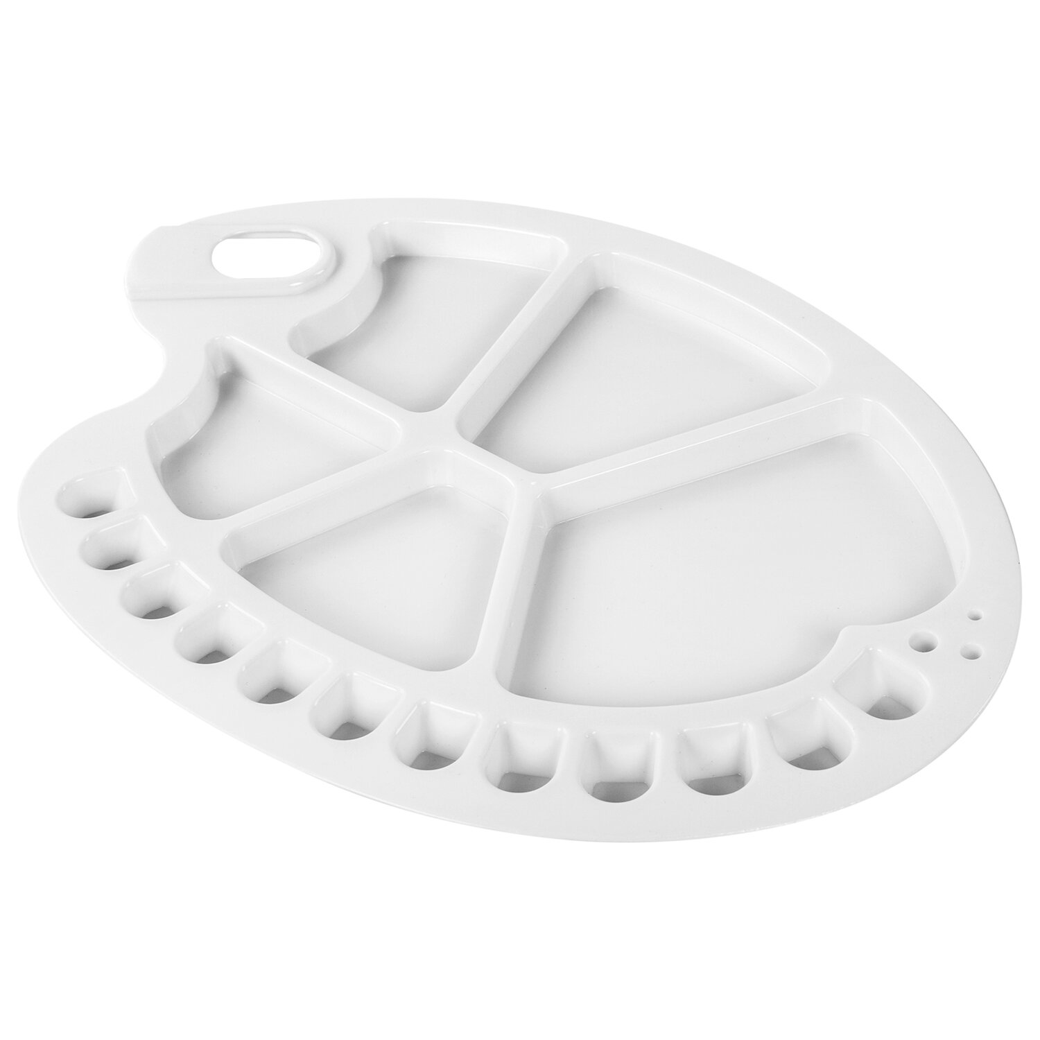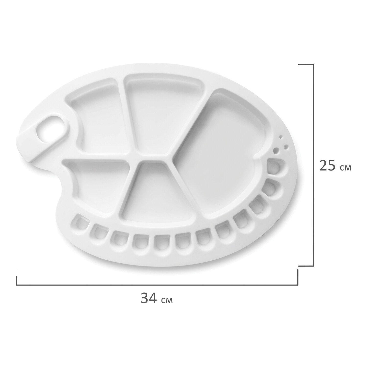 Большая и легкая пластиковая палитра подходит для работы со всеми типами художественных красок: масляными, акриловыми, темперными, гуашевыми, акварельными. Имеет 12 ячеек и 5 больших отсеков для смешивания красок. Палитру овальной формы удобно держать в руке. Размеры - 34х25 см.