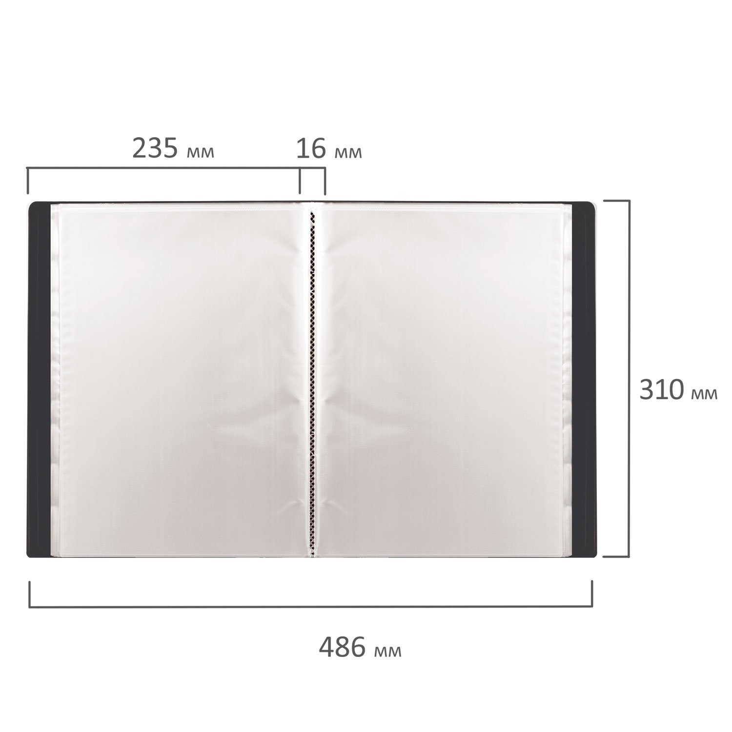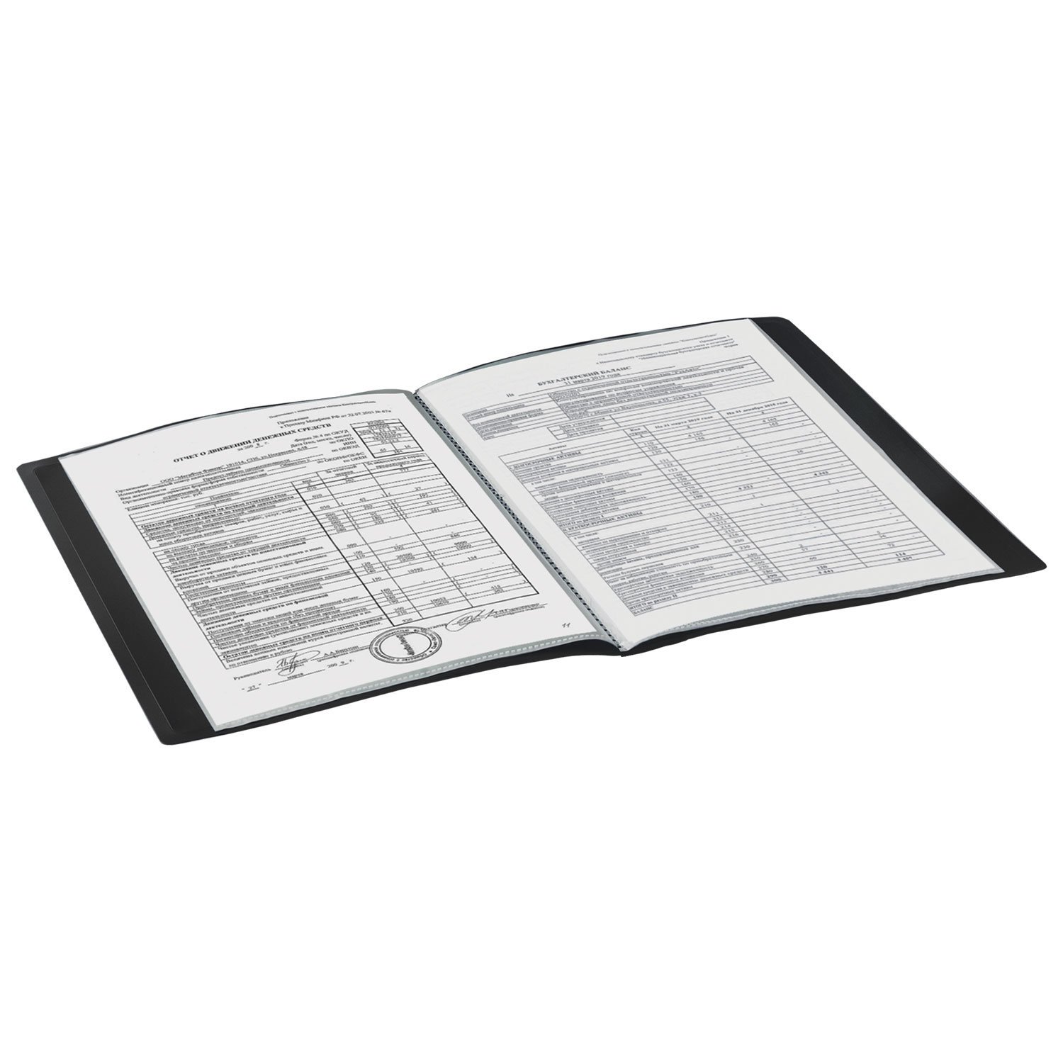 Для маркировки содержимого на корешок наклеена этикетка. Папка изготовлена из пластика толщиной 0,5 мм с антибликовой фактурой, а ширина корешка составляет 16 мм. Содержит 20 вкладышей, позволяющих хранить документы формата А4 и обеспечивающих их надежную защиту от попадания влаги, пыли и прочих повреждений.