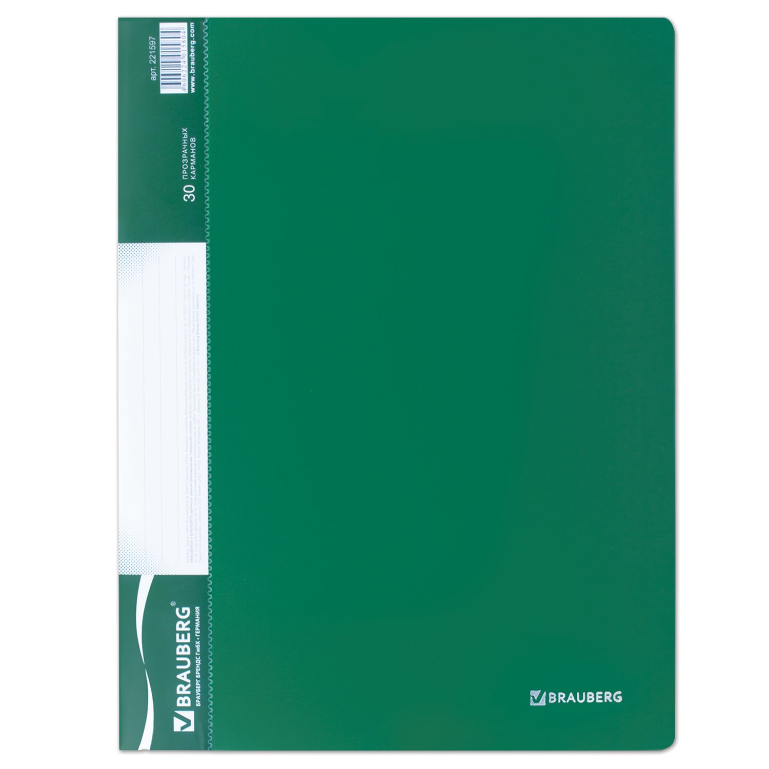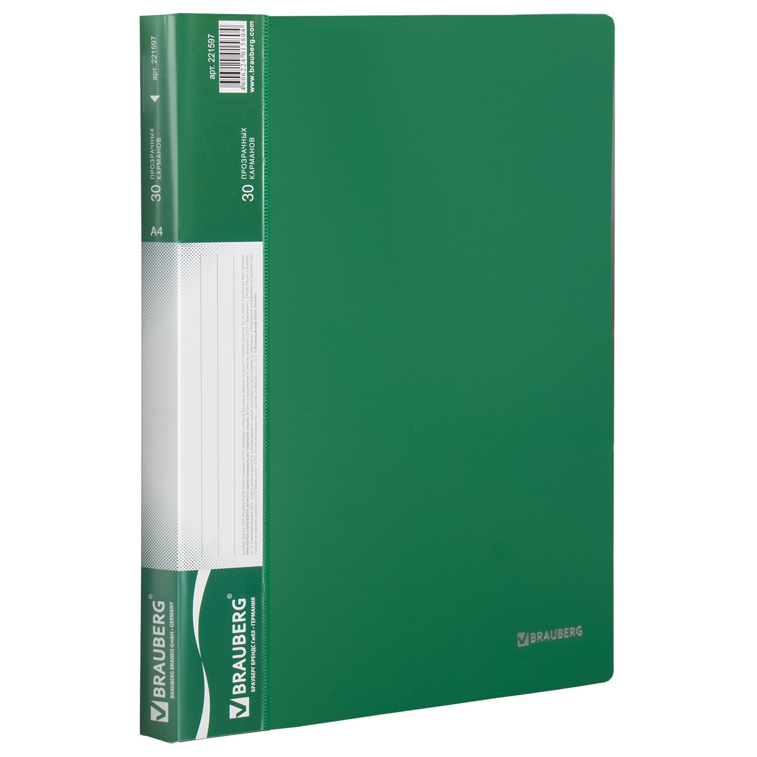Папка 30 вкладышей BRAUBERG стандарт, зеленая, 0,6 мм, 221597