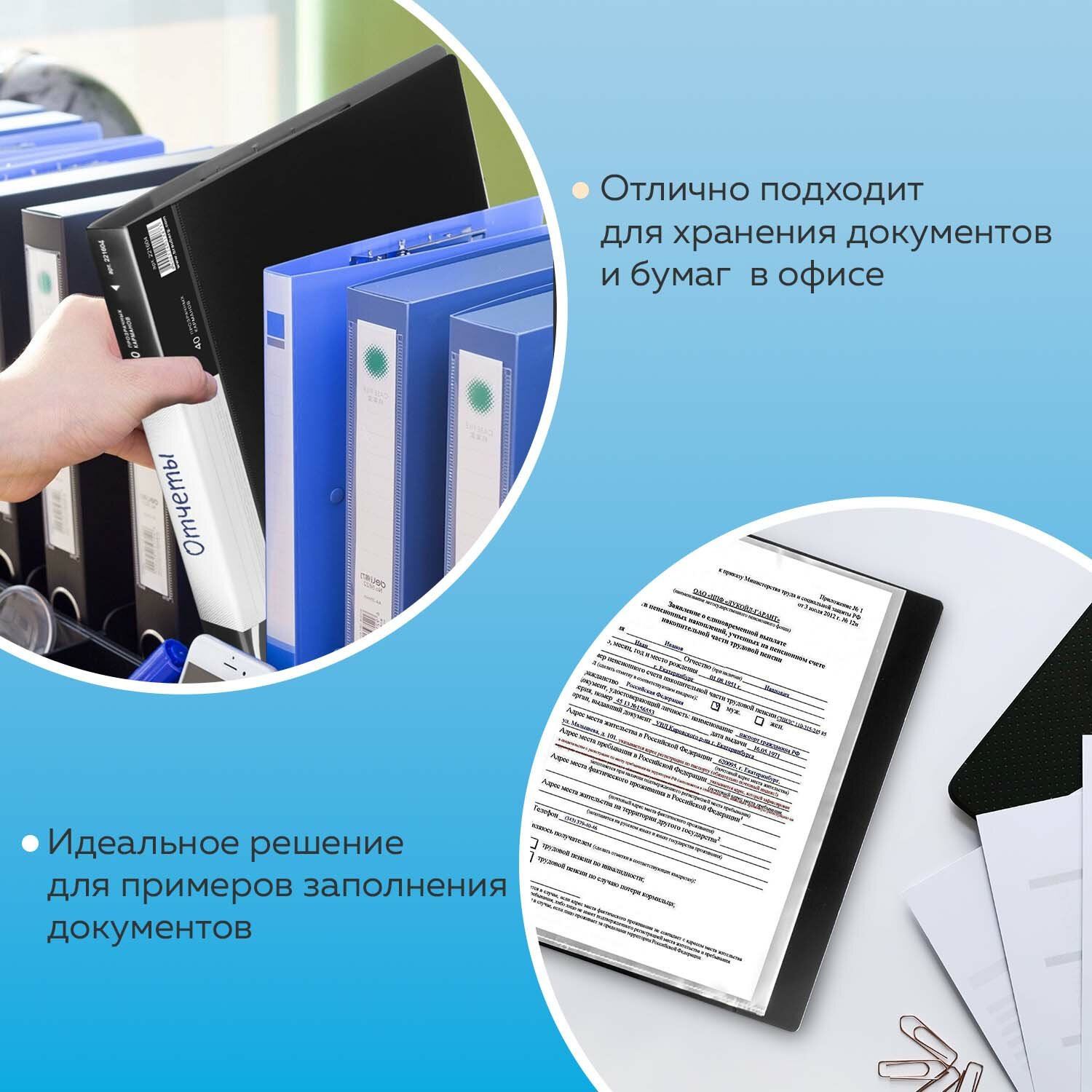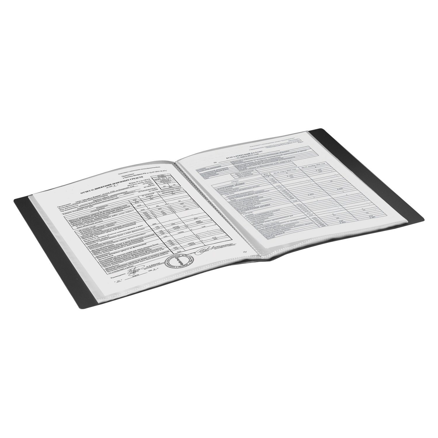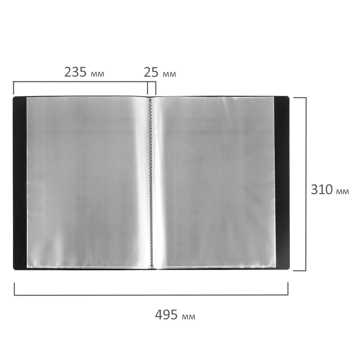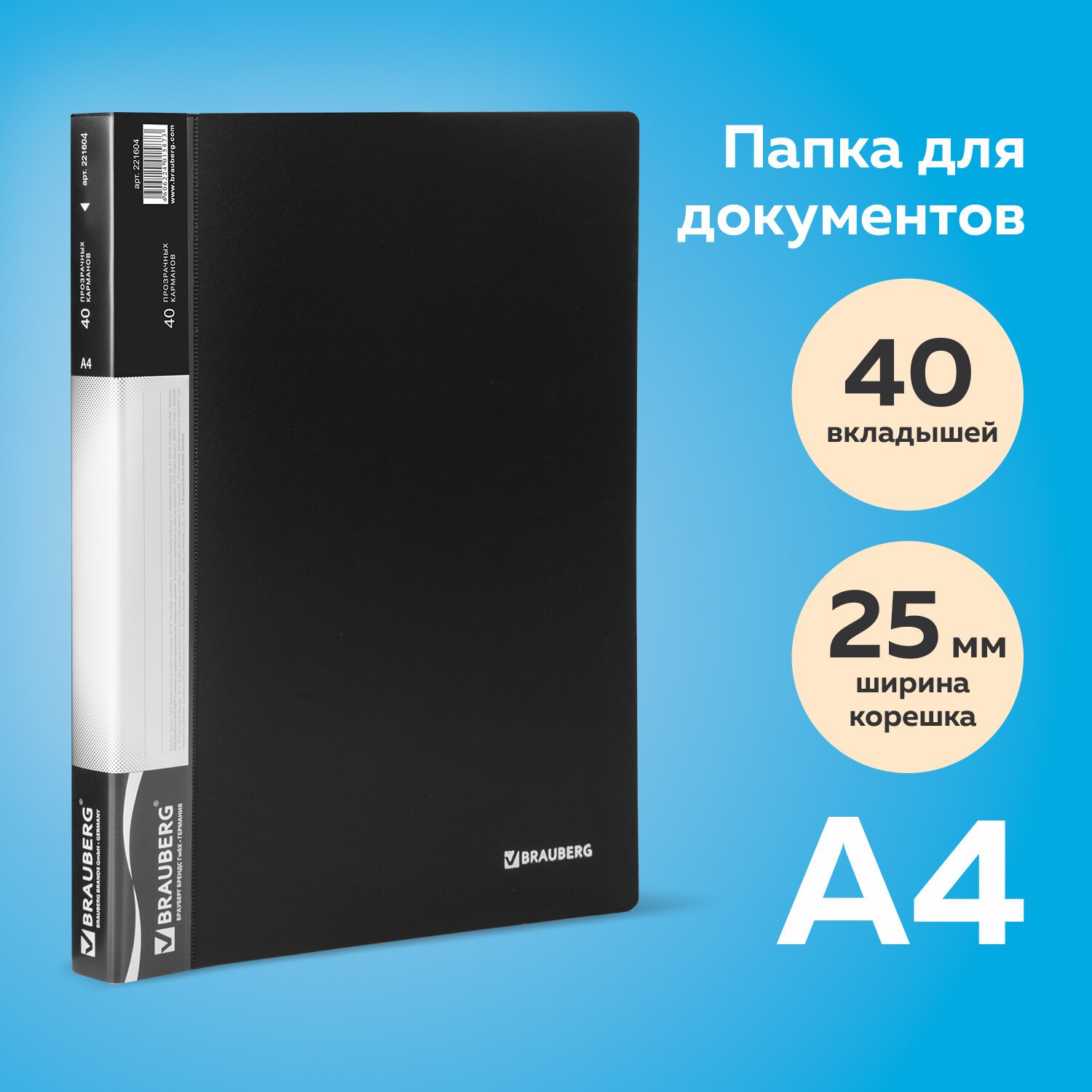 На корешке имеется карман для маркировки содержимого. Папка изготовлена из качественного пластика толщиной 0,7 мм с антибликовой фактурой, а ширина корешка составляет 25 мм. Содержит 40 вкладышей, позволяющих хранить документы формата А4 и обеспечивающих их надежную защиту от попадания влаги, пыли и прочих повреждений. Поставляется в индивидуальной упаковке.