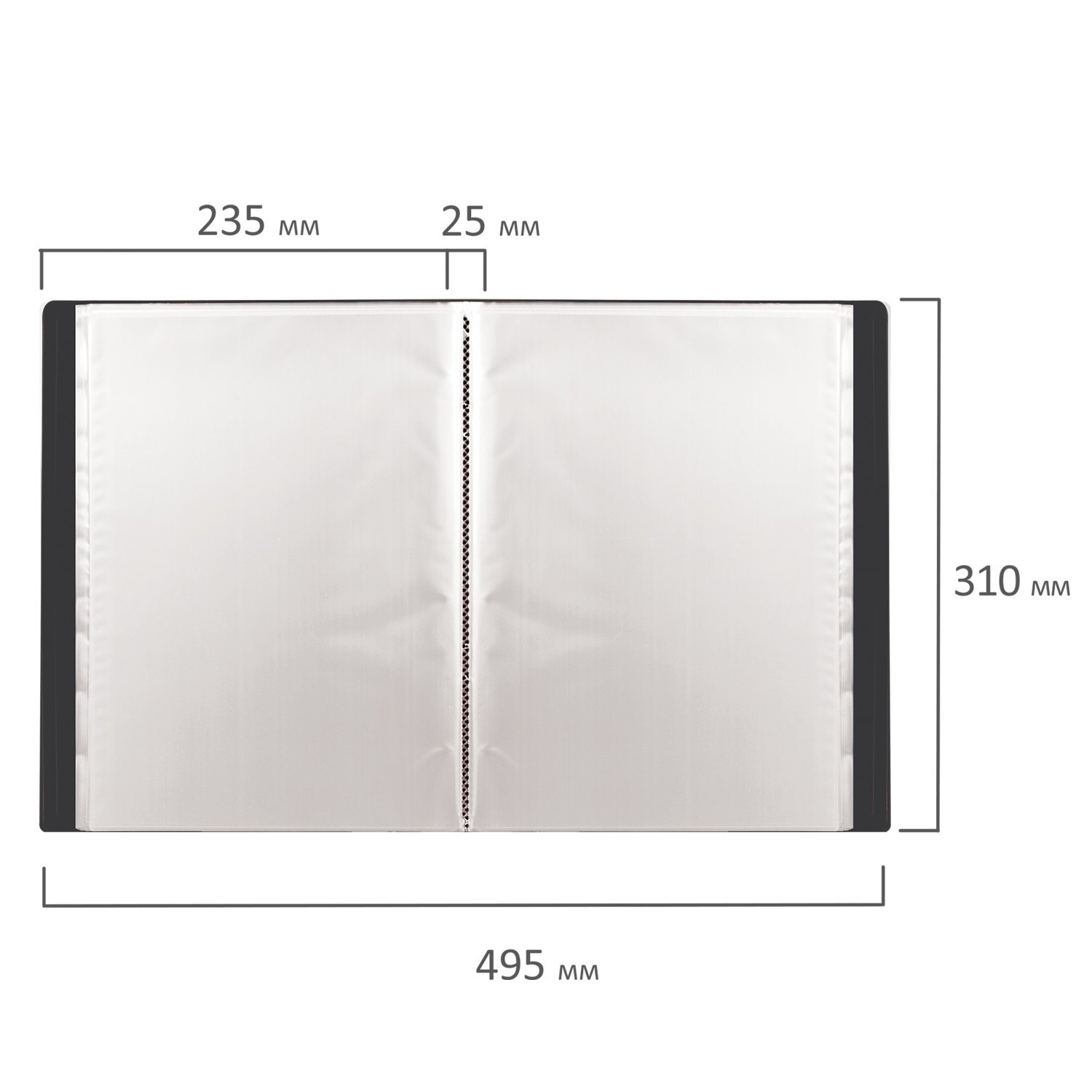 Для маркировки содержимого на корешок наклеена этикетка. Папка изготовлена из пластика толщиной 0,5 мм с антибликовой фактурой, а ширина корешка составляет 25 мм. Содержит 40 вкладышей, позволяющих хранить документы формата А4 и обеспечивающих их надежную защиту от попадания влаги, пыли и прочих повреждений.
