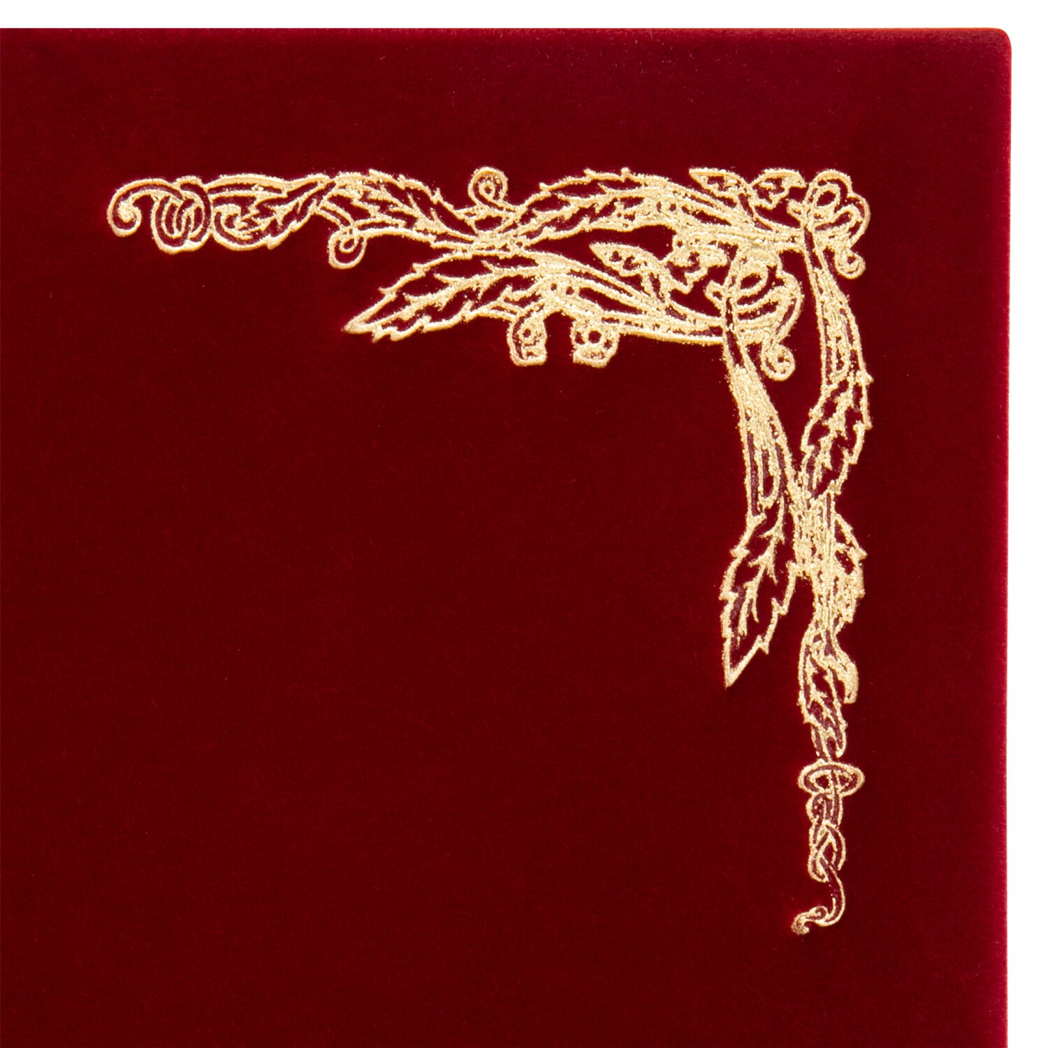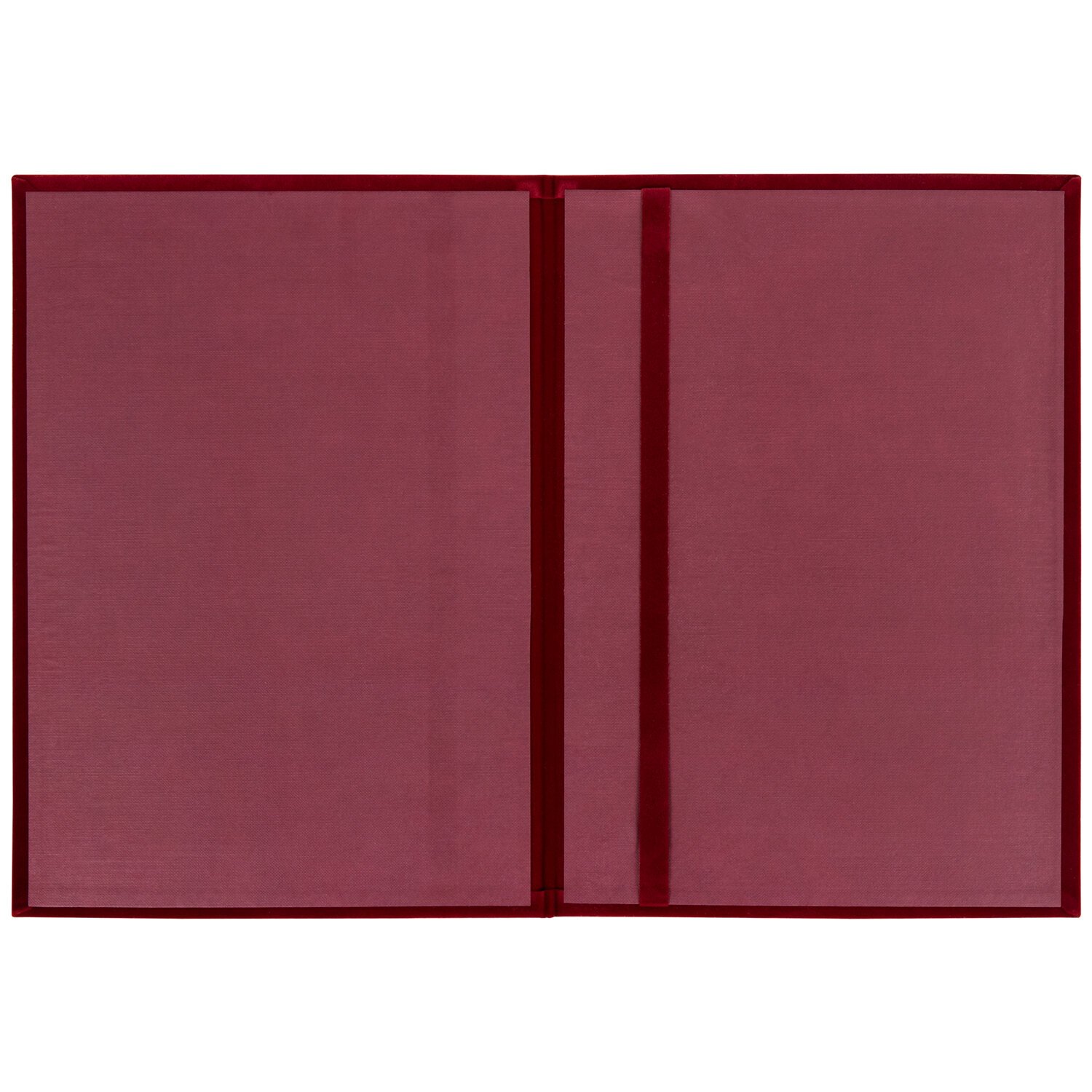 Поздравительная папка с покрытием, которое на ощупь напоминает бархатную ткань. Папка формата А4 универсального назначения выполнена в насыщенном бордовом цвете. На обложке - орнамент, нанесенный с помощью золотого тиснения. Снабжена лентой для удержания документов (ляссе). Предусмотрено нанесение логотипа.