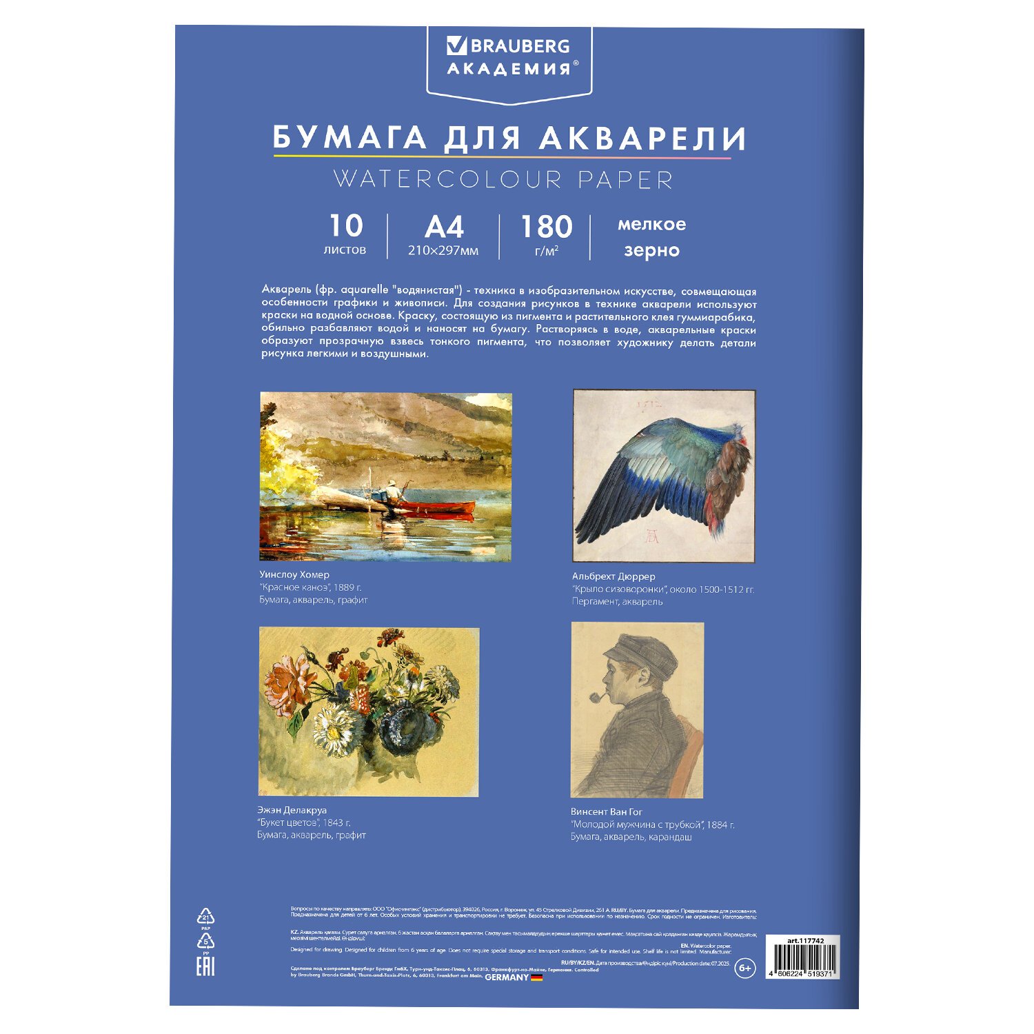 Папка для акварели содержит 10 листов формата А4 (210х297 мм). Белизна 100% Качественные листы высокой плотности 180 г/м2 устойчивы к истиранию, воздействию влаги, обеспечивают чистую реалистичную передачу цвета. Обложка выполнена из мелованного картона.