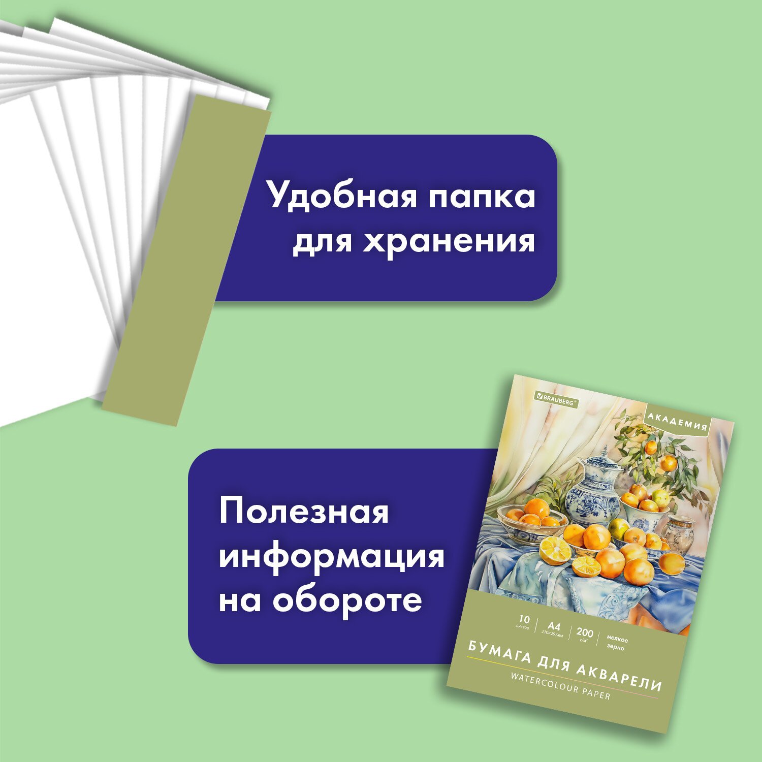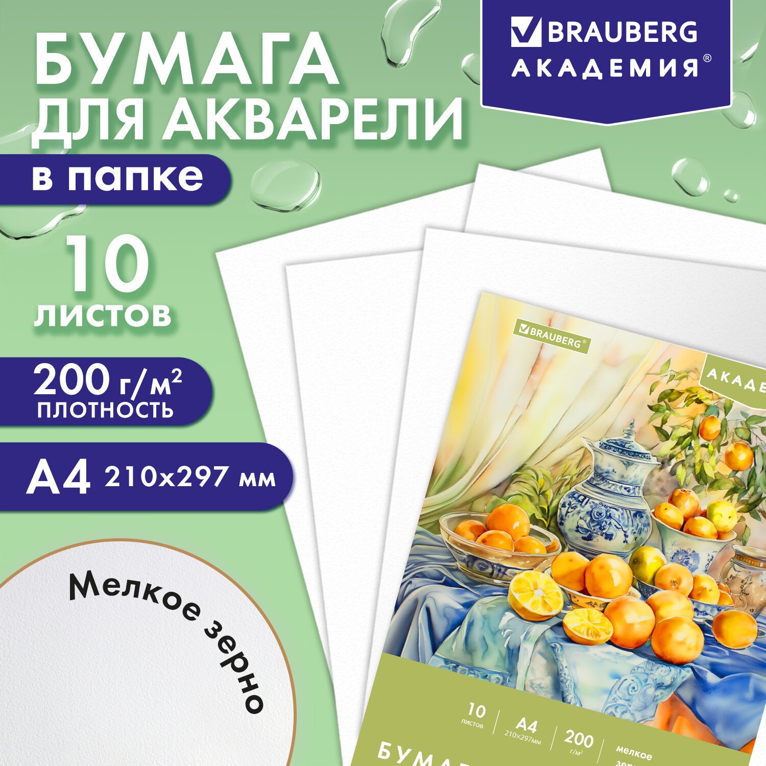 Бумага для акварели А4, 10 л., 200 г/м2, 210х297 мм, BRAUBERG, "Южное побережье", 125225