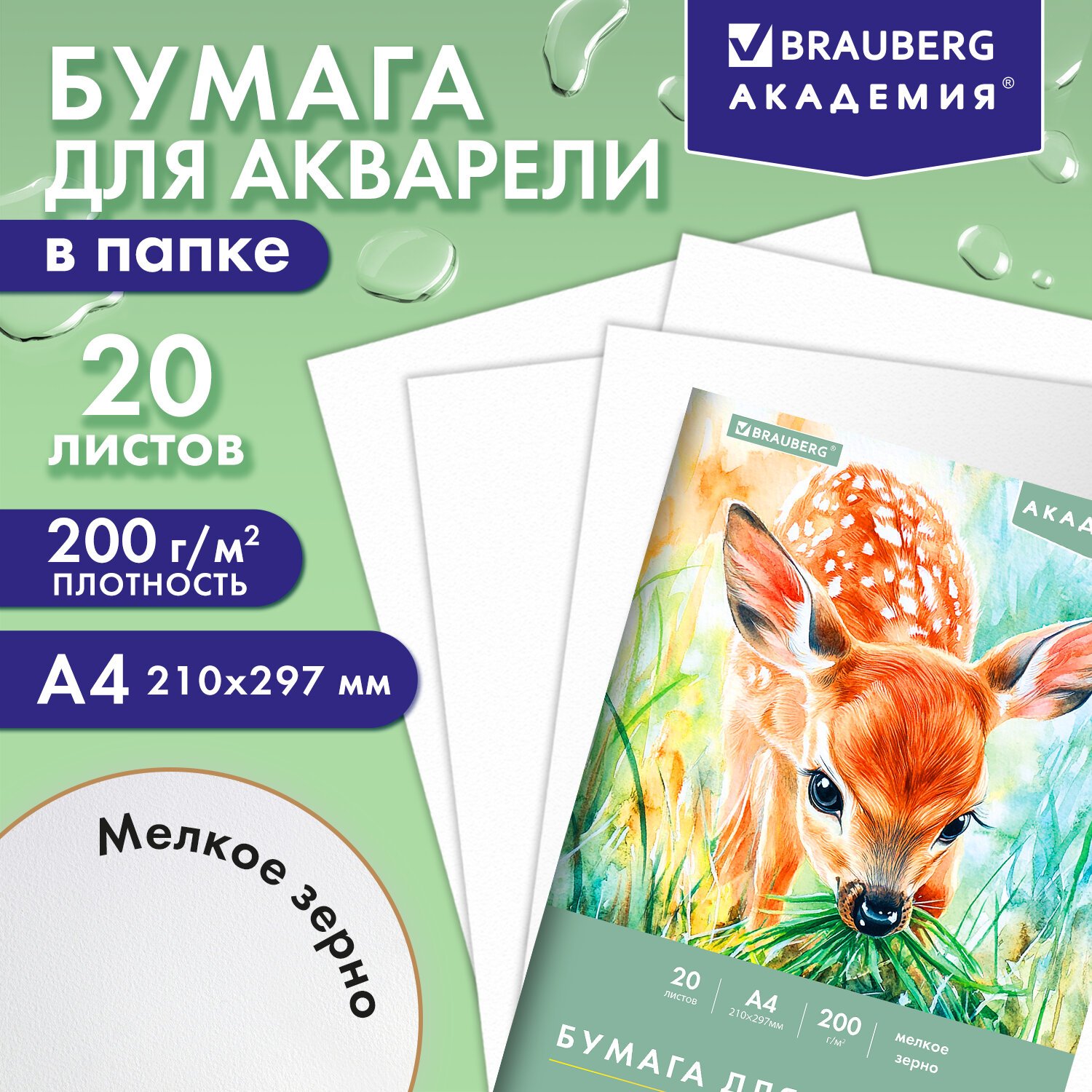Альбом для акварели А4, 20 л., среднее зерно, гребень, подложка, 200 г/м2, BRAUBERG, 195х285 мм, 126308
