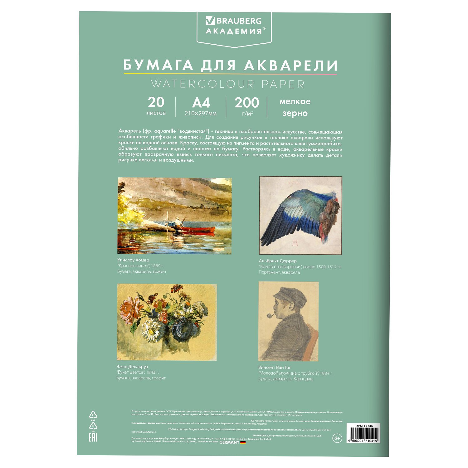 Бумага для акварели А4, 20 л., "ГАРМОНИЯ", среднее зерно, 200 г/м2, бумага ГОЗНАК, BRAUBERG ART CLASSIC, 112320